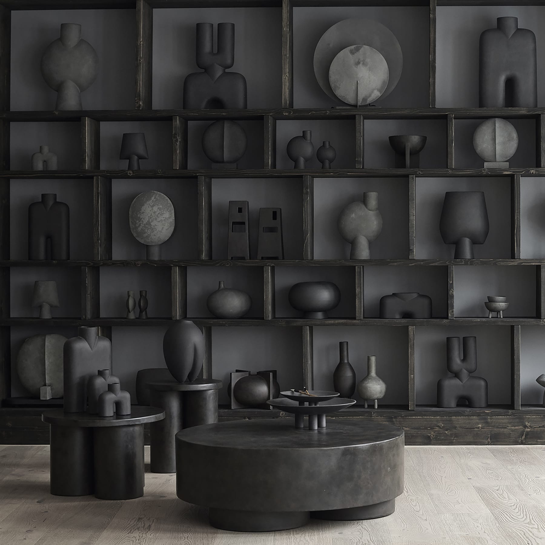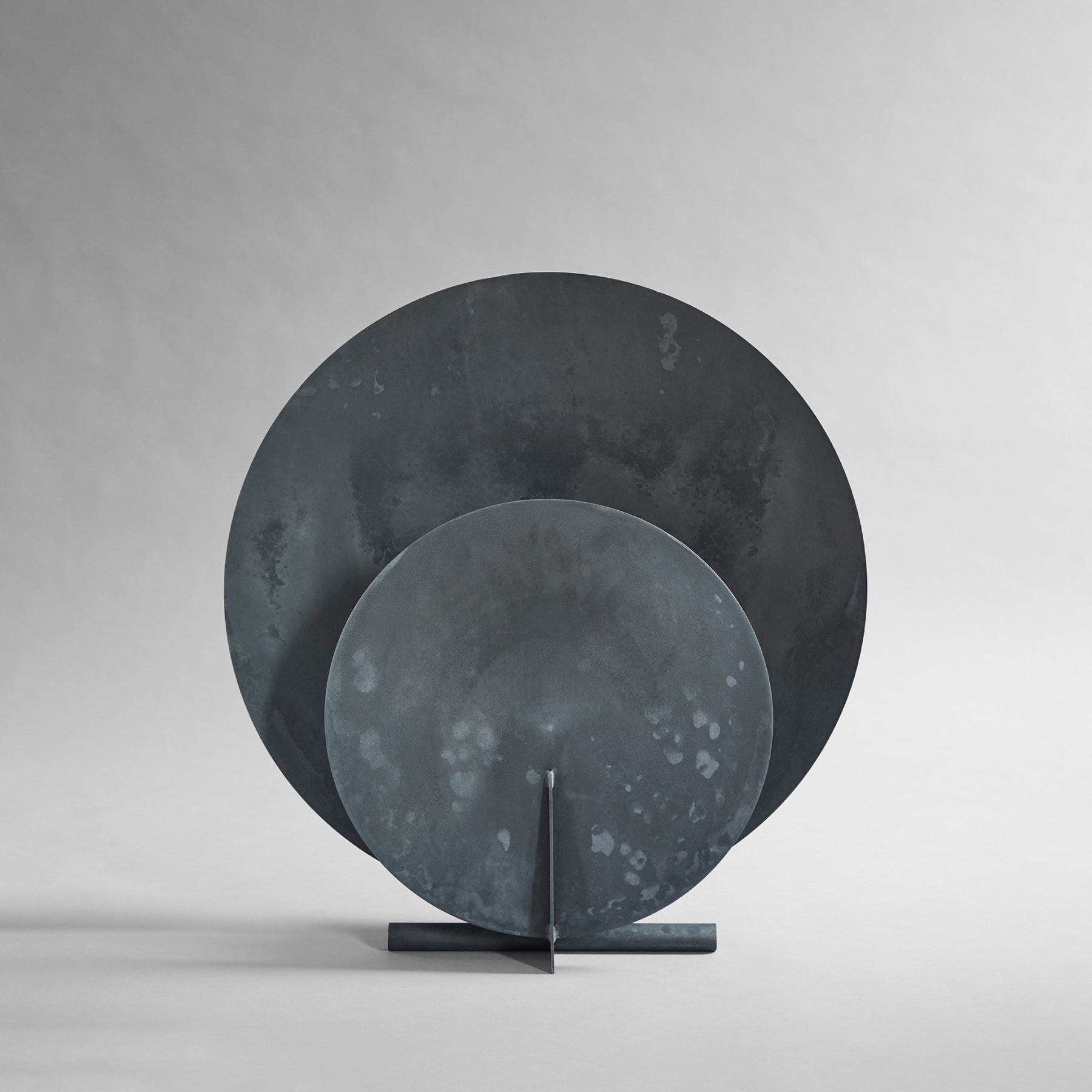 The round, geometric shape and sculptural construction of the AD Floor Lamp is influenced by the austere Brutalist movement of the mid-20th Century. The oxidized surface is textured and almost resembling concrete as a nod to the architectural source of inspiration. Thin aluminum plates comprising the plate geometry shape enclose the light source providing a smooth light scattering, the lamp is pleasant yet functional in every setting. It looks paper thin from some angles and solid from others playing with the subtle movement of light. Designed by Kristian Sofus Hansen & Tommy Hyldahl.Recommended Light Source: E27 socketView assembly guide here.