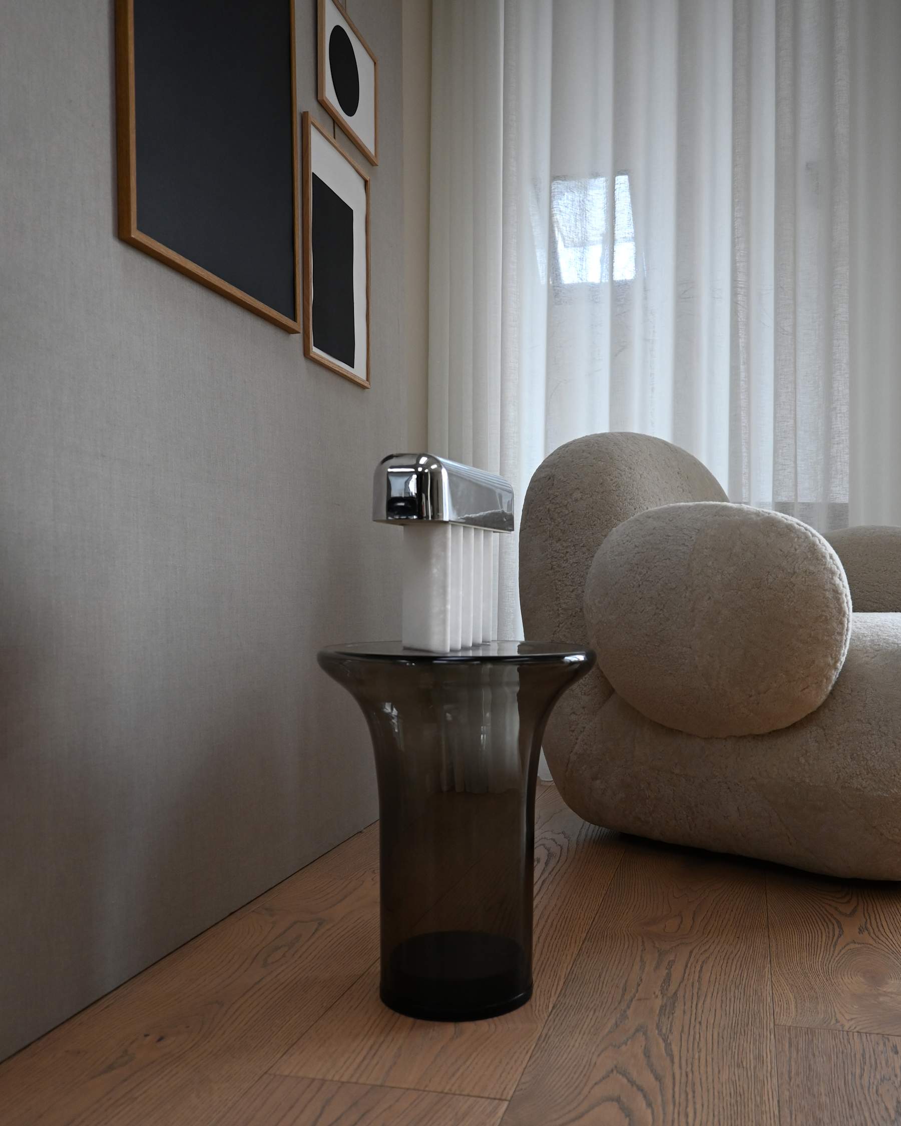 The Beetle Portable Lamp is a sculptural blend of minimalism and artful elegance, perfect for adding a cozy glow to any space. Its distinctive design features a curved metal lampshade in a mirror chrome finish, which elegantly rests atop five rectangular marble legs. Crafted from a unique crystalized marble, these legs subtly allow light to seep through, radiating a warm, ambient glow that brings a cozy atmosphere to your surroundings.Inside the lampshade, an integrated LED light with a colour temperature of 2400K gently illuminates the space beneath, enhancing Beetle’s charm. Designed with versatility in mind, Beetle is fully portable, featuring a rechargeable battery and a dimmer with three adjustable light levels, allowing you to customize the mood. Its portability makes it ideal for various spaces around the home, whether perched on a bookshelf, placed in a window, or moved to different spots to cast a cozy glow.The name Beetle draws from its structure, where the rounded, smooth lampshade rests atop the sturdy marble legs, echoing the iconic form of a beetle. This table lamp captures the essence of 80s minimalist art, delivering a clean, sculptural aesthetic that seamlessly fits in modern interiors.