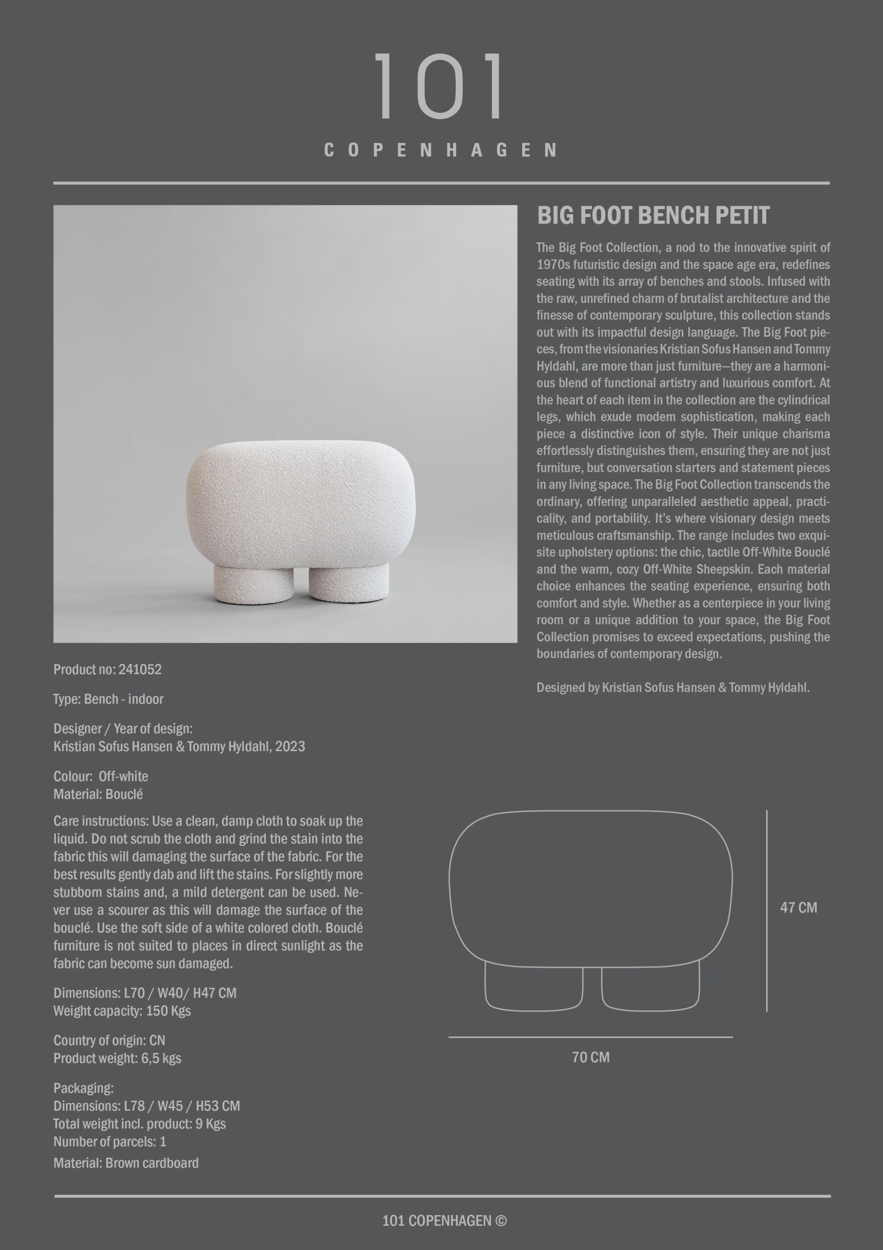 The Big Foot Collection, a nod to the innovative spirit of 1970s futuristic design and the space age era, redefines seating with its array of benches and stools. Infused with the raw, unrefined charm of brutalist architecture and the finesse of contemporary sculpture, this collection stands out with its impactful design language. The Big Foot pieces, from the visionaries Kristian Sofus Hansen and Tommy Hyldahl, are more than just furniture—they are a harmonious blend of functional artistry and luxurious comfort. At the heart of each item in the collection are the cylindrical legs, which exude modern sophistication, making each piece a distinctive icon of style. Their unique charisma effortlessly distinguishes them, ensuring they are not just furniture, but conversation starters and statement pieces in any living space. The range includes two exquisite upholstery options: the chic, tactile Off-White Bouclé and the warm, cozy Off-White Sheepskin. Each material choice enhances the seating experience, ensuring both comfort and style. Whether as a centerpiece in your living room or a unique addition to your space, the Big Foot Collection promises to exceed expectations, pushing the boundaries of contemporary design.Designed by Kristian Sofus Hansen & Tommy Hyldahl.