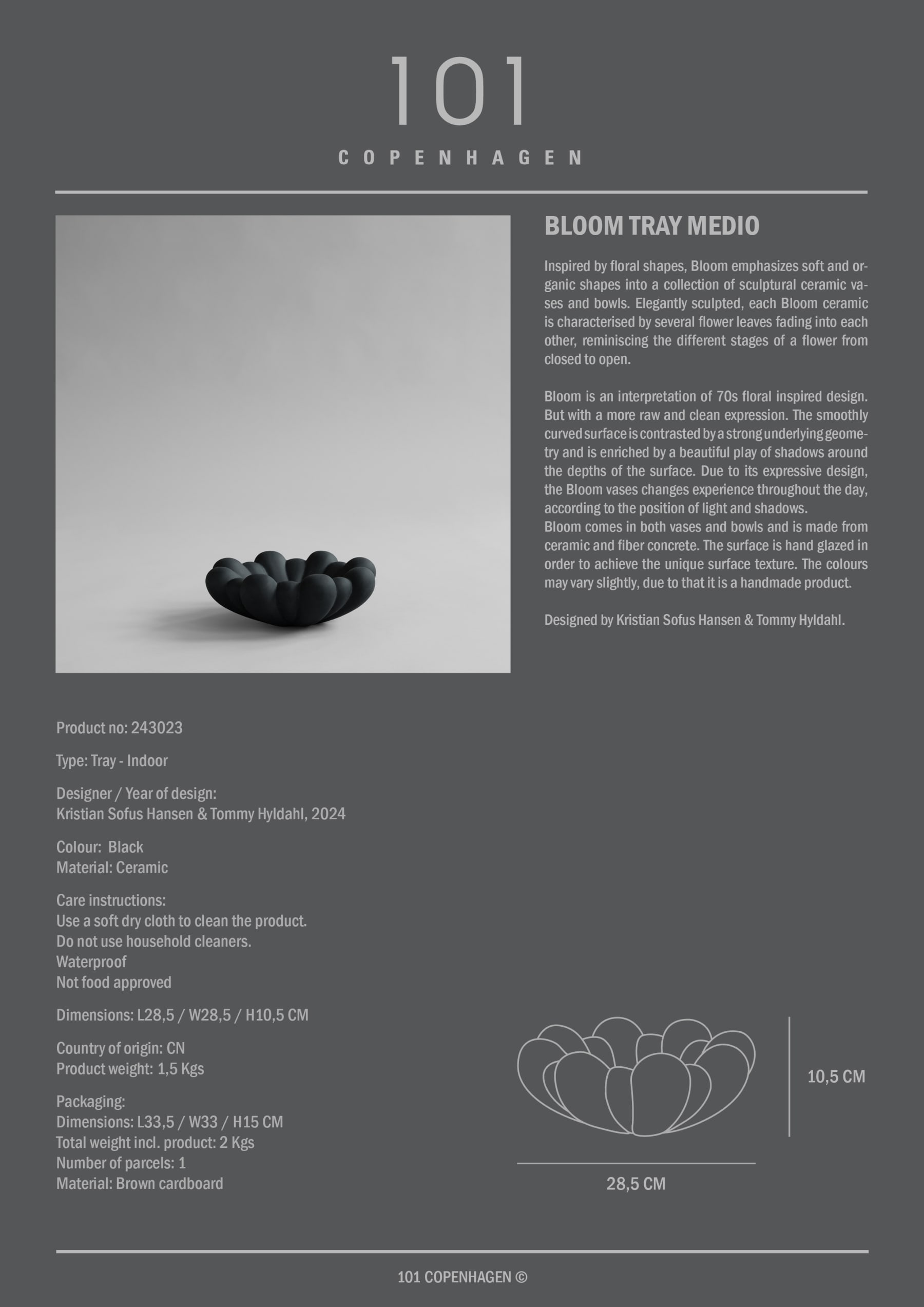 Inspired by floral shapes, Bloom emphasizes soft and organic shapes into a collection of sculptural ceramic vases and trays. Elegantly sculpted, each Bloom ceramic is characterized by several flower leaves fading into each other, reminiscing the different stages of a flower from closed to open. Bloom is an interpretation of 70s floral inspired design. But with a more raw and clean expression. The smoothly curved surface is contrasted by a strong underlying geometry and is enriched by a beautiful play of shadows around the depths of the surface. Due to its expressive design, the Bloom vases changes experience throughout the day, according to the position of light and shadows. Bloom comes in both vases and trays and is made from ceramic and fiber concrete. The surface is hand glazed in order to achieve the unique surface texture. The colours may vary slightly, due to that it is a handmade product.Designed by Kristian Sofus Hansen & Tommy Hyldahl.