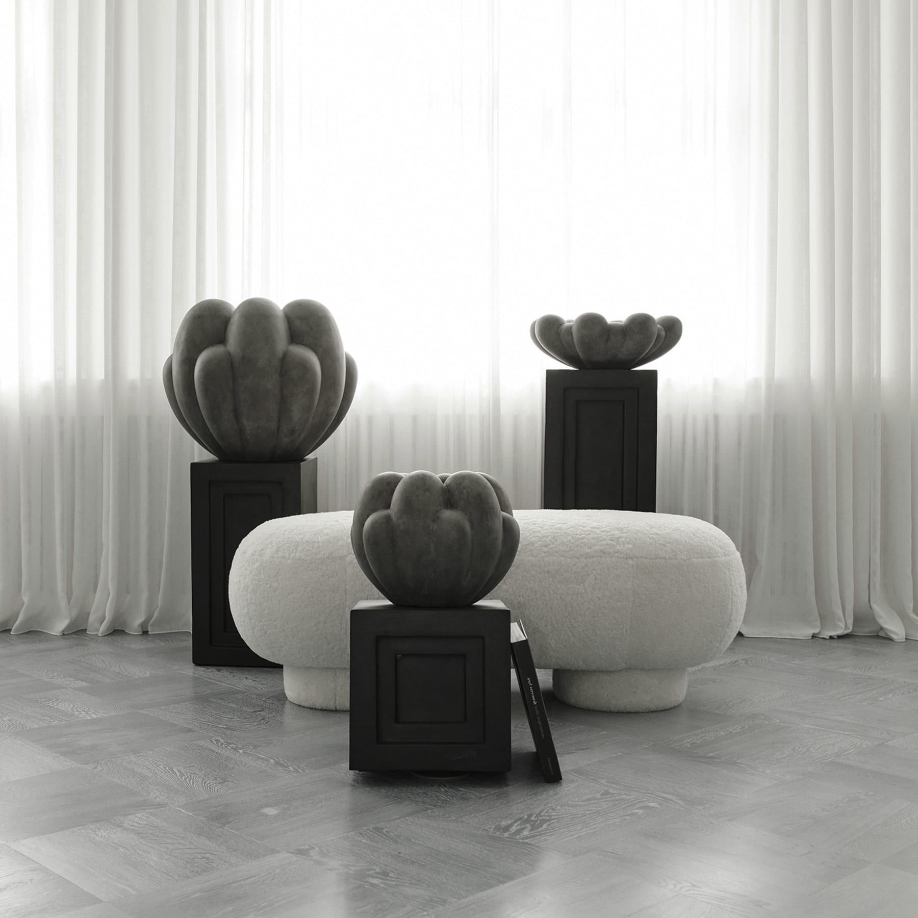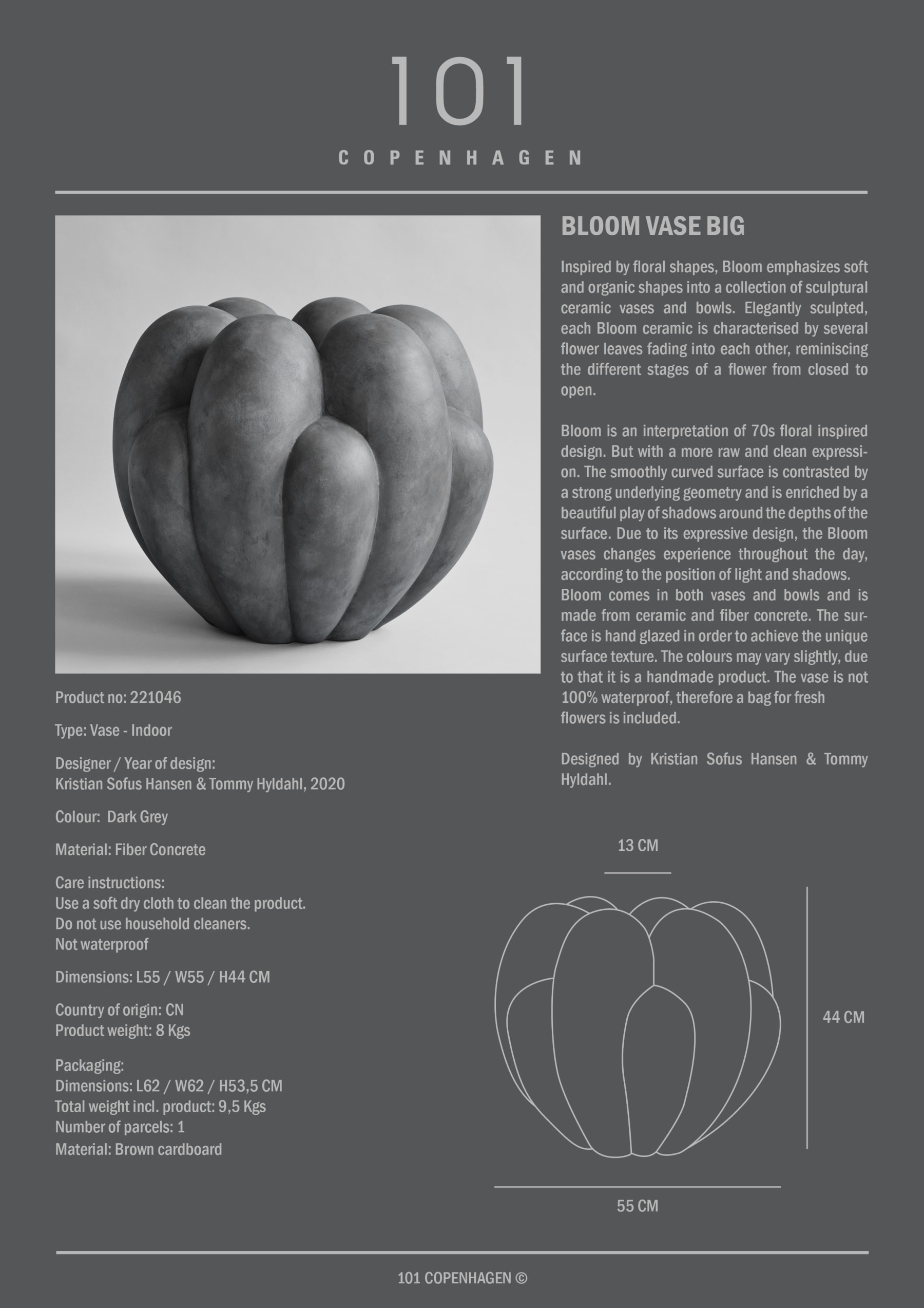 Inspired by floral shapes, Bloom emphasizes soft and organic shapes into a collection of sculptural ceramic vases and trays. Elegantly sculpted, each Bloom ceramic is characterized by several flower leaves fading into each other, reminiscing the different stages of a flower from closed to open. Bloom is an interpretation of 70s floral inspired design. But with a more raw and clean expression. The smoothly curved surface is contrasted by a strong underlying geometry and is enriched by a beautiful play of shadows around the depths of the surface. Due to its expressive design, the Bloom vases changes experience throughout the day, according to the position of light and shadows. Bloom comes in both vases and trays and is made from ceramic and fiber concrete. The surface is hand glazed in order to achieve the unique surface texture. The colours may vary slightly, due to that it is a handmade product. The vase is not 100% waterproof, therefore a bag for fresh flowers is included. Designed by Kristian Sofus Hansen & Tommy Hyldahl.