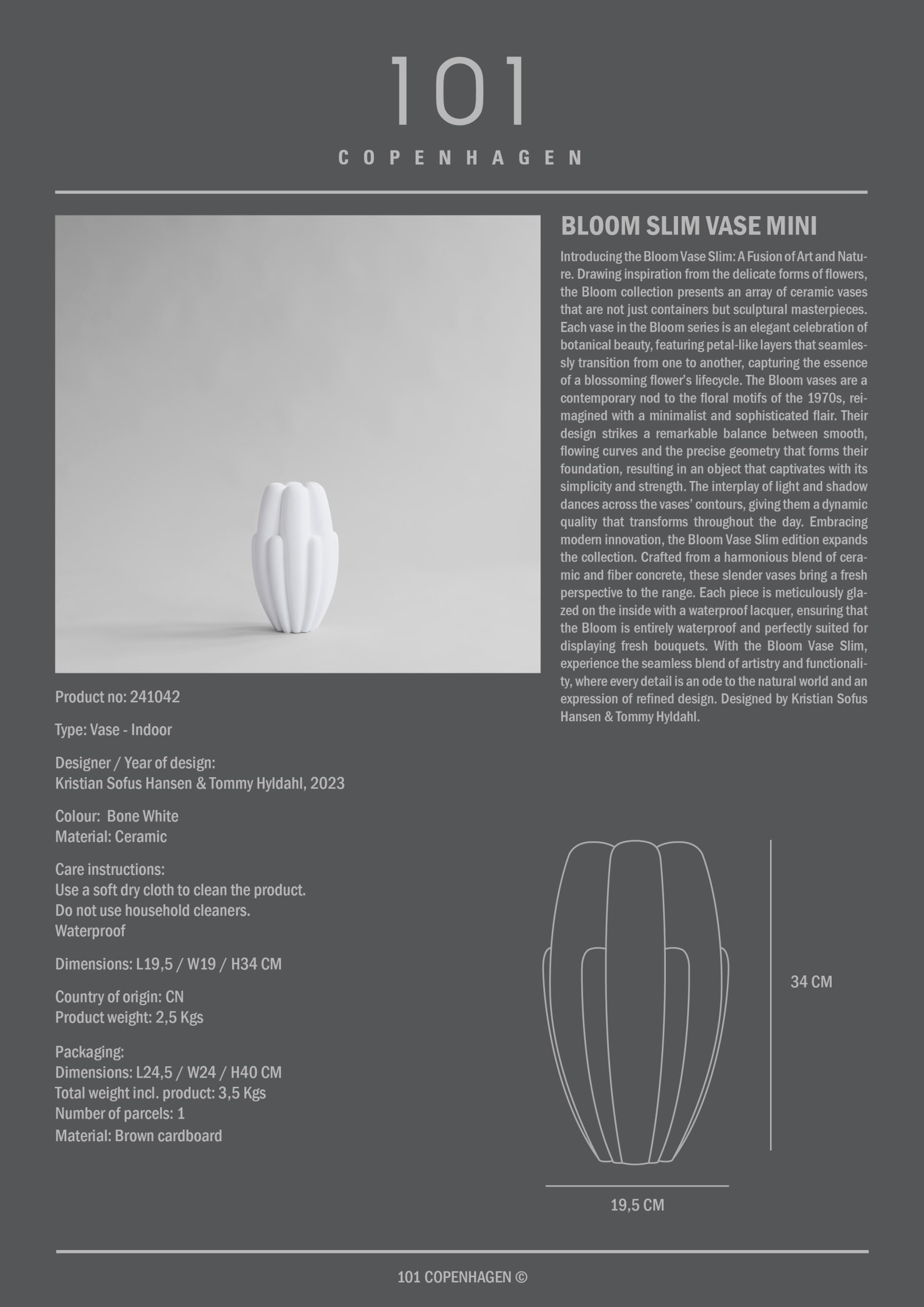 Introducing the Bloom Vase Slim: A Fusion of Art and Nature. Drawing inspiration from the delicate forms of flowers, the Bloom collection presents an array of ceramic vases that are not just containers but sculptural masterpieces. Each vase in the Bloom series is an elegant celebration of botanical beauty, featuring petal-like layers that seamlessly transition from one to another, capturing the essence of a blossoming flower’s lifecycle. The Bloom vases are a contemporary nod to the floral motifs of the 1970s, reimagined with a minimalist and sophisticated flair. The interplay of light and shadow dances across the vases’ contours, giving them a dynamic quality that transforms throughout the day.Embracing modern innovation, the Bloom Vase Slim edition expands the collection. Crafted from a harmonious blend of ceramic and fiber concrete, these slender vases bring a fresh perspective to the range. Each piece is meticulously glazed on the inside with a waterproof lacquer, ensuring that the Bloom is entirely waterproof and perfectly suited for displaying fresh bouquets. The exterior of each vase boasts a hand-glazed finish, contributing to a distinctive surface texture that makes every piece unique. The nuanced shades of the vases are a testament to their handcrafted nature, with slight variations in color that enhance their individuality.Designed by Kristian Sofus Hansen & Tommy Hyldahl.