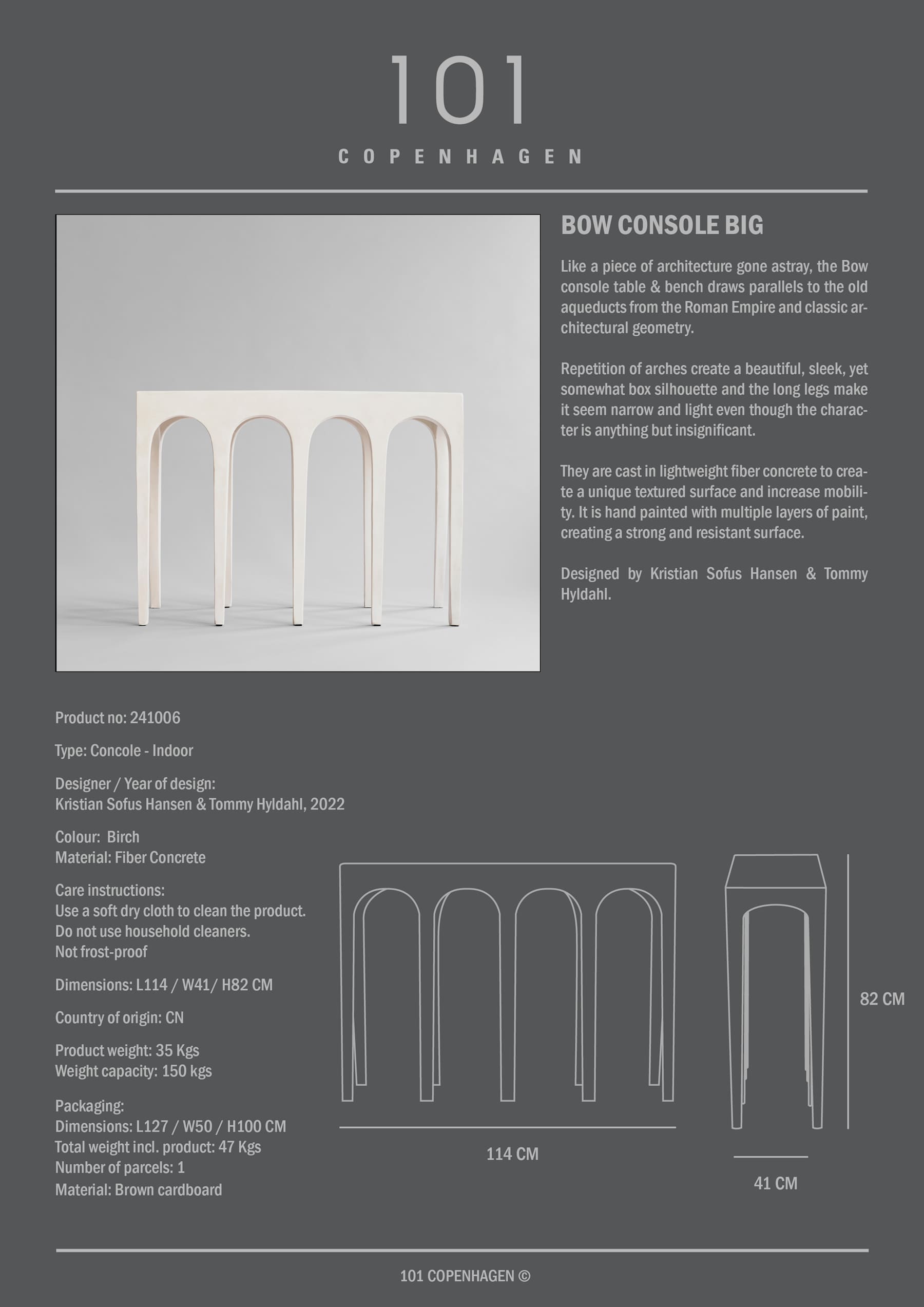 The Bow series stands as a testament to timeless design, reminiscent of the architectural grandeur of the ancient Roman aqueducts and classic geometrical precision. With its sequence of arches, this collection offers a sleek and sophisticated silhouette that is both understated and commanding. The elongated legs lend an air of elegance and lightness, defying the substantial presence of these pieces. Crafted from lightweight fiber concrete, the Bow series not only showcases a distinctively textured surface but also boasts enhanced portability. Each piece is meticulously hand-painted with multiple layers, ensuring a durable and resilient finish that is built to last. This collection comprises two sizes of console tables along with a bench, offering versatile options that seamlessly blend with any interior space. Conceived by the visionary minds of Kristian Sofus Hansen & Tommy Hyldahl, the Bow series is a harmonious blend of form and function, solidifying its status as a striking addition to contemporary design. Designed by Kristian Sofus Hansen & Tommy Hyldahl.