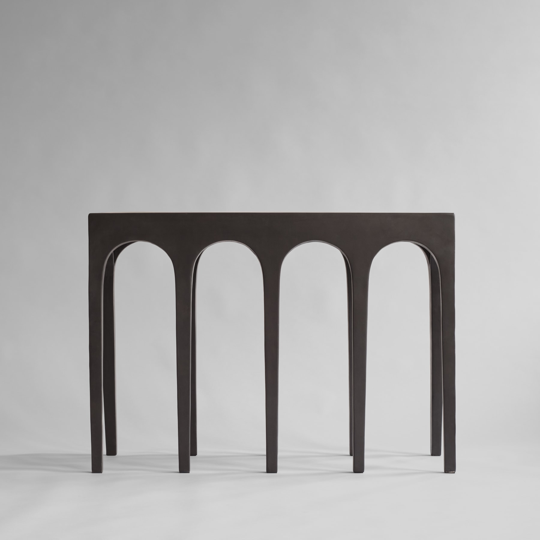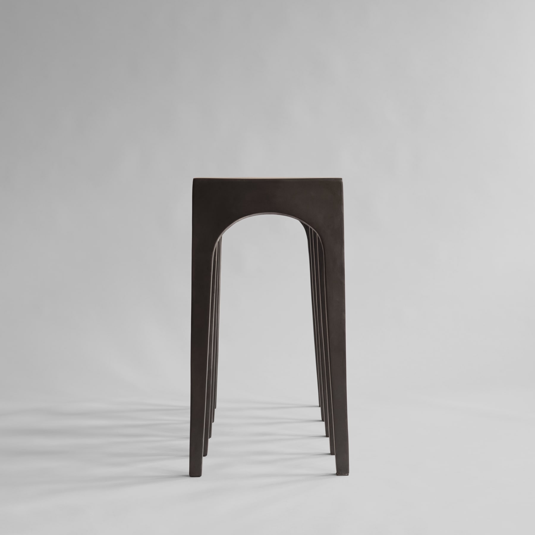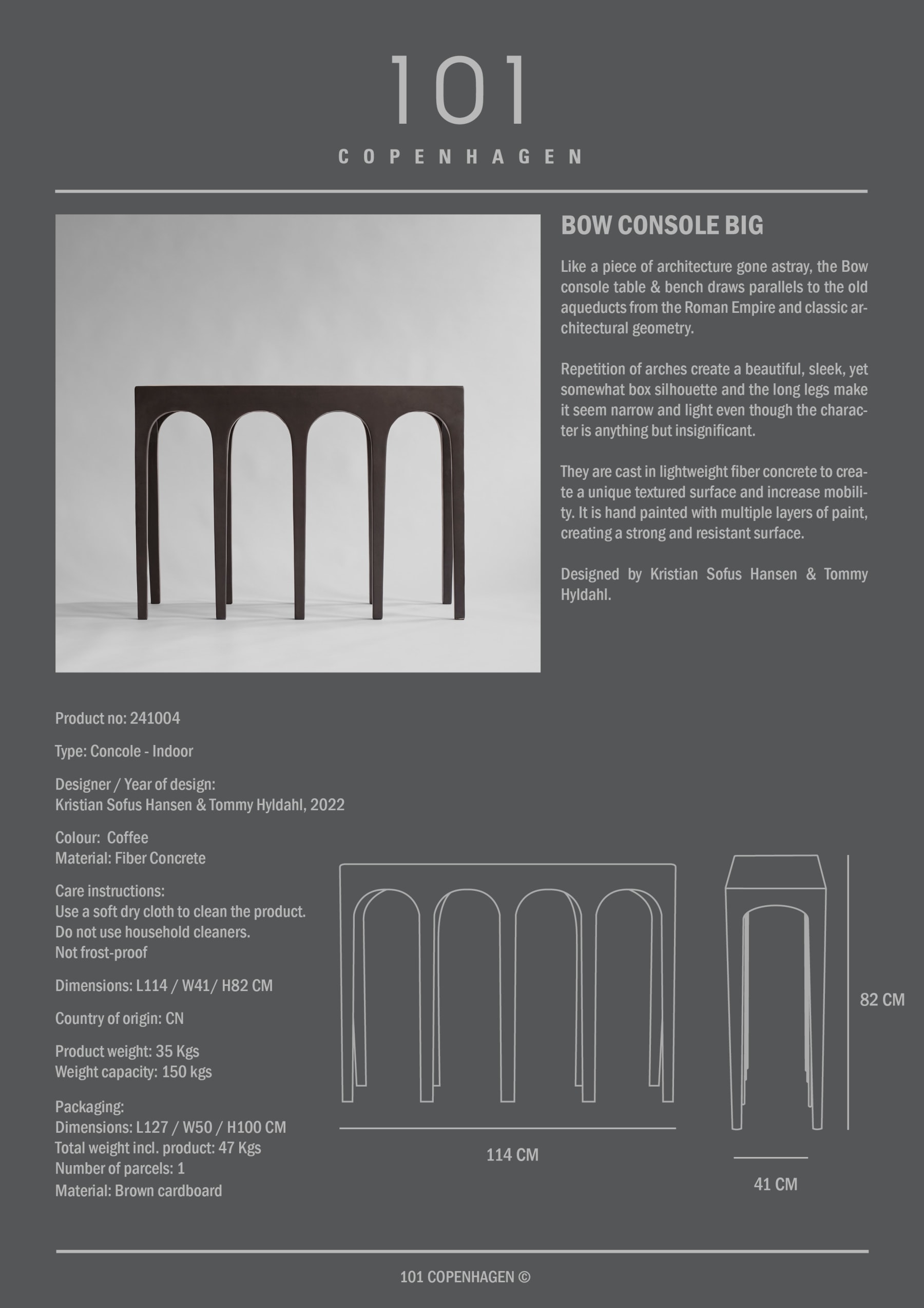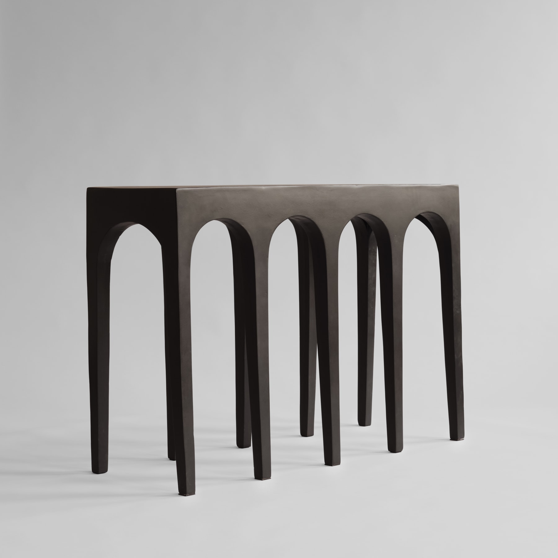 The Bow series stands as a testament to timeless design, reminiscent of the architectural grandeur of the ancient Roman aqueducts and classic geometrical precision. With its sequence of arches, this collection offers a sleek and sophisticated silhouette that is both understated and commanding. The elongated legs lend an air of elegance and lightness, defying the substantial presence of these pieces. Crafted from lightweight fiber concrete, the Bow series not only showcases a distinctively textured surface but also boasts enhanced portability. Each piece is meticulously hand-painted with multiple layers, ensuring a durable and resilient finish that is built to last. This collection comprises two sizes of console tables along with a bench, offering versatile options that seamlessly blend with any interior space. Conceived by the visionary minds of Kristian Sofus Hansen & Tommy Hyldahl, the Bow series is a harmonious blend of form and function, solidifying its status as a striking addition to contemporary design.Designed by Kristian Sofus Hansen & Tommy Hyldahl.