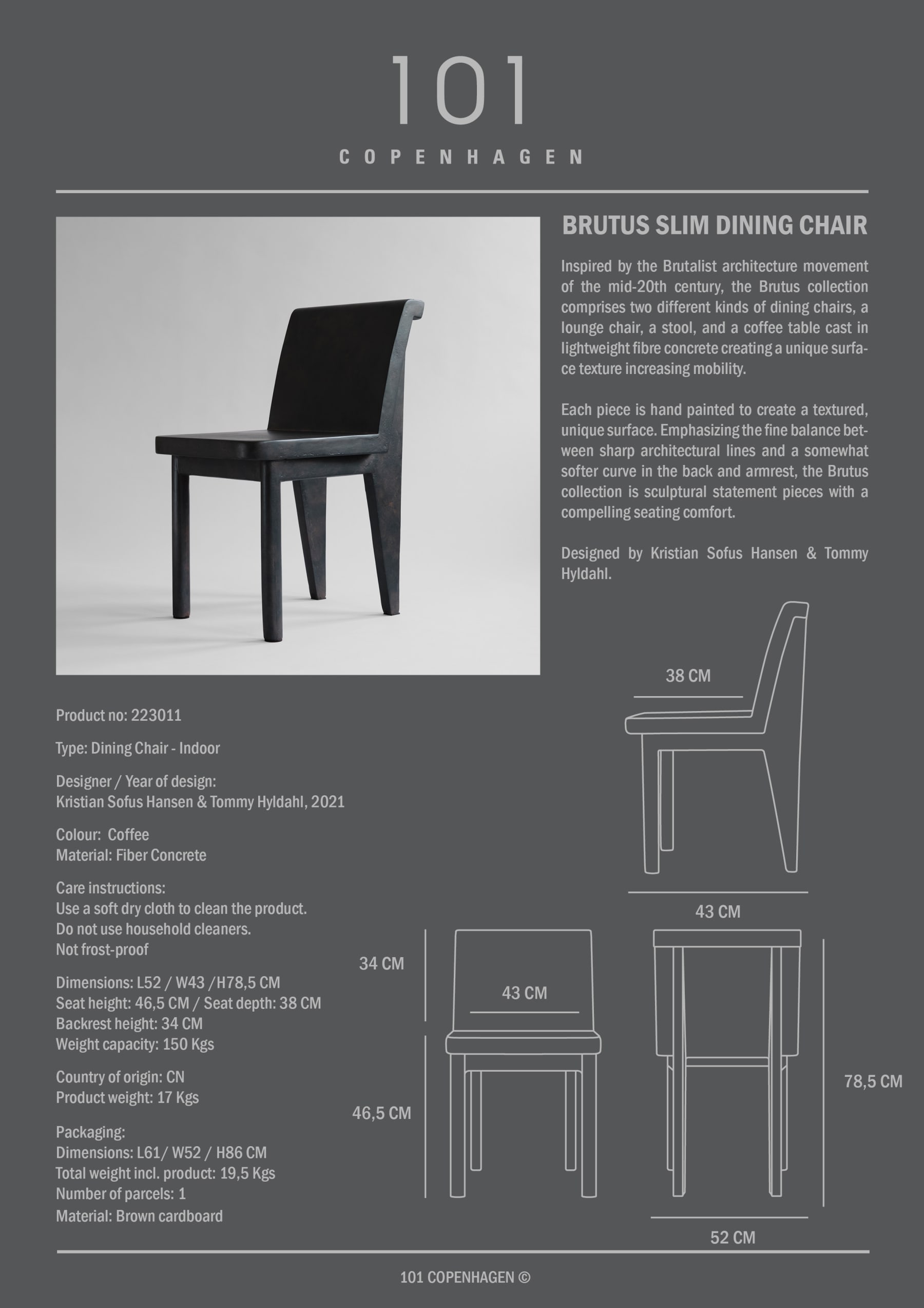Inspired by the Brutalist architecture movement of the mid-20th century, the Brutus collection comprises two different kinds of dining chairs, a lounge chair, a stool, and a coffee table cast in lightweight fiber concrete creating a unique surface texture increasing mobility. Each piece is hand painted to create a textured, unique surface. Emphasizing the fine balance between sharp architectural lines and a somewhat softer curve in the back and armrest, the Brutus collection is sculptural statement pieces with a compelling seating comfort. Designed by Kristian Sofus Hansen & Tommy Hyldahl.For indoor use.