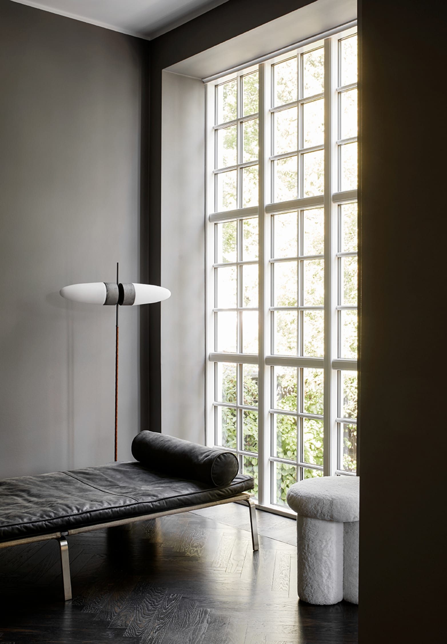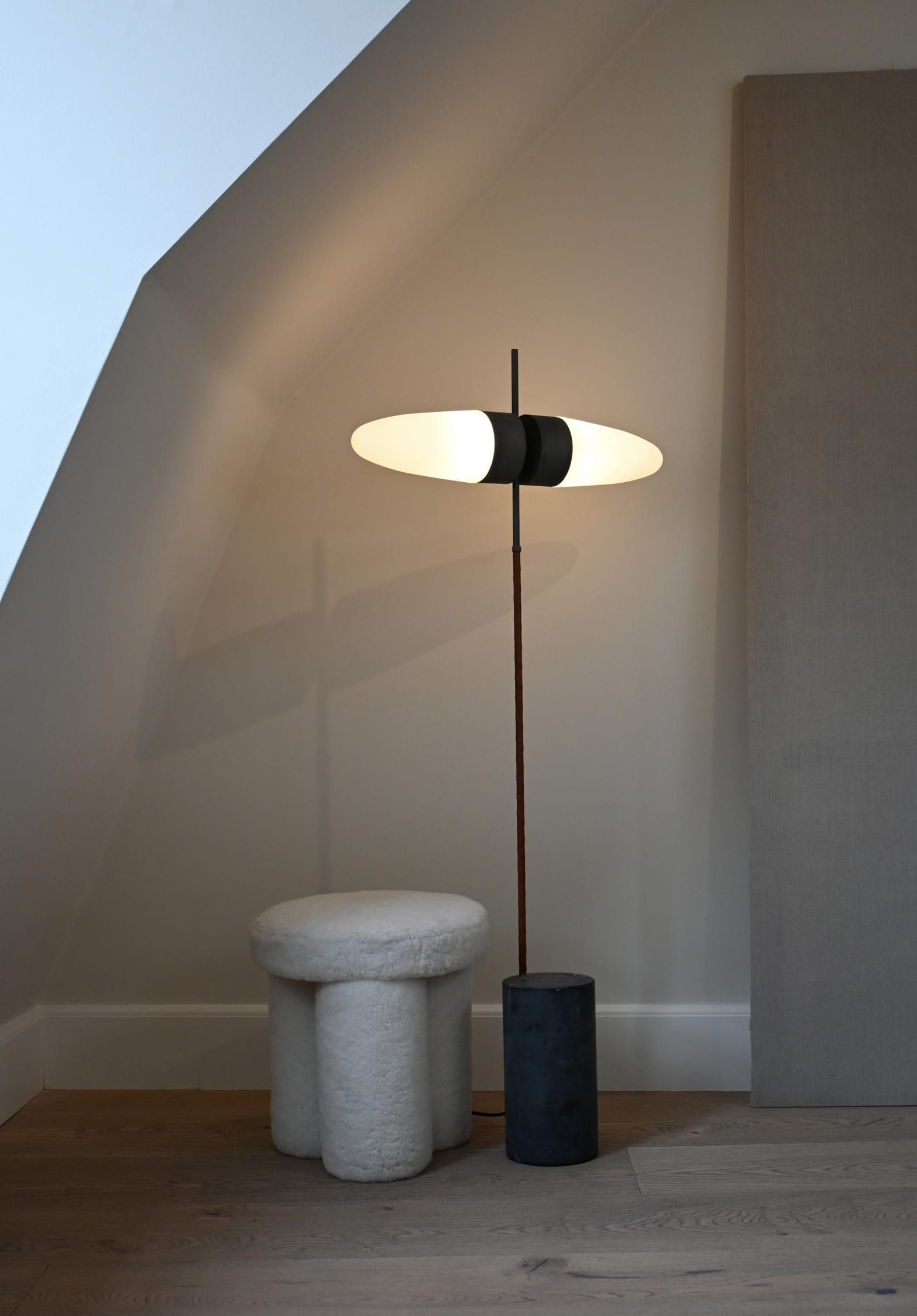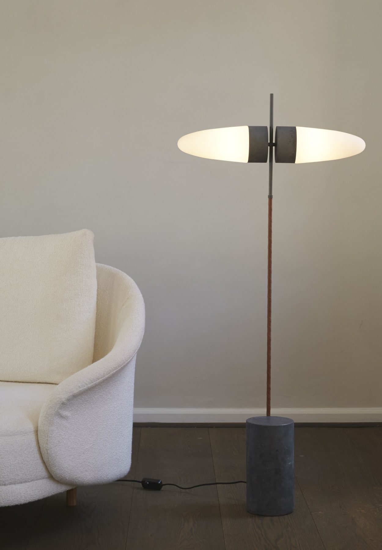 Inspired by the characteristic use of animal pictures in Danish Modernism from the 1940s to 1960s, the Bull lamp takes its name after the bull-like lampshades of opal glass, providing a smooth light scattering and a characteristic expression. The body consists of an unpolished grey marble base with a lamp arm in oxidized aluminum covered in spun cognac coloured leather, and an upper part in oxidized aluminum that stands in beautiful contrast to the light, translucent glass. This subtle interaction of materials makes the Bull lamp much more than merely a source of light. Designed by Kristian Sofus Hansen & Tommy Hyldahl.View assembly guide here.