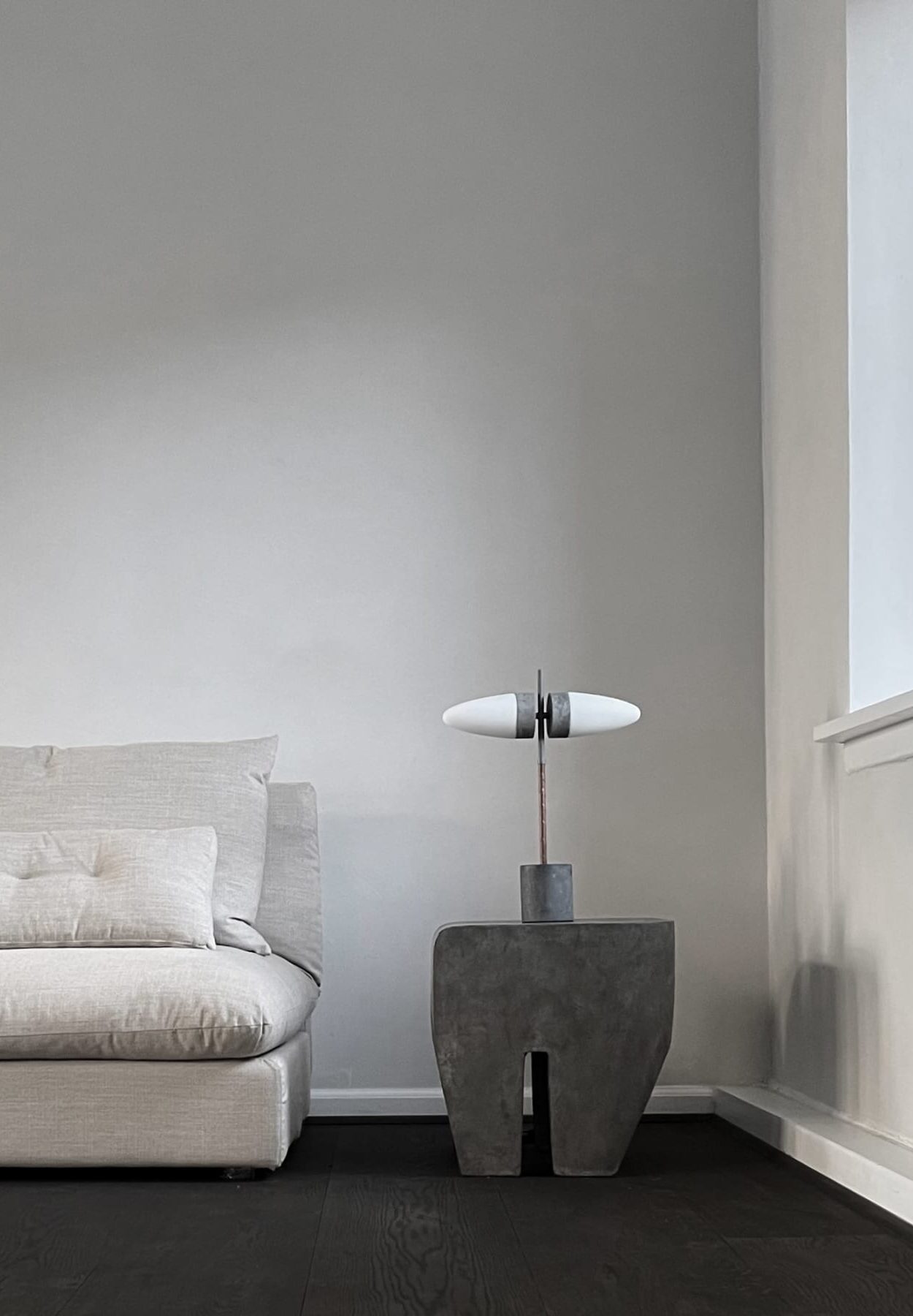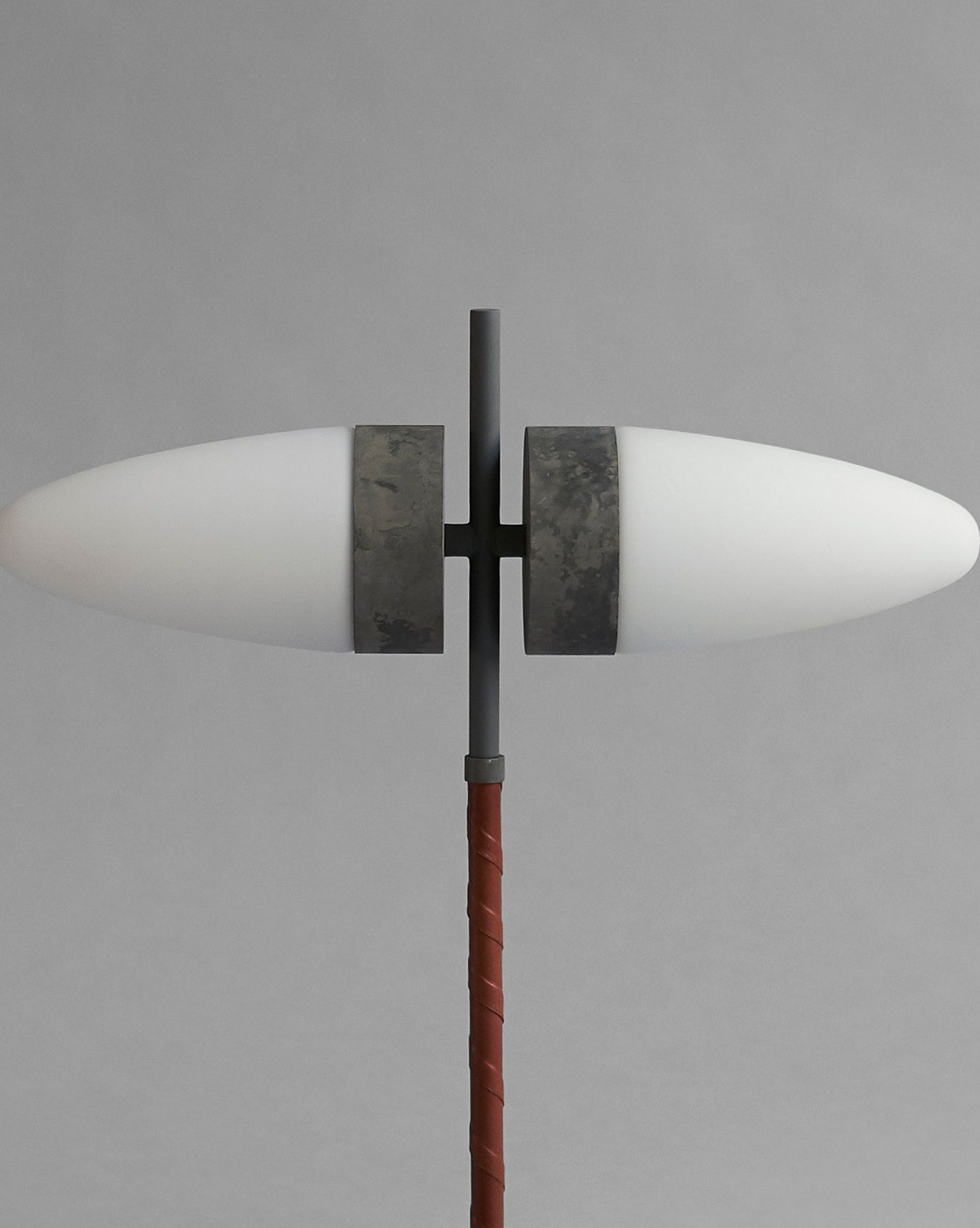 Inspired by the characteristic use of animal pictures in Danish Modernism from the 1940s to 1960s, the Bull lamp takes its name after the bull-like lampshades of opal glass, providing a smooth light scattering and a characteristic expression. The body consists of an unpolished grey marble base with a lamp arm in oxidized aluminum covered in spun cognac coloured leather, and an upper part in oxidized aluminum that stands in beautiful contrast to the light, translucent glass. This subtle interaction of materials makes the Bull lamp much more than merely a source of light. Designed by Kristian Sofus Hansen & Tommy Hyldahl.Recommended 101 Cph Light Source: Pygmy – Matt Porcelain – E14View assembly guide here.