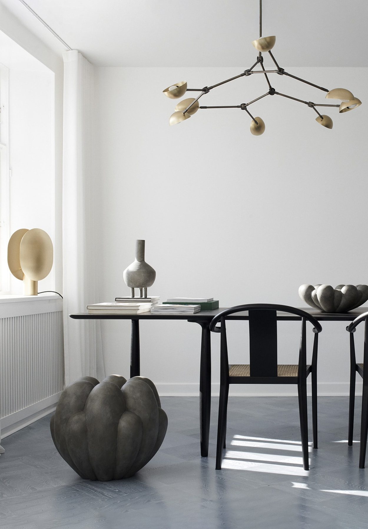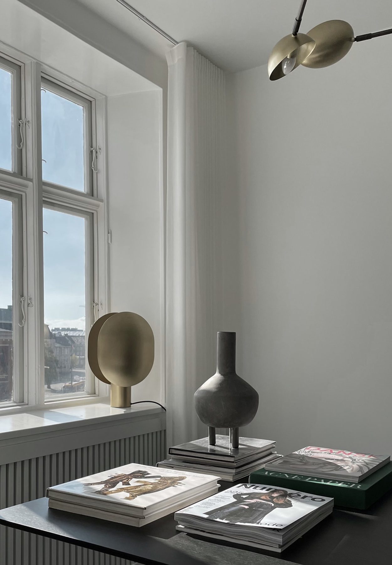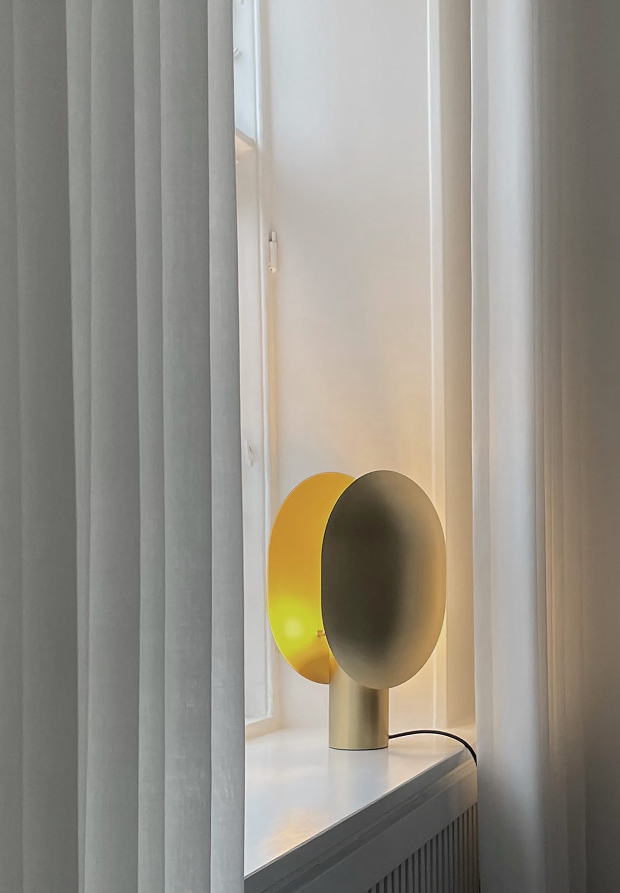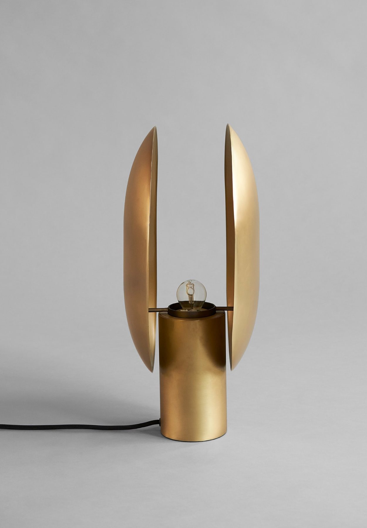 The Clam series consists of a table and a wall lamp characterized by its two opposing shades playing with direct and indirect lighting. In a very Japanese inspired manner, the minimalist lamp smoothly reflects the light to both sides of the gently curved metal screens. The lamp is beautifully crafted in brass, plated, and subsequent hand brushed metal. Designed by Kristian Sofus Hansen & Tommy Hyldahl.Recommended 101 Cph Light Source: Pygmy – Matt Porcelain – E14View assembly guide here.