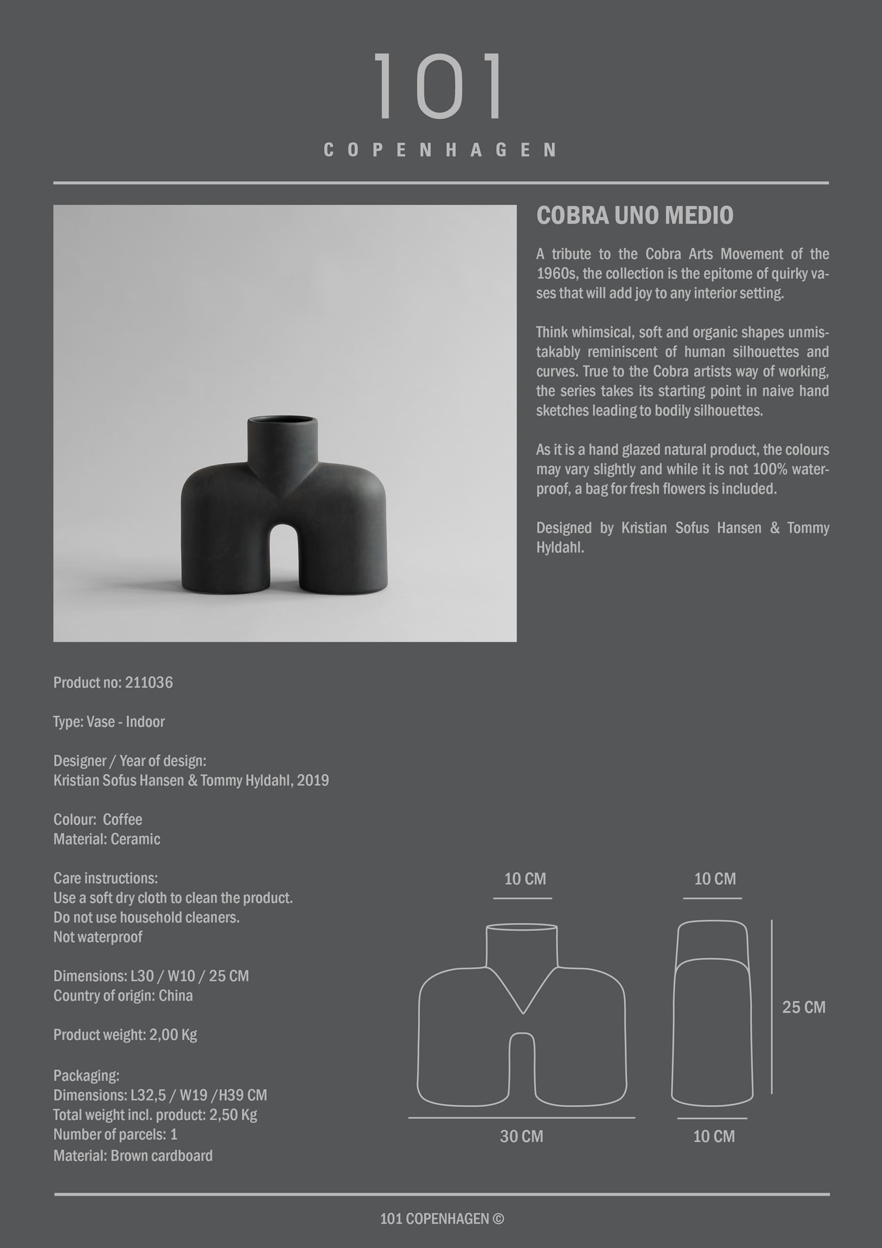 A tribute to the Cobra Arts Movement of the 1960s, the collection is the epitome of quirky vases that will add joy to any interior setting. Think whimsical, soft and organic shapes unmistakably reminiscent of human silhouettes and curves. True to the Cobra artists way of working, the series takes its starting point in naive hand sketches leading to bodily silhouettes. As it is a hand glazed natural product, the colours may vary slightly and while it is not 100% waterproof, a bag for fresh flowers is included. Designed by Kristian Sofus Hansen & Tommy Hyldahl.