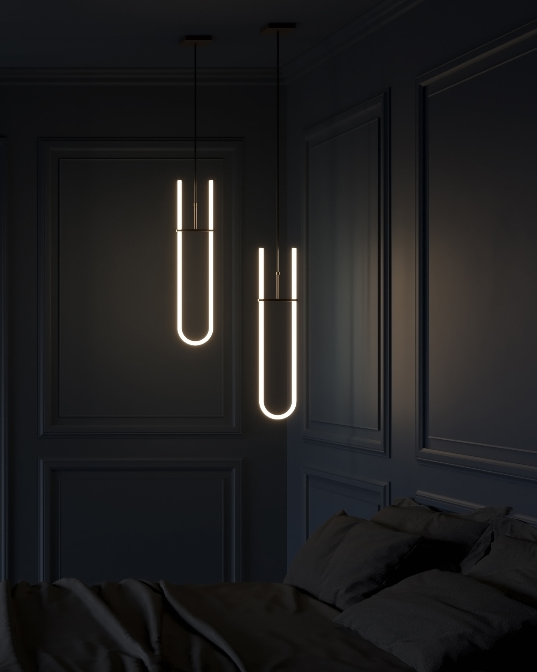 Drawing inspiration from minimalist art, the Curve pendant seamlessly melds light and sculpture, creating a striking graphic lighting design. This pendant showcases a radiant white acrylic tube, which houses a long-lasting LED light source, boasting 25,000 hours of illumination at a warm Kelvin 2400. Accented with plated metal fittings at both ends, and mounted on streamlined, geometric metal fixtures, the Curve pendant evokes a distinctly graphic ambiance. Shifting away from the starkness typically associated with neon, these innovative lamps exude a warmer, more inviting glow, setting the ambiance for a cozy and comforting atmosphere.Designed by Kristian Sofus Hansen & Tommy Hyldahl.View assembly guide here.