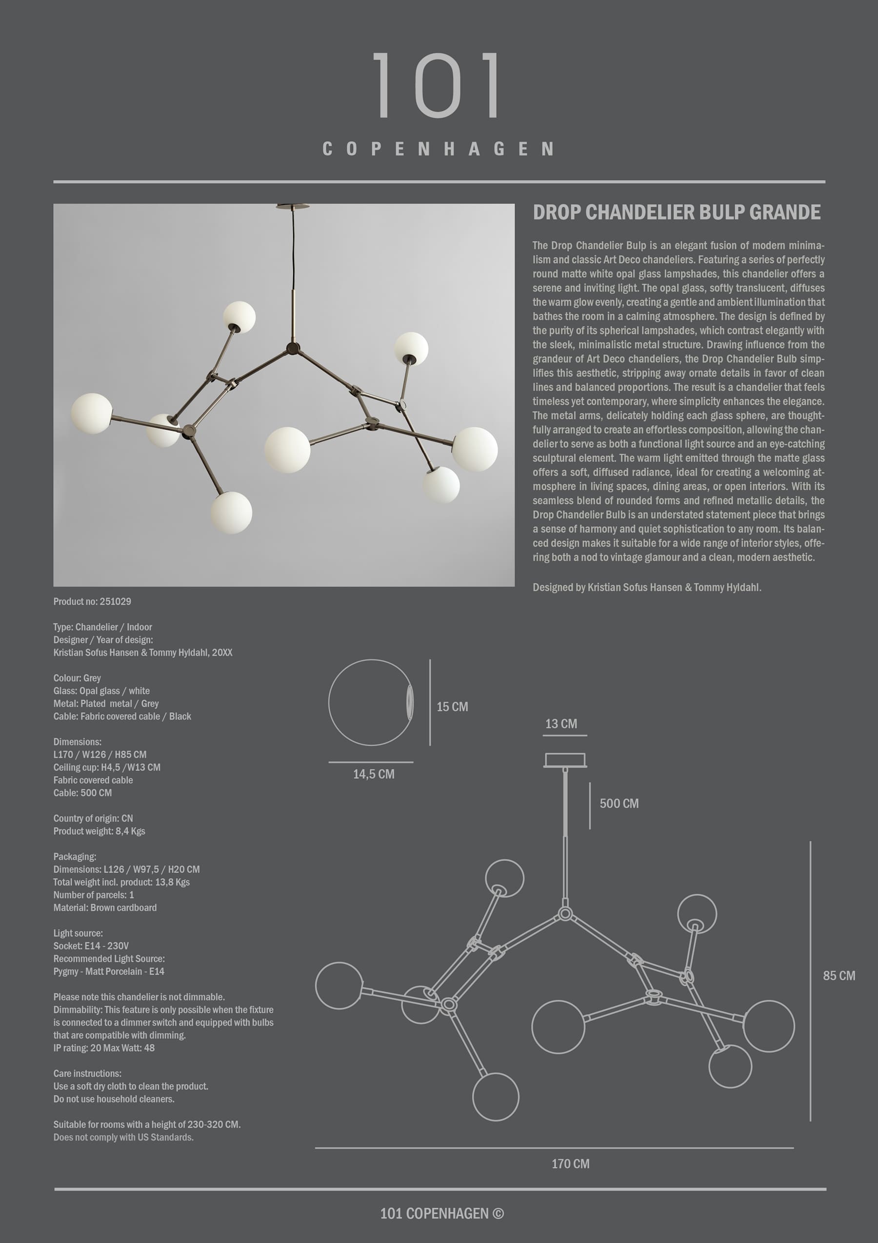The Drop Chandelier Bulp is an elegant fusion of modern minimalism and classic Art Deco chandeliers. Featuring a series of perfectly round matte white opal glass lampshades, this chandelier offers a serene and inviting light. The opal glass, softly translucent, diffuses the warm glow evenly, creating a gentle and ambient illumination that bathes the room in a calming atmosphere. The design is defined by the purity of its spherical lampshades, which contrast elegantly with the sleek, minimalistic metal structure. Drawing influence from the grandeur of Art Deco chandeliers, the Drop Chandelier Bulb simplifies this aesthetic, stripping away ornate details in favor of clean lines and balanced proportions. The result is a chandelier that feels timeless yet contemporary, where simplicity enhances the elegance. The metal arms, delicately holding each glass sphere, are thoughtfully arranged to create an effortless composition, allowing the chandelier to serve as both a functional light source and an eye-catching sculptural element. The warm light emitted through the matte glass offers a soft, diffused radiance, ideal for creating a welcoming atmosphere in living spaces, dining areas, or open interiors. With its seamless blend of rounded forms and refined metallic details, the Drop Chandelier Bulb is an understated statement piece that brings a sense of harmony and quiet sophistication to any room. Its balanced design makes it suitable for a wide range of interior styles, offering both a nod to vintage glamour and a clean, modern aesthetic. Designed by Kristian Sofus Hansen & Tommy Hyldahl.