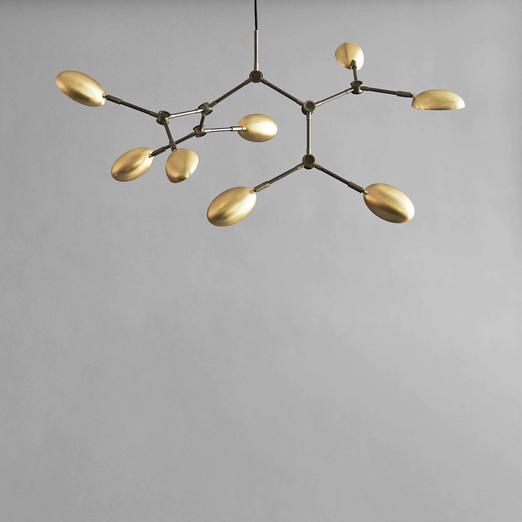 You almost feel the movement of the Drop Chandelier. As a free-flowing sculpture, it takes in the space and insists on a life of its own. While The Drop Chandelier collection honors modernist lamp designs of the 1950s, it also celebrates an experimental, innovative approach with its gently curving shades and 14 flexible and functional adjustable arms – creating countless options, variations and angles. The beautifully crafted bronze & plated metal body is subsequently hand brushed and the lamp brightens up the room elegantly with a warm, pleasant light. Designed by Kristian Sofus Hansen & Tommy Hyldahl.Recommended 101 Cph Light Source: Pygmy – Matt Porcelain – E14View assembly guide here.