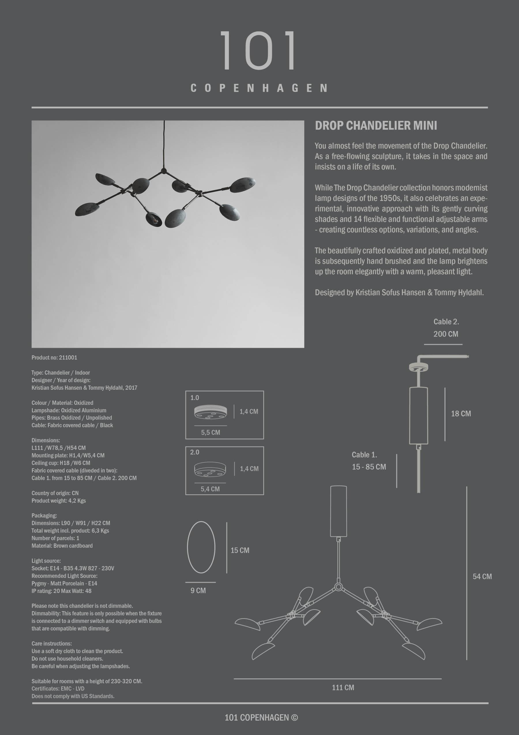You almost feel the movement of the Drop Chandelier. As a free-flowing sculpture, it takes in the space and insists on a life of its own. While The Drop Chandelier collection honors modernist lamp designs of the 1950s, it also celebrates an experimental, innovative approach with its gently curving shades and 14 flexible and functional adjustable arms – creating countless options, variations and angles. The beautifully crafted oxidized & plated metal body is subsequently hand brushed and the lamp brightens up the room elegantly with a warm, pleasant light. Designed by Kristian Sofus Hansen & Tommy Hyldahl.Recommended 101 Cph Light Source: Pygmy – Matt Porcelain – E14View assembly guide here.