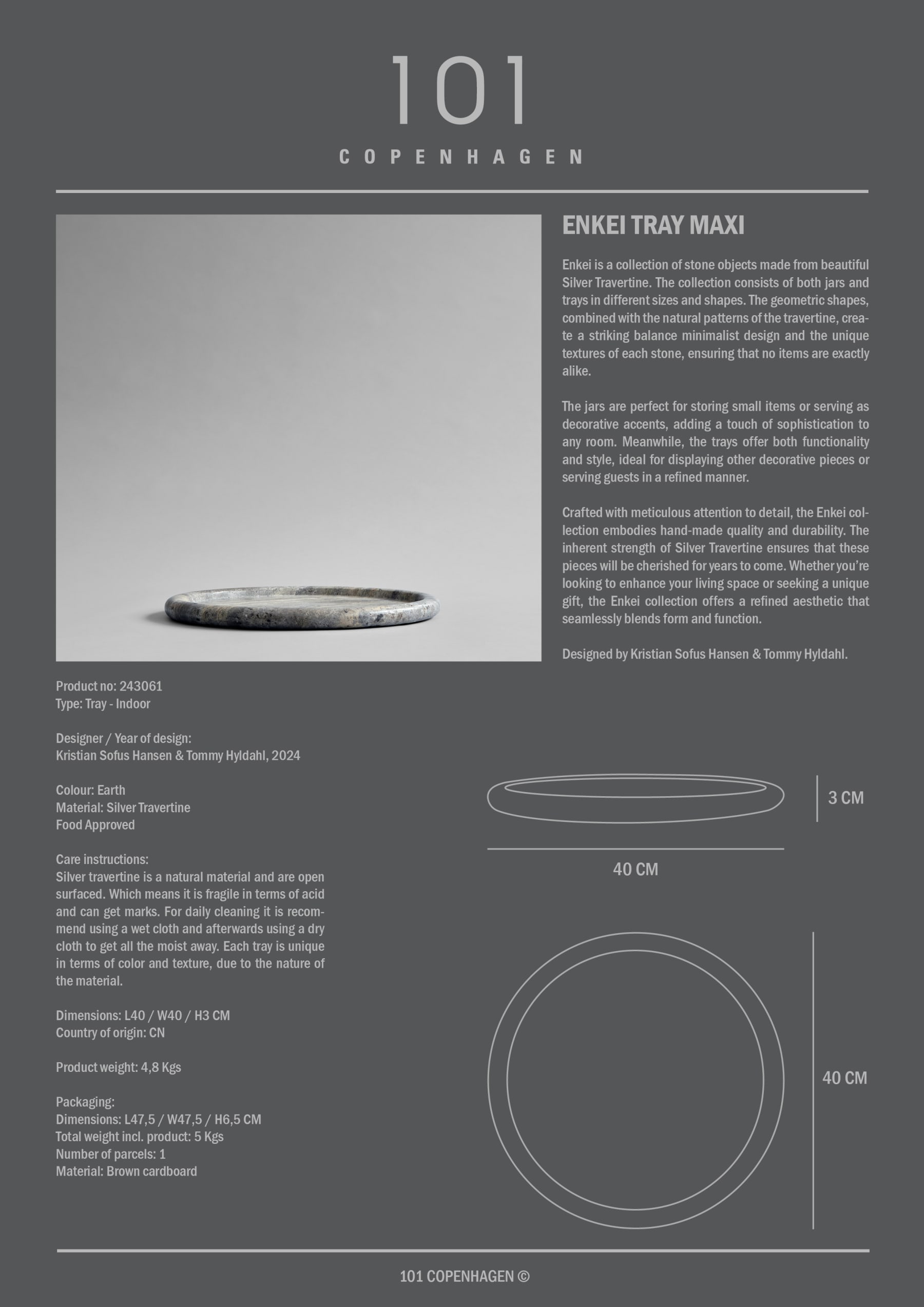 Enkei is a collection of stone objects made from beautiful Silver Travertine. The collection consists of both jars and trays in different sizes and shapes. The geometric shapes, combined with the natural patterns of the travertine, create a striking balance minimalist design and the unique textures of each stone, ensuring that no items are exactly alike.The jars are perfect for storing small items or serving as decorative accents, adding a touch of sophistication to any room. Meanwhile, the trays offer both functionality and style, ideal for displaying other decorative pieces or serving guests in a refined manner. Crafted with meticulous attention to detail, the Enkei collection embodies hand-made quality and durability. The inherent strength of Silver Travertine ensures that these pieces will be cherished for years to come. Whether you’re looking to enhance your living space or seeking a unique gift, the Enkei collection offers a refined aesthetic that seamlessly blends form and function.Designed by Kristian Sofus Hansen & Tommy Hyldahl.