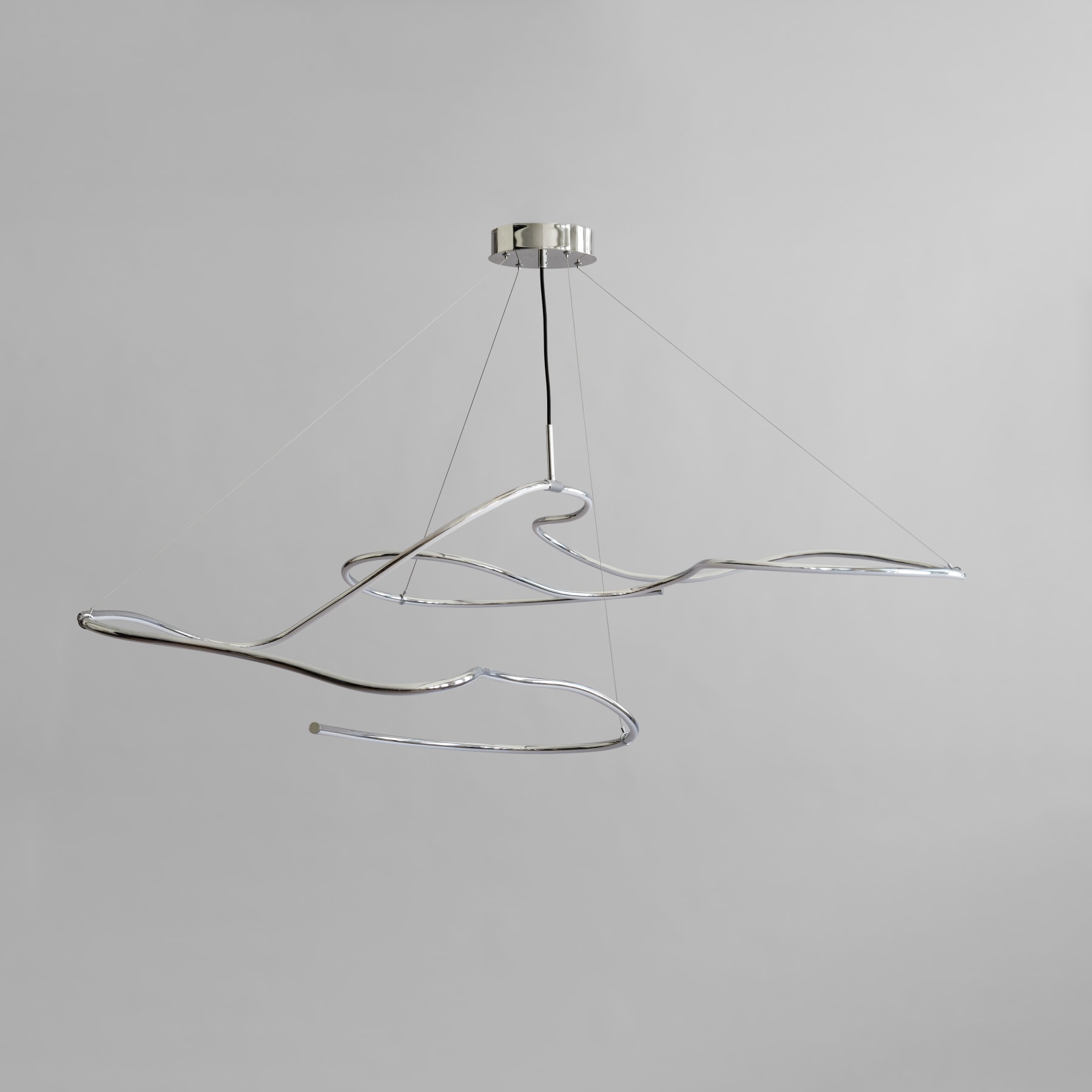 Drawing inspiration from minimalist art, the Ghost Chandelier seamlessly melds light with sculpture, embodying a graphic lighting aesthetic. The Ghost’s defining feature is its radiant white acrylic tube, which flows in various directions, forging an ambient illumination reminiscent of organic patterns. Originating from a hand sketch, the design infuses spaces with an artistic and graphic ambiance. Its ever-evolving appearance captivates observers, morphing into diverse patterns and forms depending on one’s vantage point. In any setting, Ghost asserts itself as a centerpiece. Ghost Chandelier comes in three options, Neon, Burned Black and Chrome. Available in two sizes, the Ghost Chandelier incorporates an inbuilt LED light. This series highlights the luminous white acrylic tube that encases a durable LED light source, boasting an impressive 25,000 hours of illumination at a warm Kelvin 2400. Shifting away from the starkness typically associated with neon, these innovative lamps exude a warmer, more inviting glow, setting the ambiance for a cozy and comforting atmosphere. The handcrafted design of the Ghost Chandelier ensures that light distribution uniquely cascades along its curvaceous tubes. resulting in it to shine brighter in some part of its curved tube.  Suspended by four adjustable stainless-steel wires, the chandelier can be set to the perfect height for any room.Designed by Kristian Sofus Hansen & Tommy Hyldahl.View assembly guide here.
