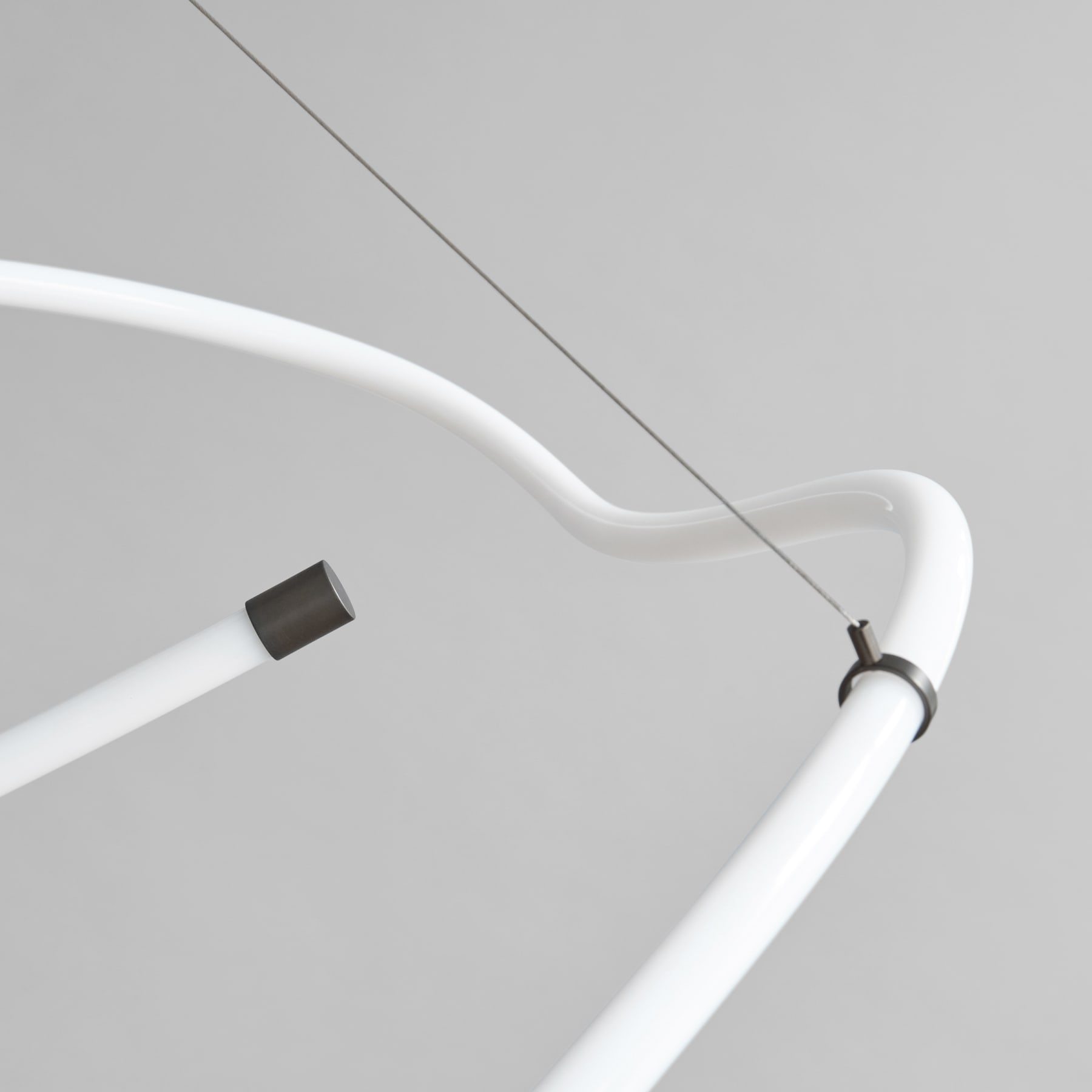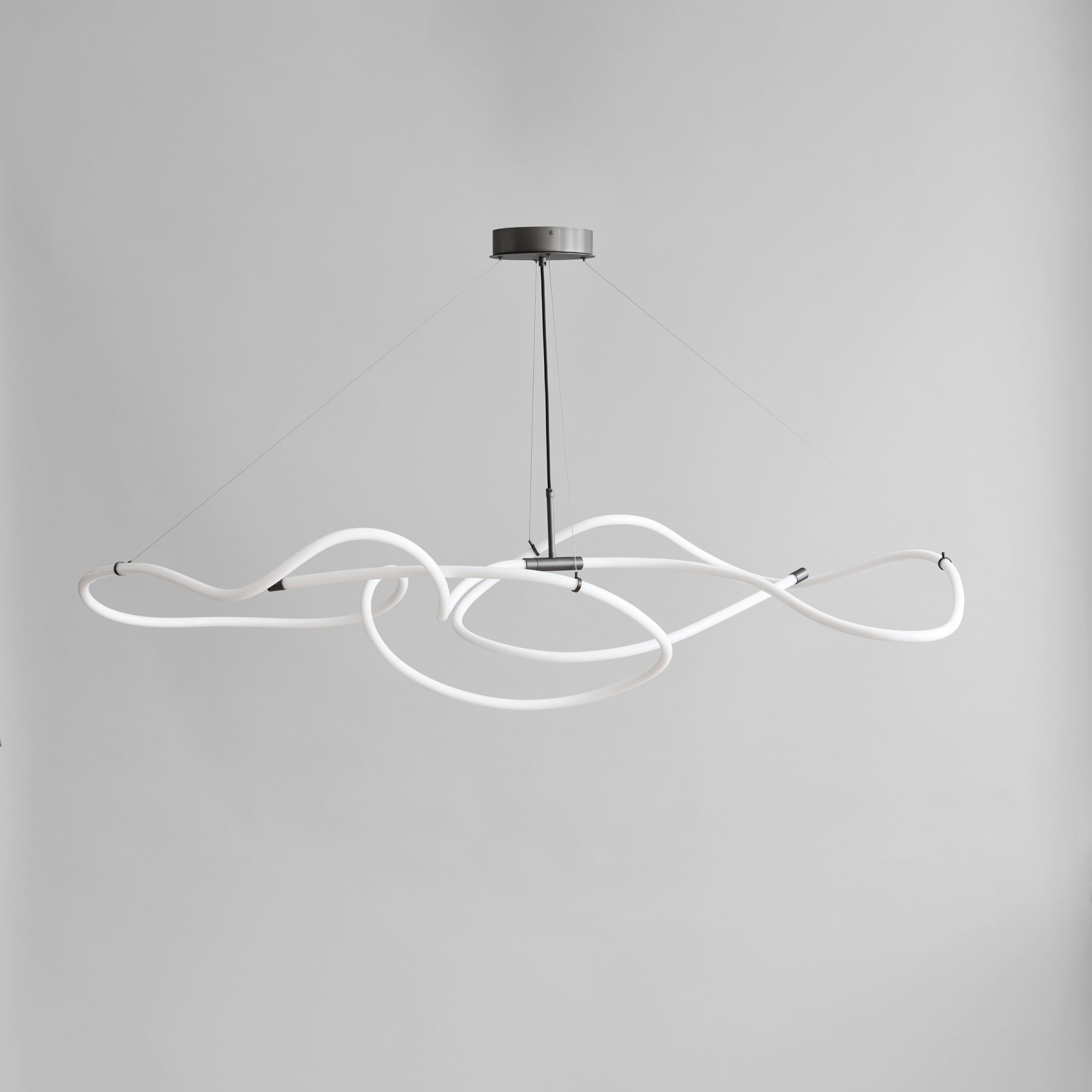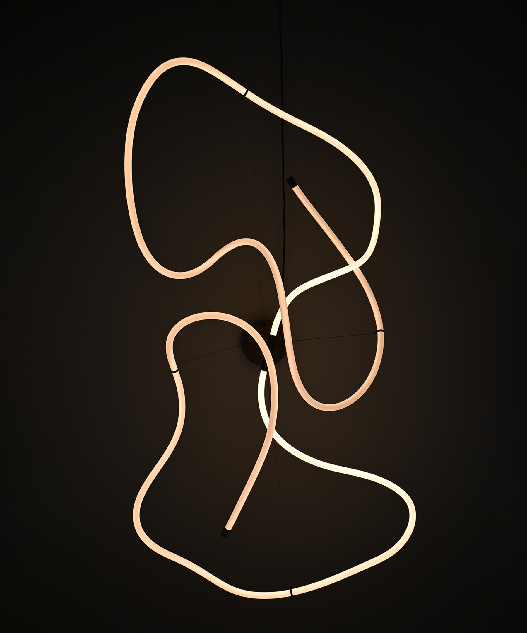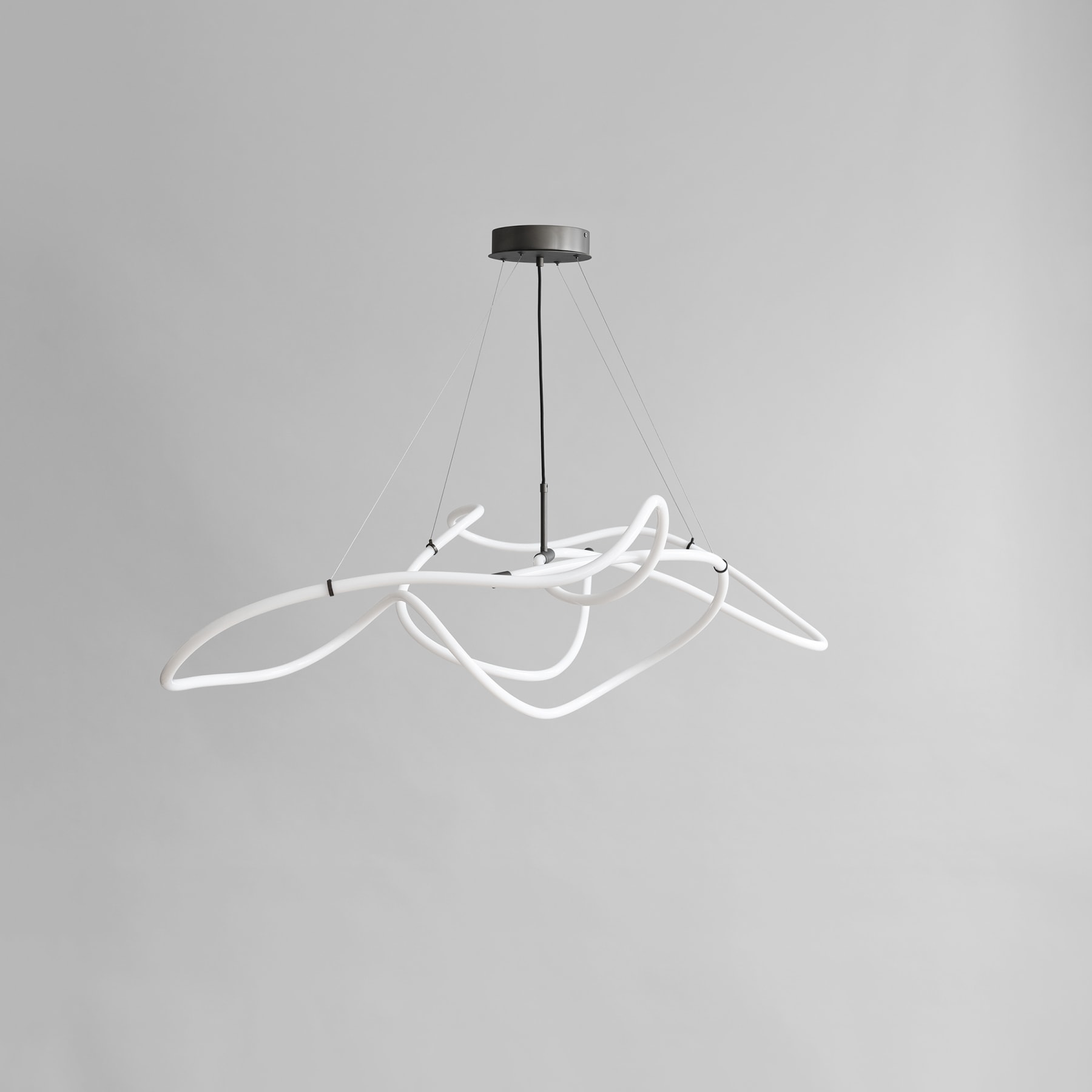 Drawing inspiration from minimalist art, the Ghost Chandelier seamlessly melds light with sculpture, embodying a graphic lighting aesthetic. The Ghost’s defining feature is its radiant white acrylic tube, which flows in various directions, forging an ambient illumination reminiscent of organic patterns. Originating from a hand sketch, the design infuses spaces with an artistic and graphic ambiance. Its ever-evolving appearance captivates observers, morphing into diverse patterns and forms depending on one’s vantage point. In any setting, Ghost asserts itself as a centrepiece. Available in two sizes, the Ghost Chandelier incorporates an inbuilt LED light. This series highlights the luminous white acrylic tube that encases a durable LED light source, boasting an impressive 25,000 hours of illumination at a warm Kelvin 2400. Shifting away from the starkness typically associated with neon, these innovative lamps exude a warmer, more inviting glow, setting the ambiance for a cozy and comforting atmosphere. Bronze metal accents provides a refined finish to its minimalist design. The handcrafted design of the Ghost Chandelier ensures that light distribution uniquely cascades along its curvaceous tubes. resulting in it to shine brighter in some part of its curved tube. Suspended by four adjustable stainless-steel wires, the chandelier can be set to the perfect height for any room.Designed by Kristian Sofus Hansen & Tommy Hyldahl.View assembly guide here.