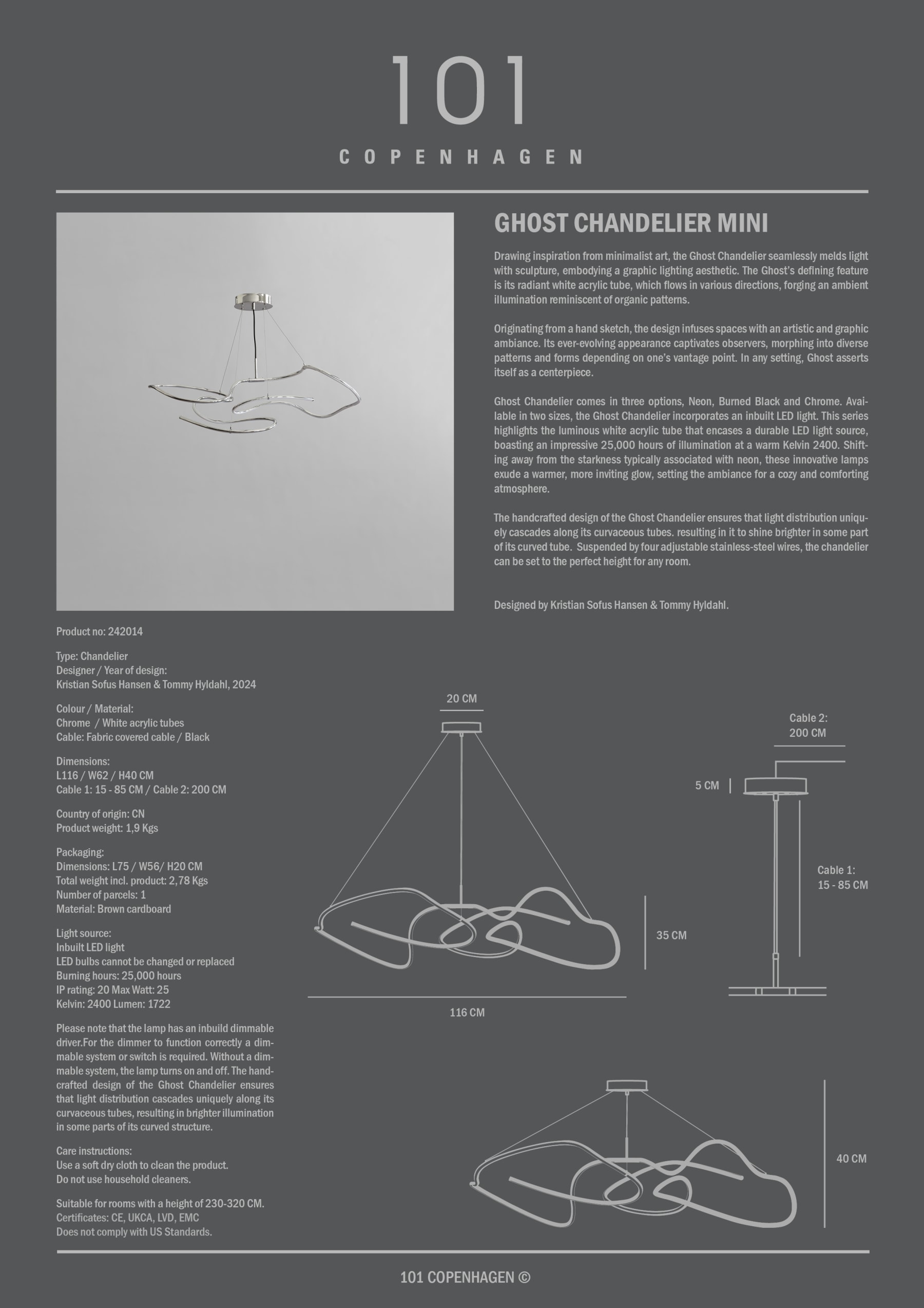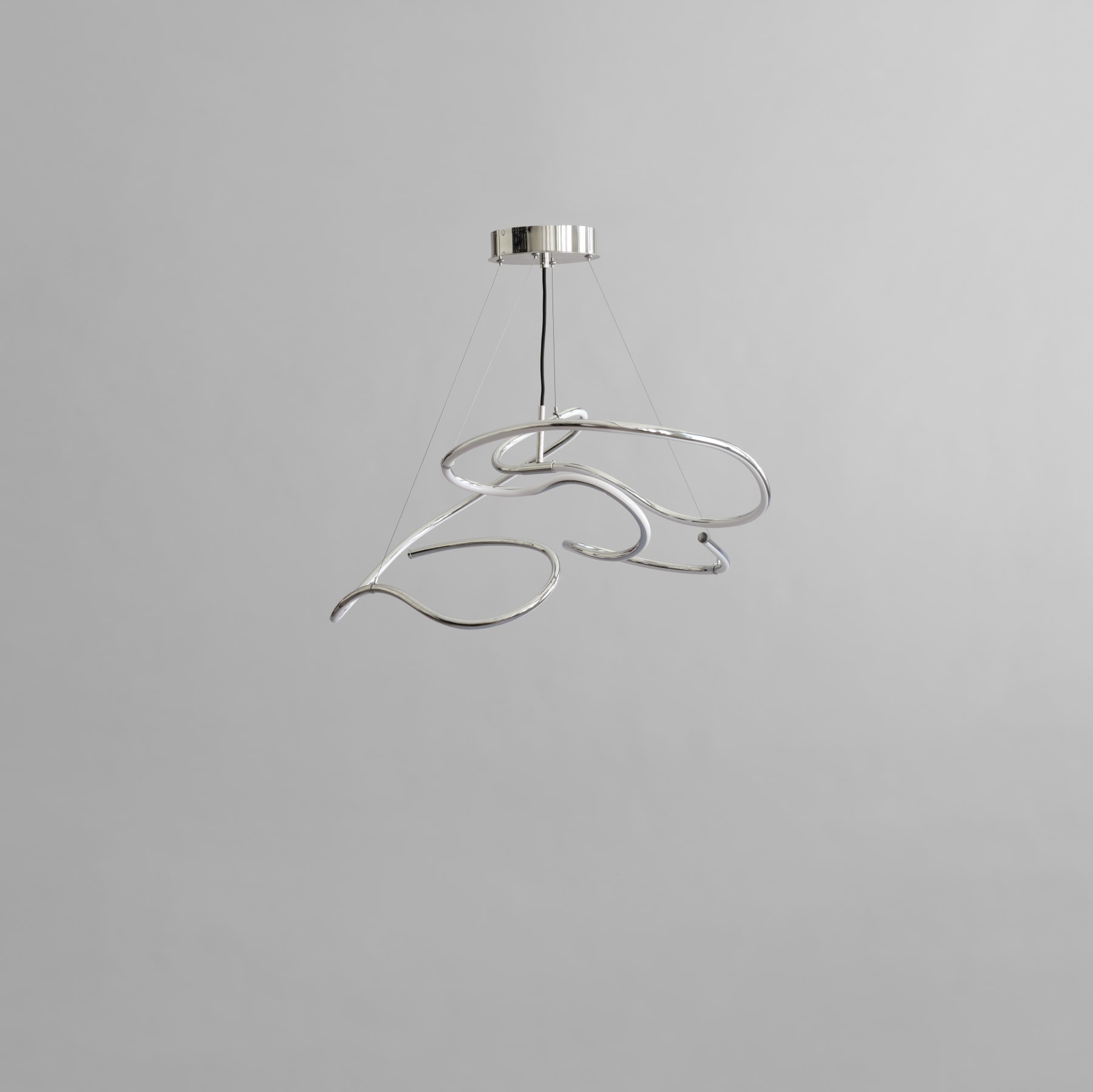 Drawing inspiration from minimalist art, the Ghost Chandelier seamlessly melds light with sculpture, embodying a graphic lighting aesthetic. The Ghost’s defining feature is its radiant white acrylic tube, which flows in various directions, forging an ambient illumination reminiscent of organic patterns. Originating from a hand sketch, the design infuses spaces with an artistic and graphic ambiance. Its ever-evolving appearance captivates observers, morphing into diverse patterns and forms depending on one’s vantage point. In any setting, Ghost asserts itself as a centerpiece. Ghost Chandelier comes in three options, Neon, Burned Black and Chrome. Available in two sizes, the Ghost Chandelier incorporates an inbuilt LED light. This series highlights the luminous white acrylic tube that encases a durable LED light source, boasting an impressive 25,000 hours of illumination at a warm Kelvin 2400. Shifting away from the starkness typically associated with neon, these innovative lamps exude a warmer, more inviting glow, setting the ambiance for a cozy and comforting atmosphere. The handcrafted design of the Ghost Chandelier ensures that light distribution uniquely cascades along its curvaceous tubes. resulting in it to shine brighter in some part of its curved tube. Suspended by four adjustable stainless-steel wires, the chandelier can be set to the perfect height for any room.Designed by Kristian Sofus Hansen & Tommy Hyldahl.View assembly guide here.