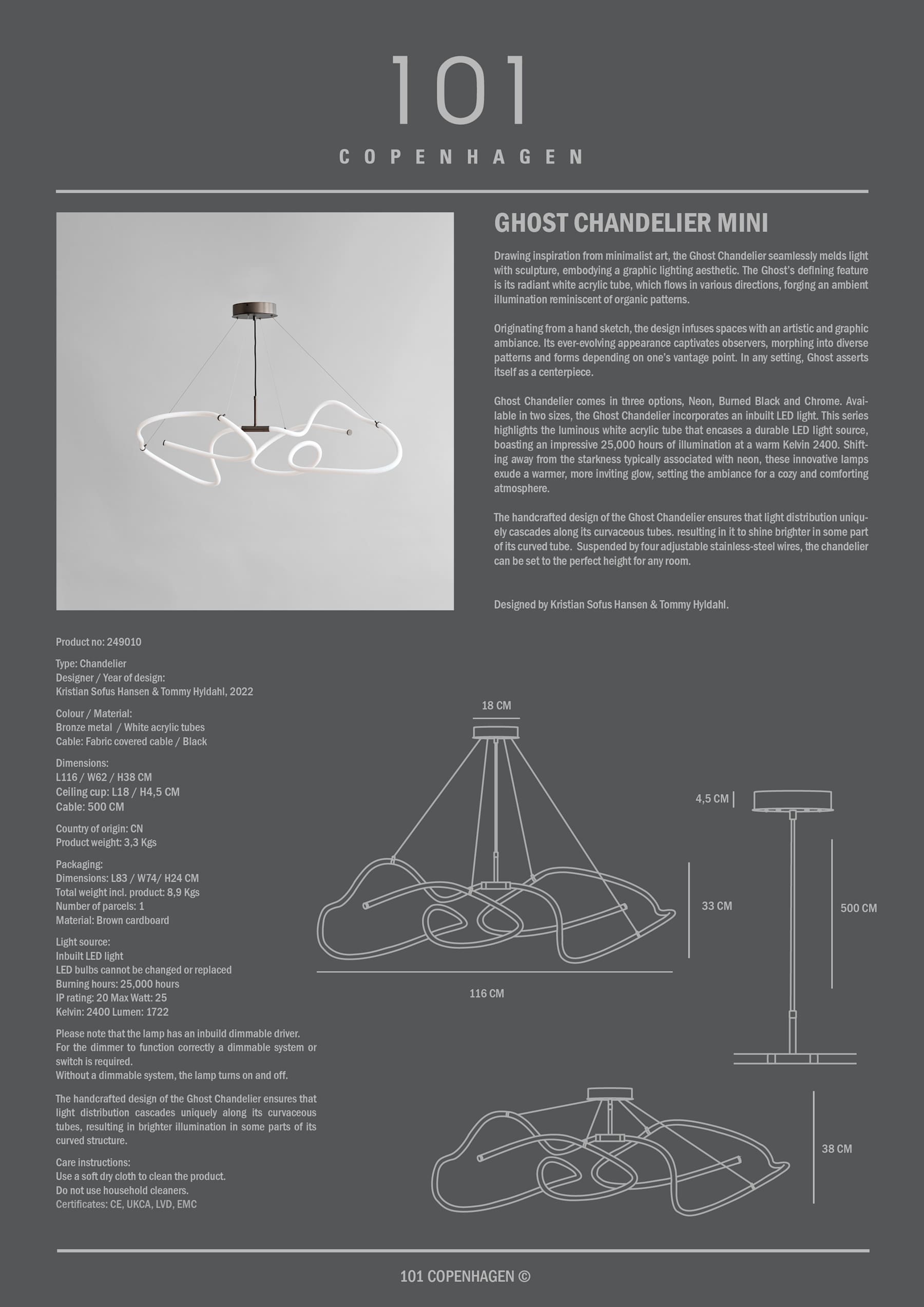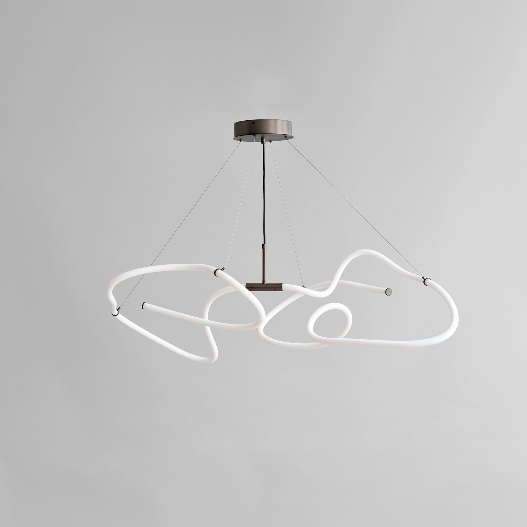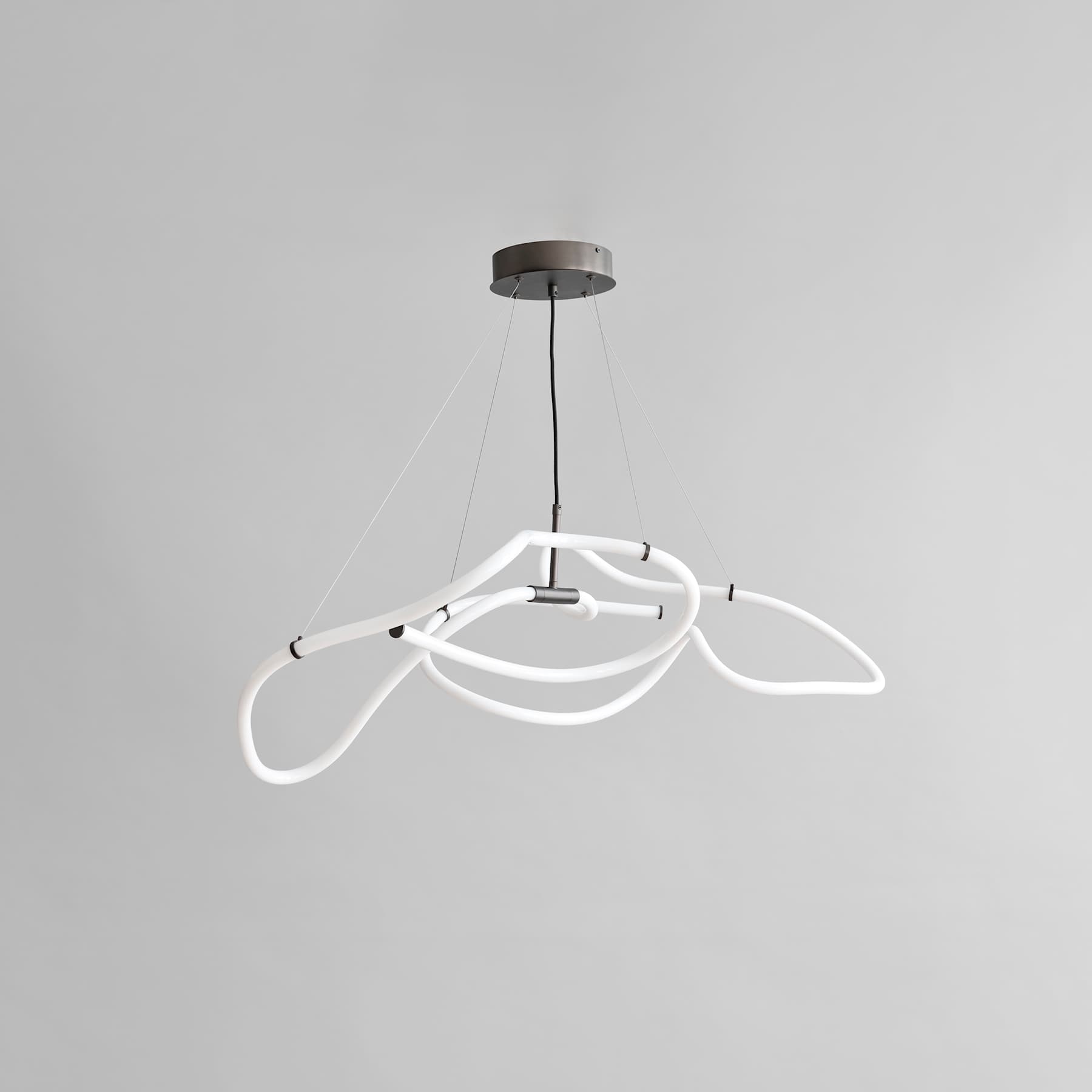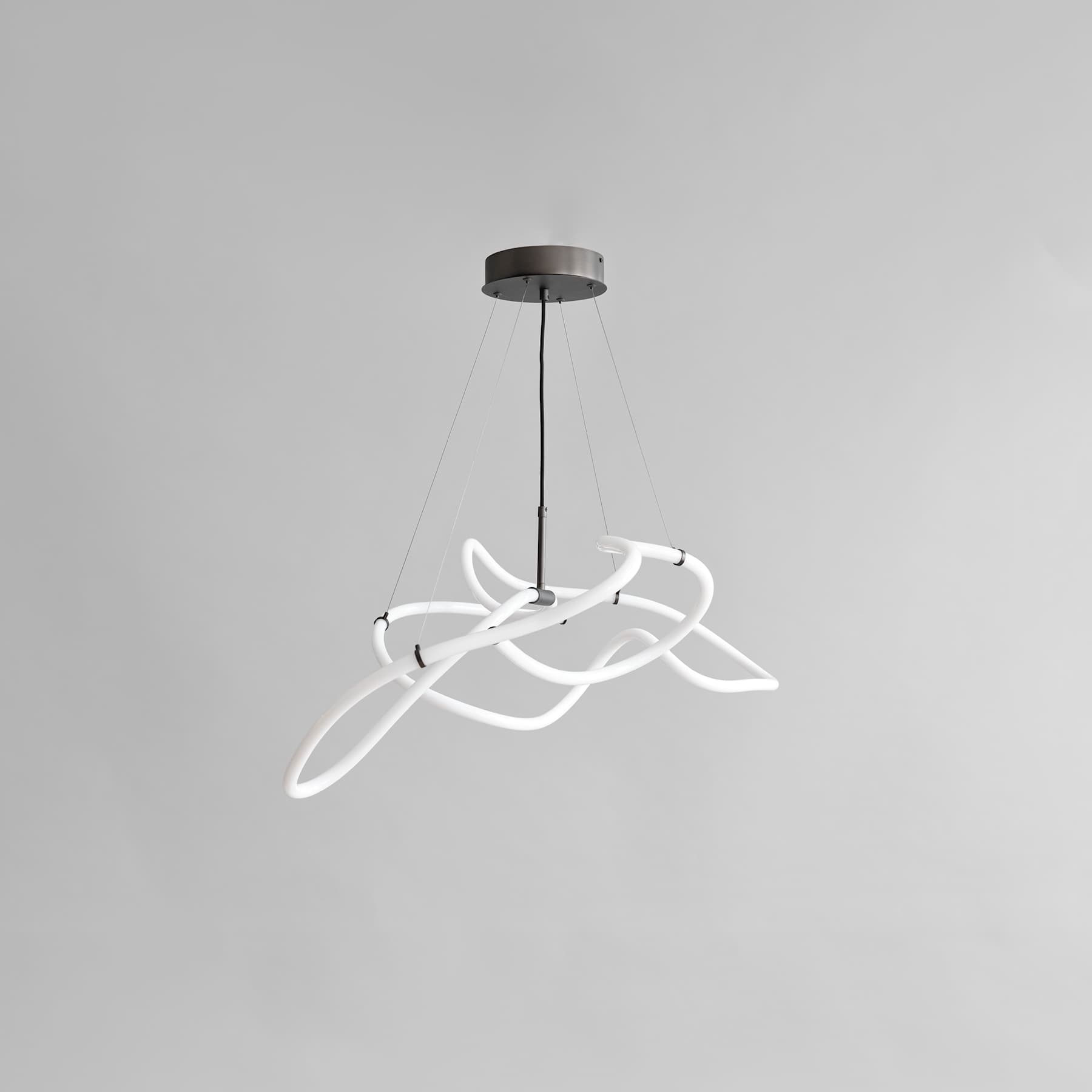 Drawing inspiration from minimalist art, the Ghost Chandelier seamlessly melds light with sculpture, embodying a graphic lighting aesthetic. The Ghost’s defining feature is its radiant white acrylic tube, which flows in various directions, forging an ambient illumination reminiscent of organic patterns. Originating from a hand sketch, the design infuses spaces with an artistic and graphic ambiance. Its ever-evolving appearance captivates observers, morphing into diverse patterns and forms depending on one’s vantage point. In any setting, Ghost asserts itself as a centerpiece. Ghost Chandelier comes in three options, Neon, Burned Black and Chrome. Available in two sizes, the Ghost Chandelier incorporates an inbuilt LED light. This series highlights the luminous white acrylic tube that encases a durable LED light source, boasting an impressive 25,000 hours of illumination at a warm Kelvin 2400. Shifting away from the starkness typically associated with neon, these innovative lamps exude a warmer, more inviting glow, setting the ambiance for a cozy and comforting atmosphere. The handcrafted design of the Ghost Chandelier ensures that light distribution uniquely cascades along its curvaceous tubes. resulting in it to shine brighter in some part of its curved tube.  Suspended by four adjustable stainless-steel wires, the chandelier can be set to the perfect height for any room.Designed by Kristian Sofus Hansen & Tommy Hyldahl.View assembly guide here.