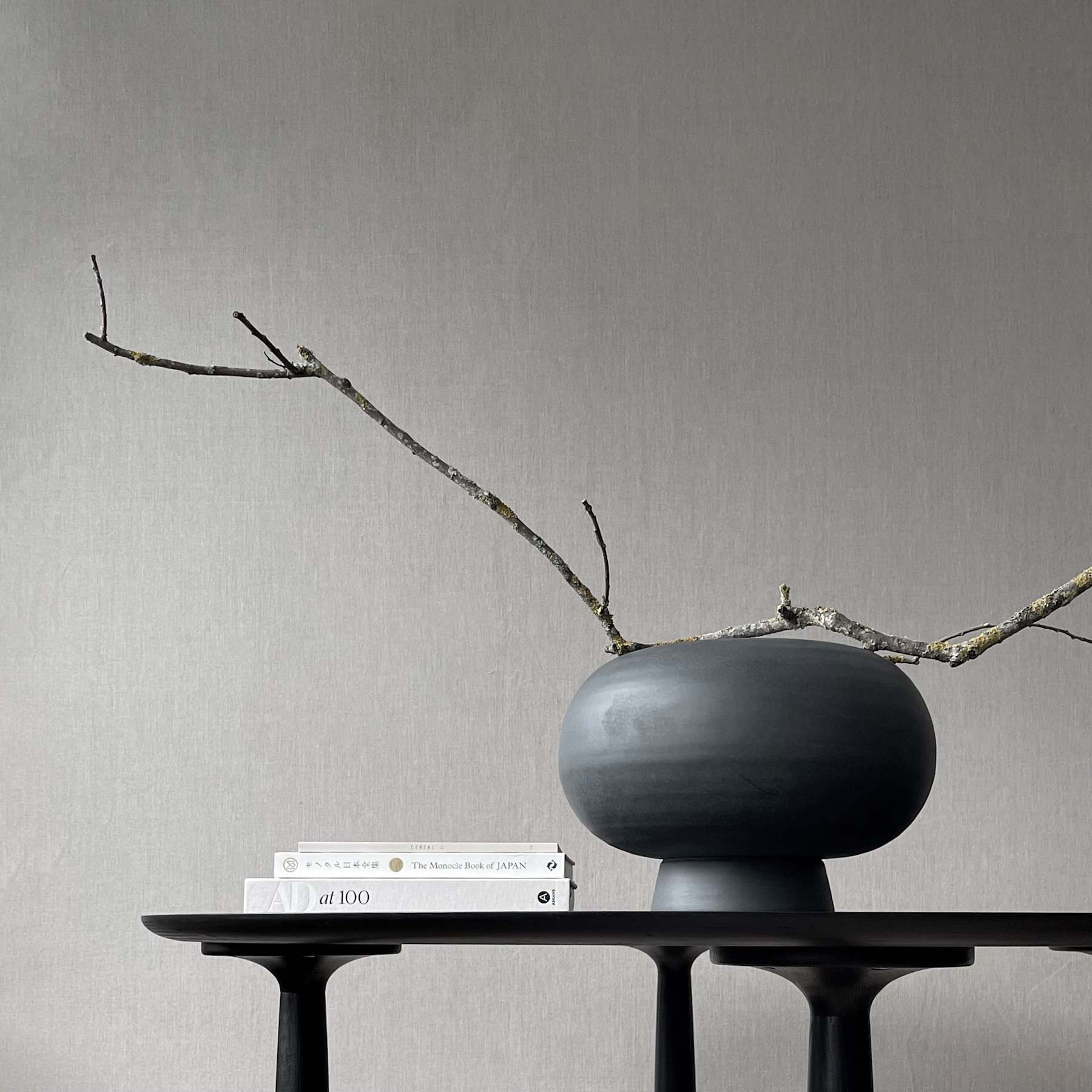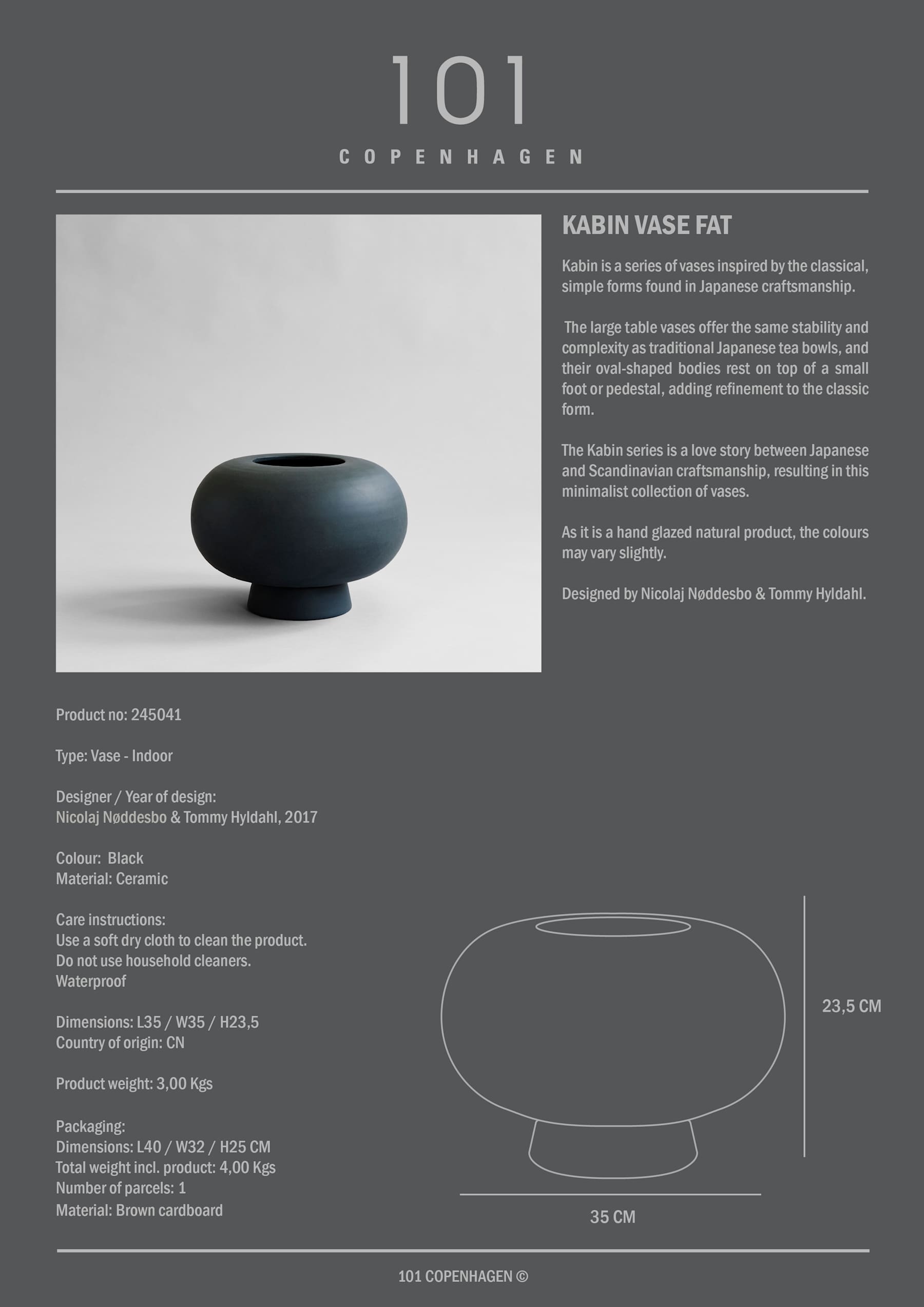 Kabin is a series of vases inspired by the classical, simple forms found in Japanese craftsmanship. The large table vases offer the same stability and complexity as traditional Japanese tea bowls, and their oval-shaped bodies rest on top of a small foot or pedestal, adding refinement to the classic form. The Kabin series is a love story between Japanese and Scandinavian craftsmanship, resulting in this minimalist collection of vases. As it is a hand glazed natural product, the colours may vary slightly and as it is not 100% waterproof, a bag for fresh flowers is included. Designed by Nicolaj Nøddesbo & Tommy Hyldahl.