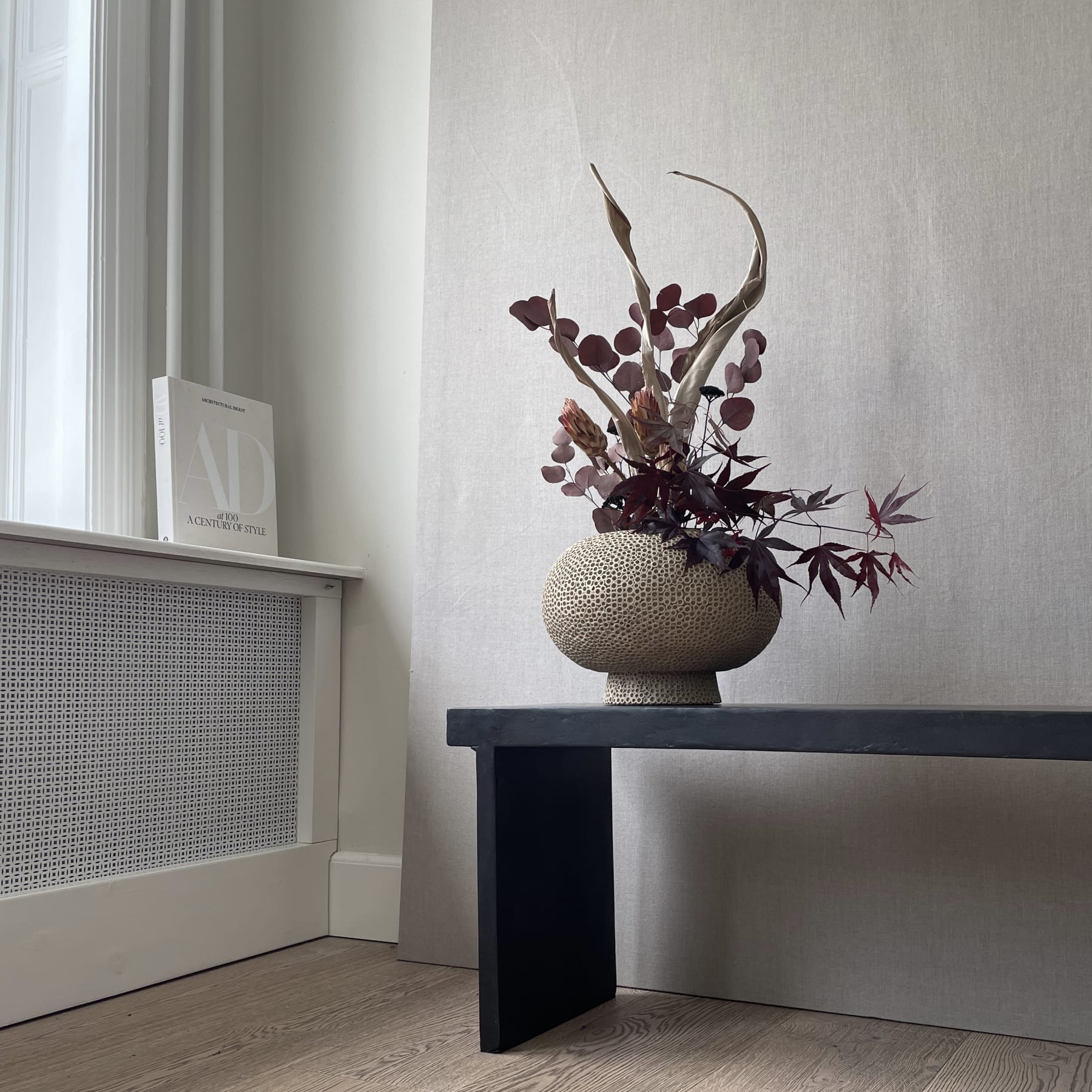 Kabin is a series of vases inspired by the classical, simple forms found in Japanese craftsmanship. The large table vases offer the same stability and complexity as the traditional Japanese tea bowls, and the oval-shaped bodies rest on top of a small foot or pedestal, adding refinement to the classic form. The Kabin series is a love story between Japanese and Scandinavian craftsmanship, resulting in this minimalist collection of vases in four different structures.Kabin Shisen is a new edition to the Kabin series, offering a unique detailed finish, with the attempt to create a unique surface of hundreds of small circles fading into a tactile pattern. Shisen is Japanese for a mesh or the way of seeing things. As it is a hand glazed nature product, the colours may vary slightly and as it is not 100% waterproof, a bag for fresh flowers is included.Designed by Kristian Sofus Hansen & Tommy Hyldahl.