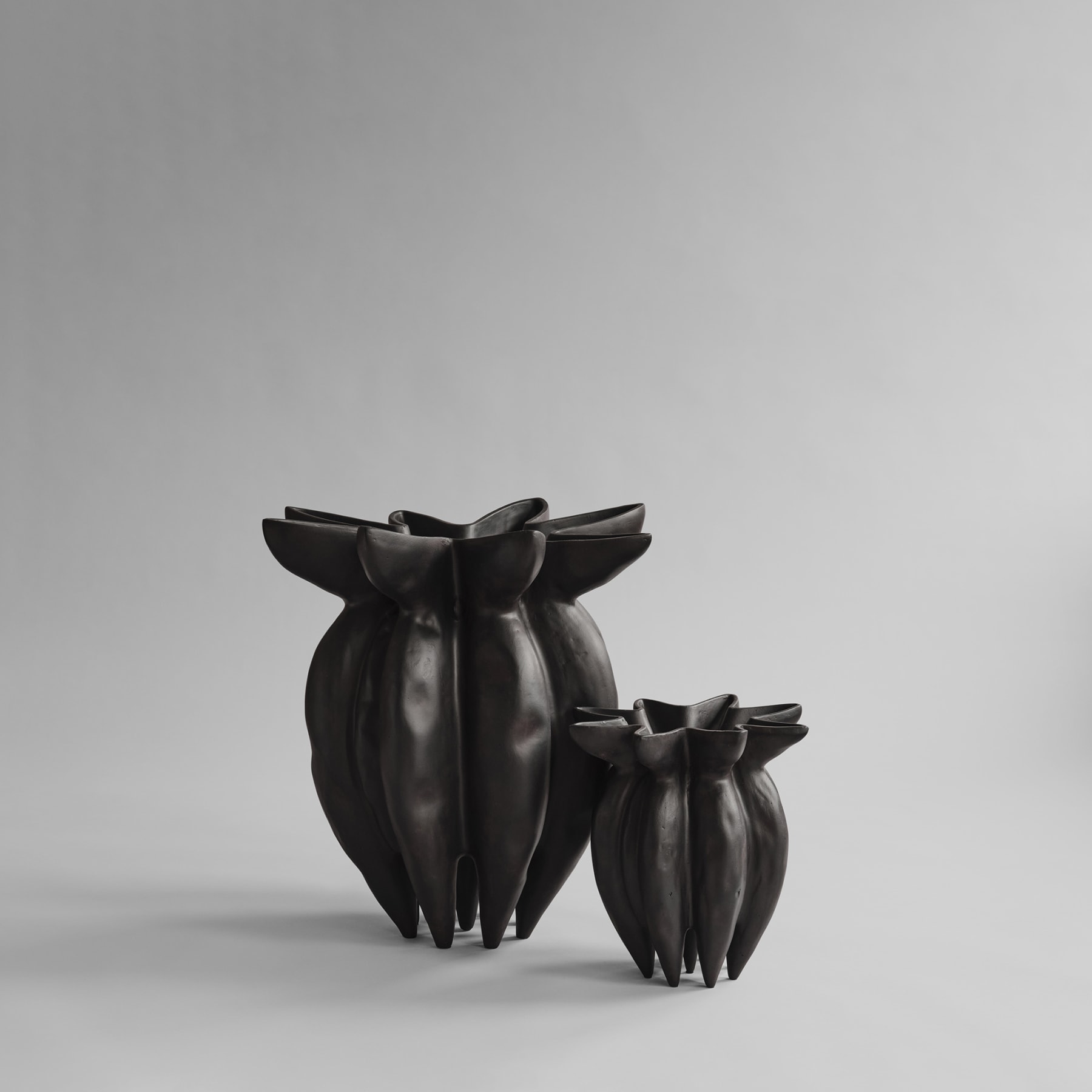 Inspired by the floral shapes of the Lotus flower, Lotus emphasises organic shapes and sharp lines into a collection of sculptural ceramic vases. Elegantly sculpted, the Lotus vase is characterised by several flowers fading into each other, resting on top of a set of sharp feet. The smooth and organic surface is contrasted by sharp lines, running from the feet to the top of the vase, creating a star shaped opening. Lotus comes in two sizes and is made of fiber concrete. The surface is hand glazed in order to achieve the unique surface texture. The colours may vary slightly, due to that it’s a handmade product. The vase is not 100% waterproof, therefore a bag for fresh flowers is included. Designed by Kristian Sofus Hansen & Tommy Hyldahl