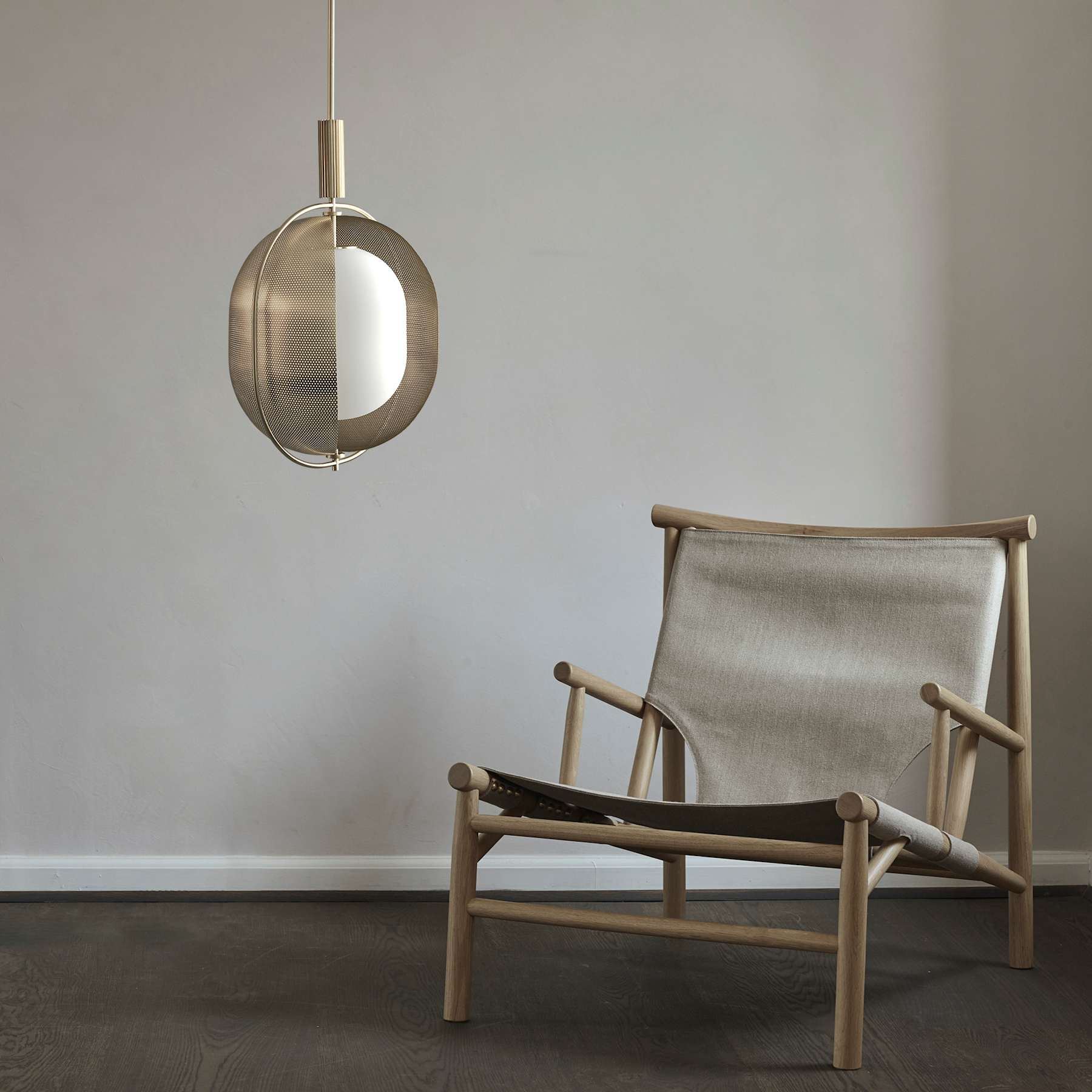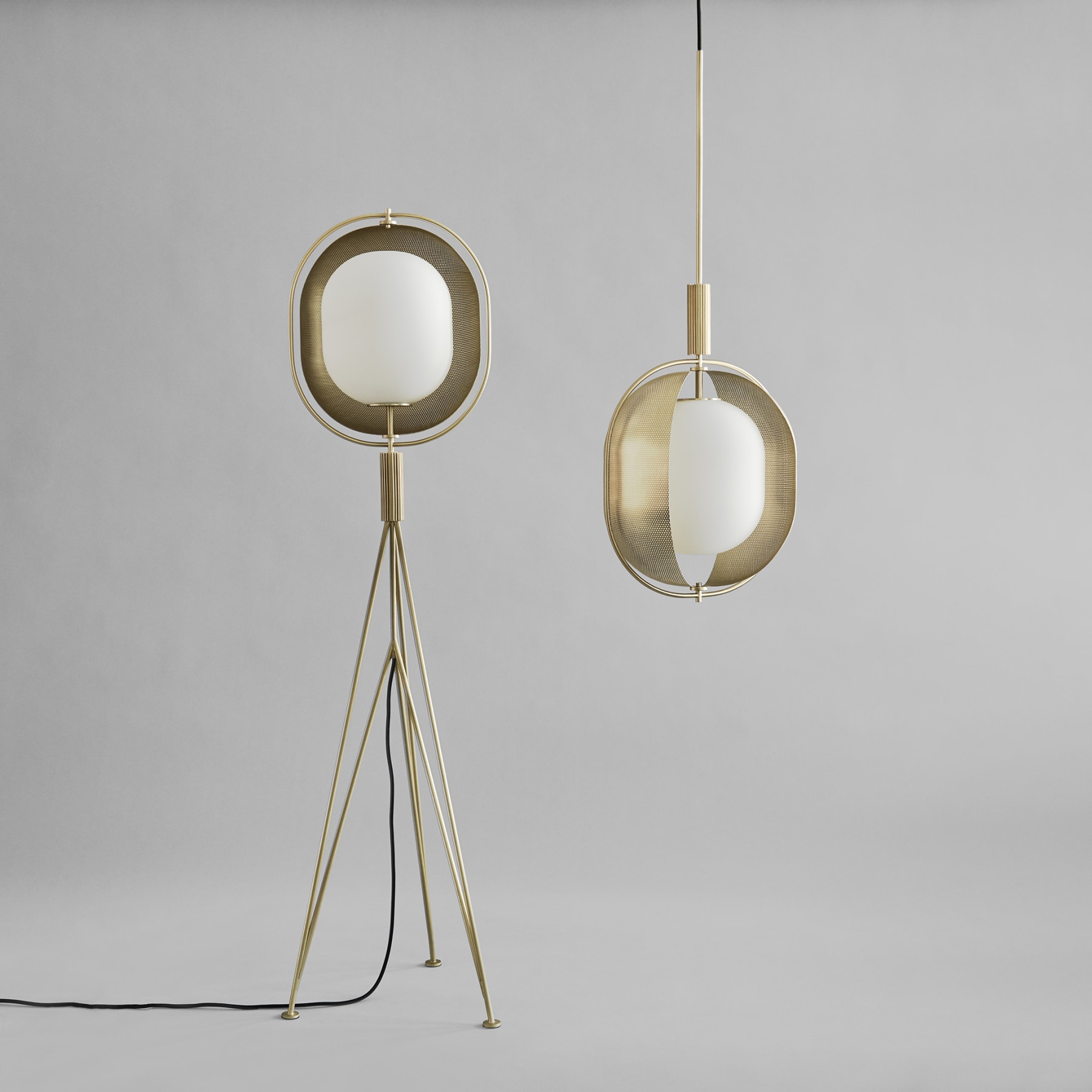 Pearl is a collection of lamps inspired by ancient Japanese lanterns. The lantern shaped light source of opal glass is half hidden behind a flexible metal screen. The perforated metal screen filters the light and can be turned around to create unique lighting installations. The lampshade is mounted to a sleek metal frame, adding a certain lightness to the lamp. Pearl is made of plated metal subsequent hand brushed and comes in a pendant and floor lamp. Designed by Kristian Sofus Hansen & Tommy Hyldahl.View assembly guide here.
