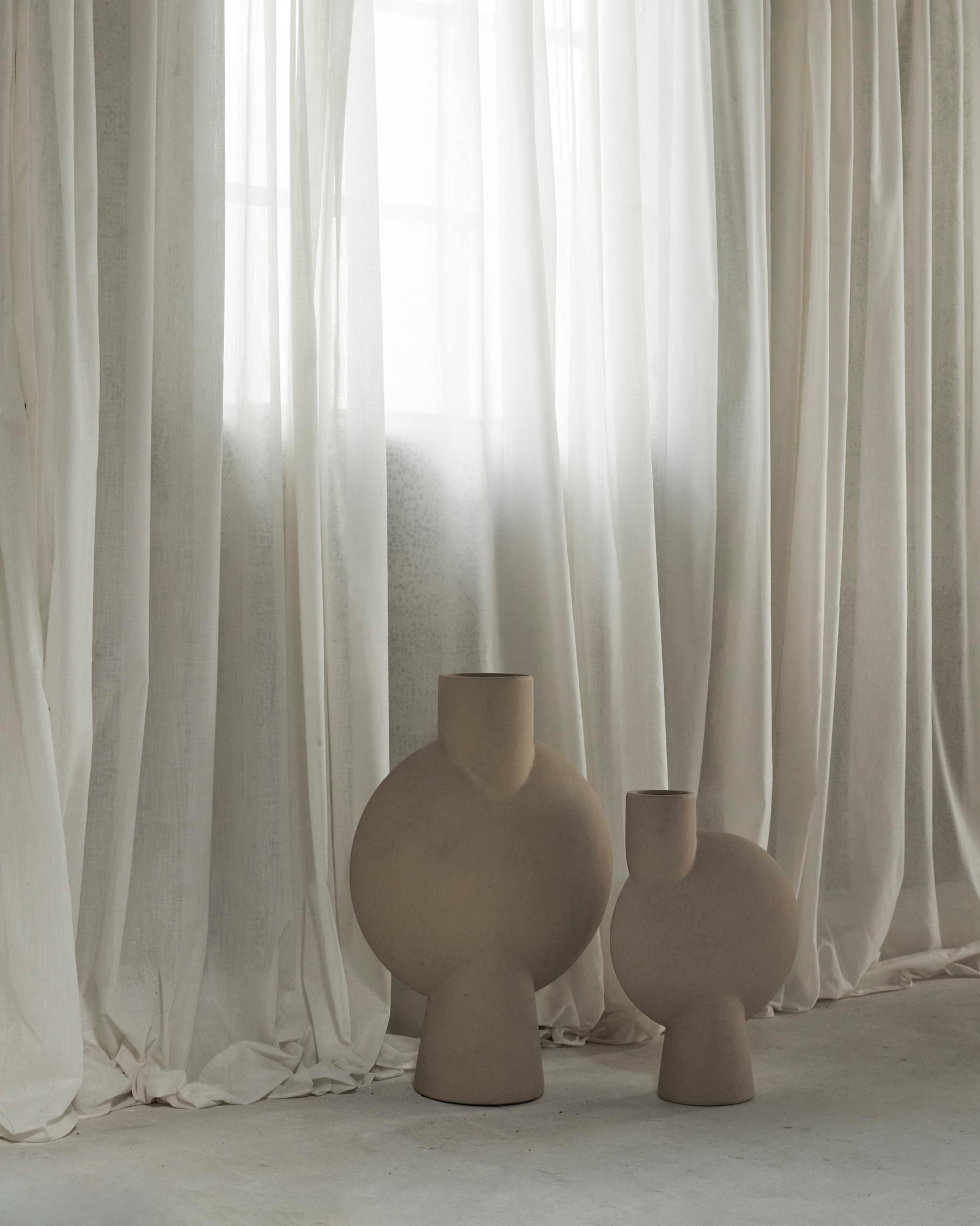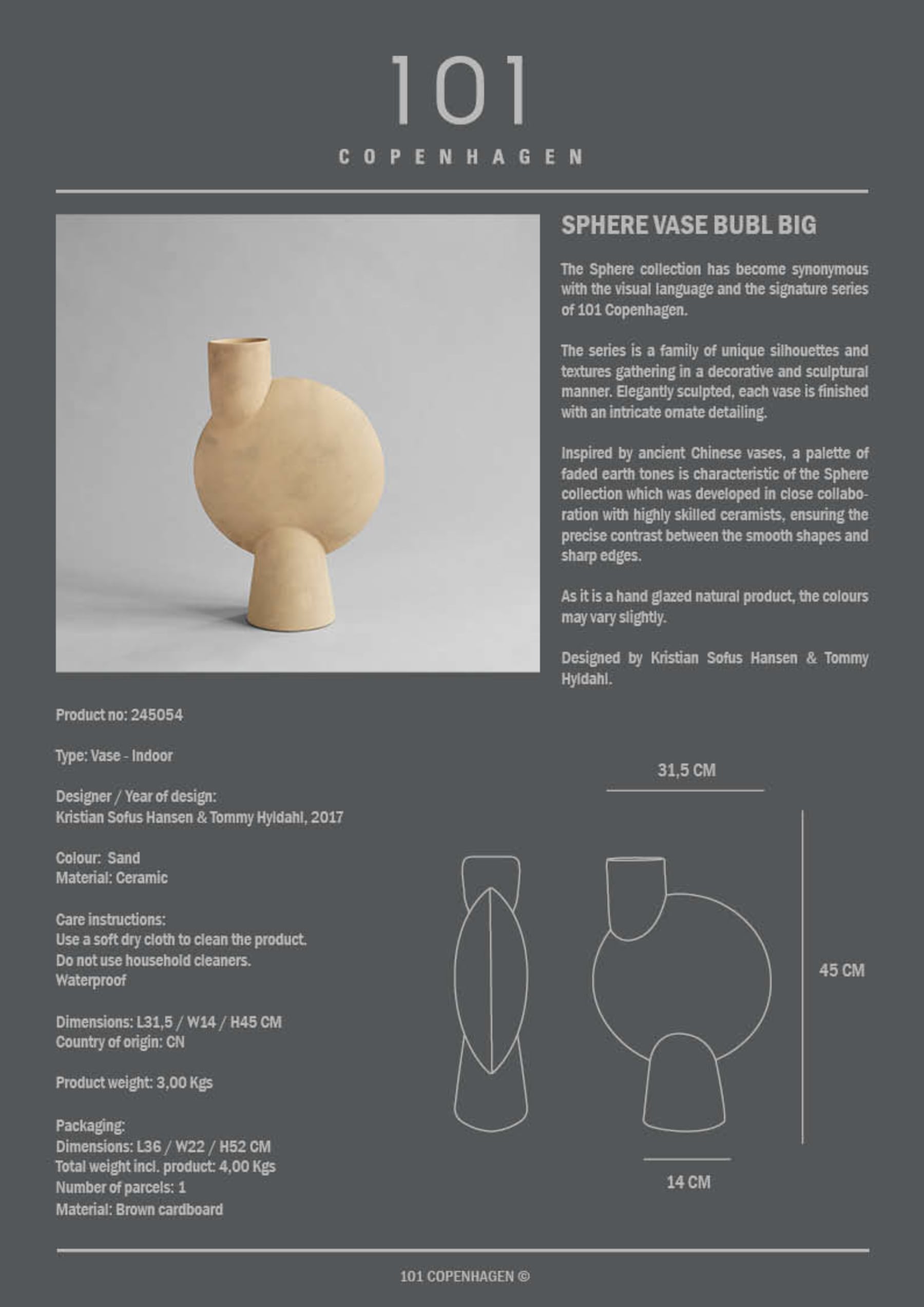 The Sphere collection has become synonymous with the visual language and the signature series of 101 Copenhagen. The series is a family of unique silhouettes and textures gathering in a decorative and sculptural manner. Elegantly sculpted, each vase is finished with an intricate ornate detailing. Inspired by ancient Chinese vases, a palette of faded earth tones is characteristic of the Sphere collection which was developed in close collaboration with highly skilled ceramists, ensuring the precise contrast between the smooth shapes and sharp edges. As it is a hand glazed natural product, the colours may vary slightly and while it is not 100% waterproof, a bag for fresh flowers is included. Designed by Kristian Sofus Hansen & Tommy Hyldahl.