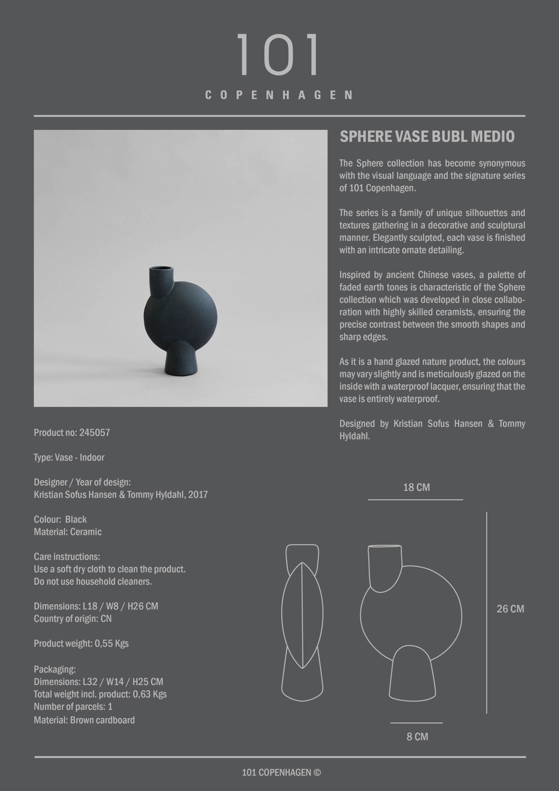The Sphere collection has become synonymous with the visual language and the signature series of 101 Copenhagen.The series is a family of unique silhouettes and textures gathering in a decorative and sculptural manner. Elegantly sculpted, each vase is finished with an intricate ornate detailing. Inspired by ancient Chinese vases, a palette of faded earth tones is characteristic of the Sphere collection which was developed in close collaboration with highly skilled ceramists, ensuring the precise contrast between the smooth shapes and sharp edges. As it is a hand glazed nature product, the colours may vary slightly and is meticulously glazed on the inside with a waterproof lacquer, ensuring that the vase is entirely waterproof.Designed by Kristian Sofus Hansen & Tommy Hyldahl.