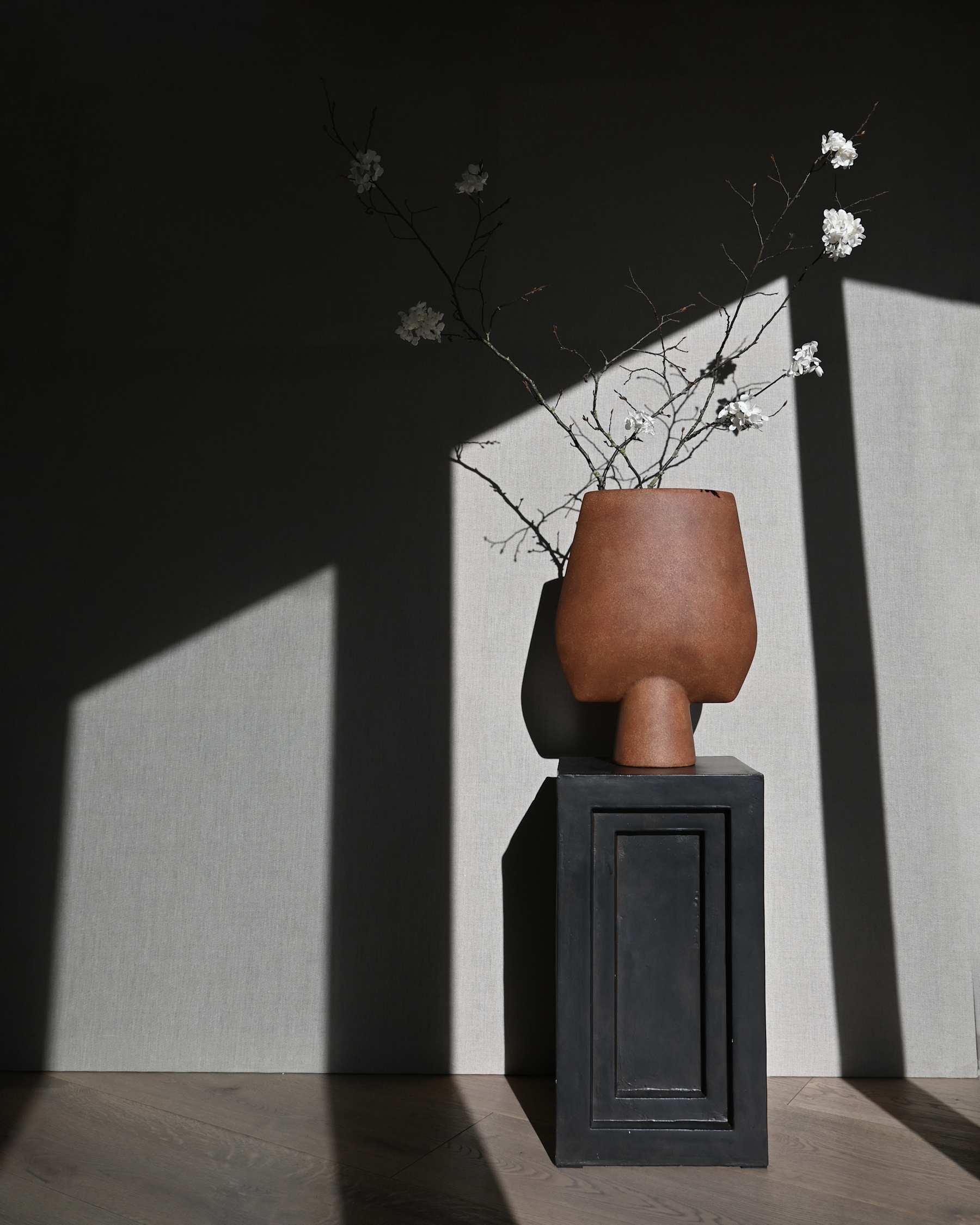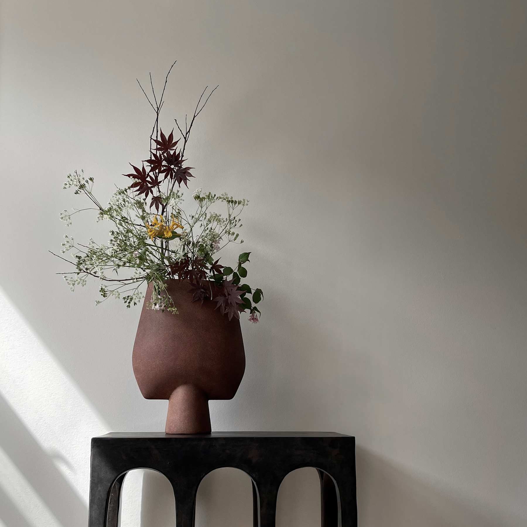 The Sphere collection has become synonymous with the visual language and the signature series of 101 Copenhagen. The series is a family of unique silhouettes and textures gathering in a decorative and sculptural manner. Elegantly sculpted, each vase is finished with an intricate ornate detailing. Inspired by ancient Chinese vases, a palette of faded earth tones is characteristic of the Sphere collection which was developed in close collaboration with highly skilled ceramists, ensuring the precise contrast between the smooth shapes and sharp edges. As it is a hand glazed natural product, the colours may vary slightly and while it is not 100% waterproof, a bag for fresh flowers is included. Designed by Kristian Sofus Hansen & Tommy Hyldahl.
