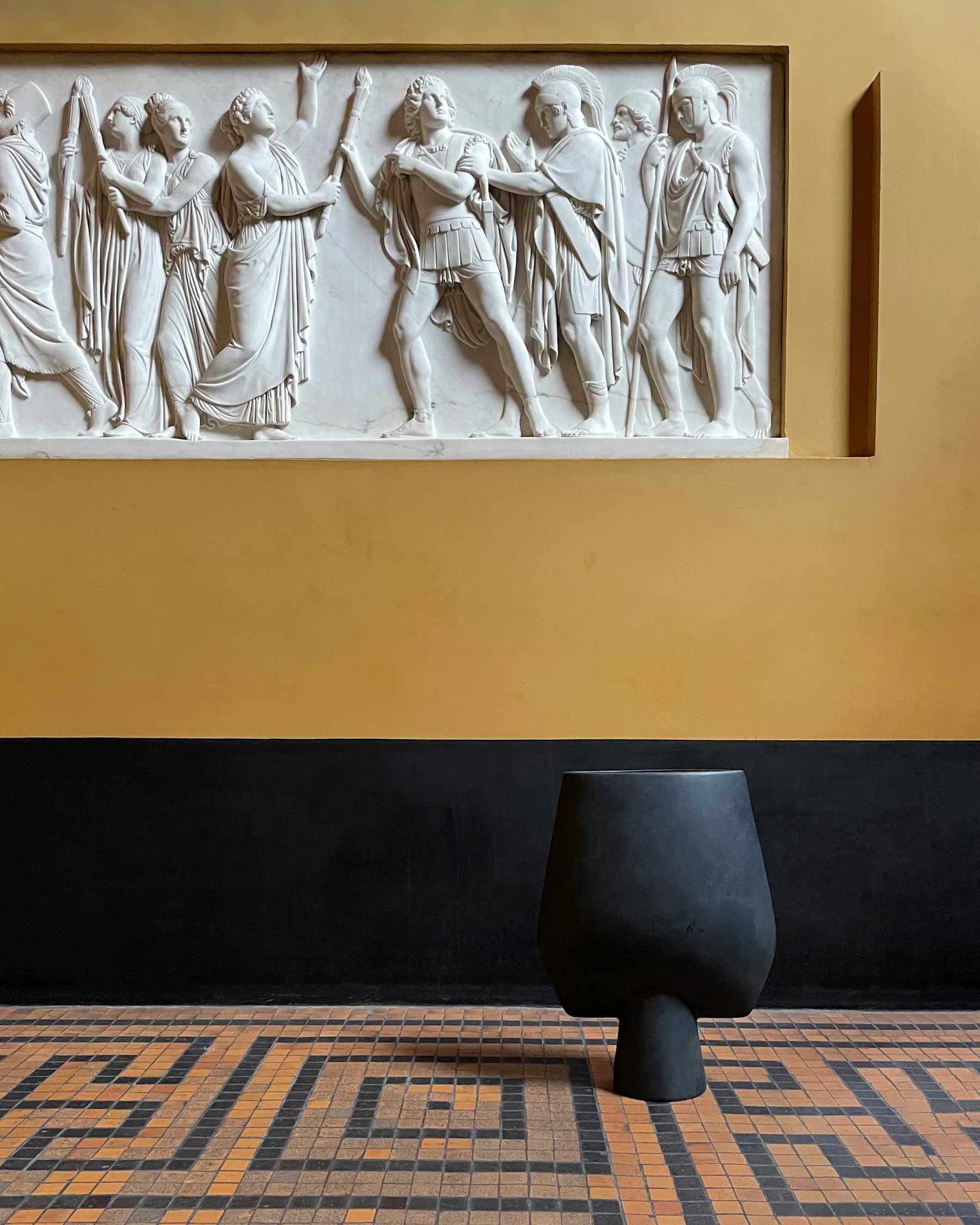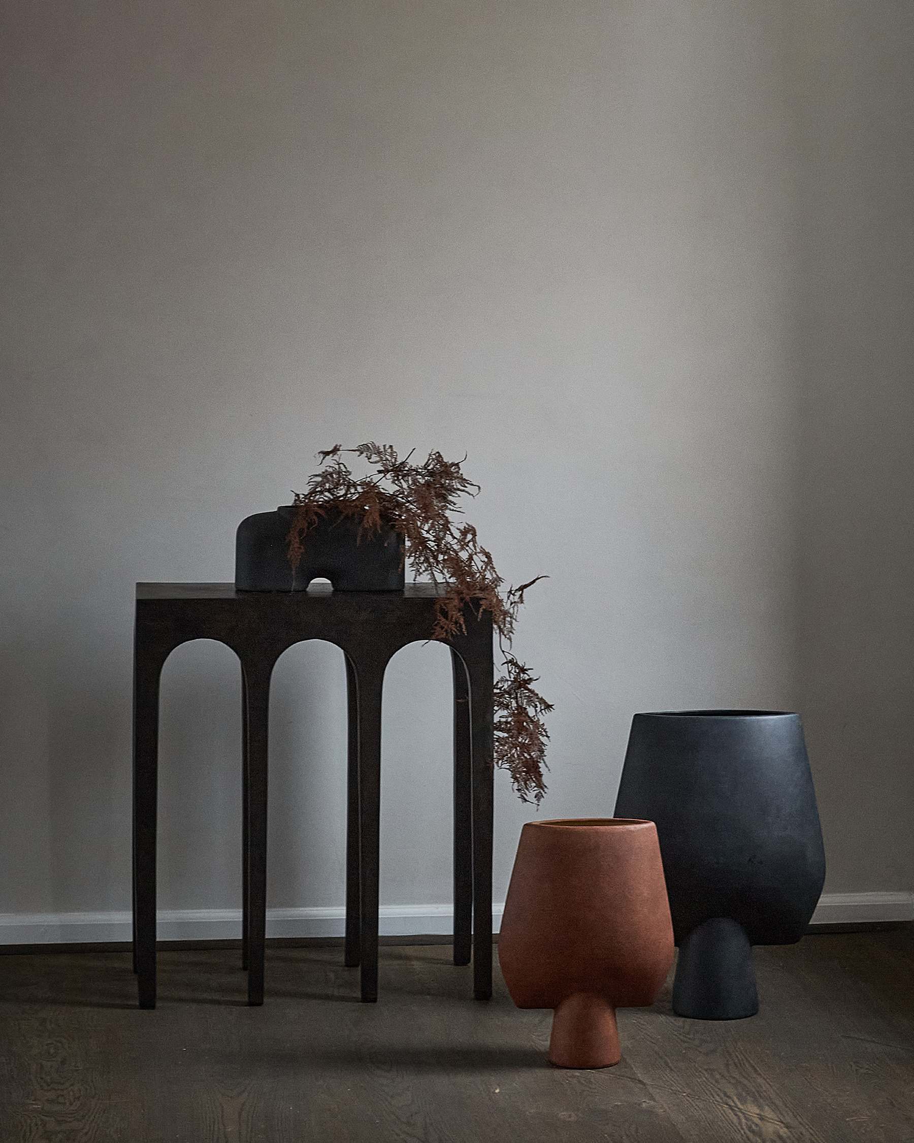 The Sphere collection has become synonymous with the visual language and the signature series of 101 Copenhagen. The series is a family of unique silhouettes and textures gathering in a decorative and sculptural manner. Elegantly sculpted, each vase is finished with an intricate ornate detailing. Inspired by ancient Chinese vases, a palette of faded earth tones is characteristic of the Sphere collection which was developed in close collaboration with highly skilled ceramists, ensuring the precise contrast between the smooth shapes and sharp edges. As it is a hand glazed natural product, the colours may vary slightly and while it is not 100% waterproof, a bag for fresh flowers is included. Designed by Kristian Sofus Hansen & Tommy Hyldahl.
