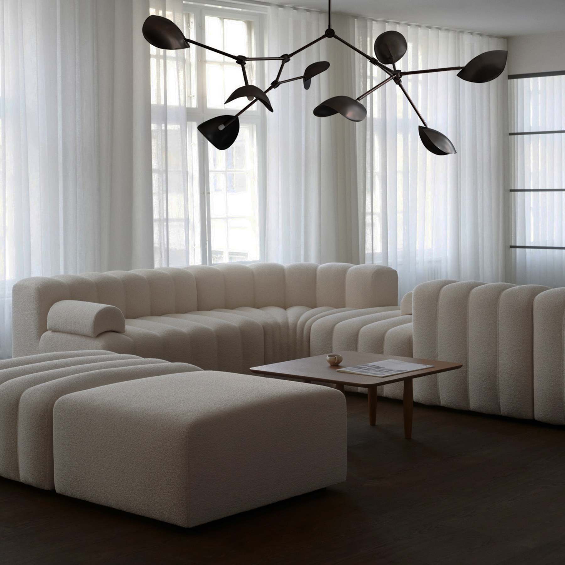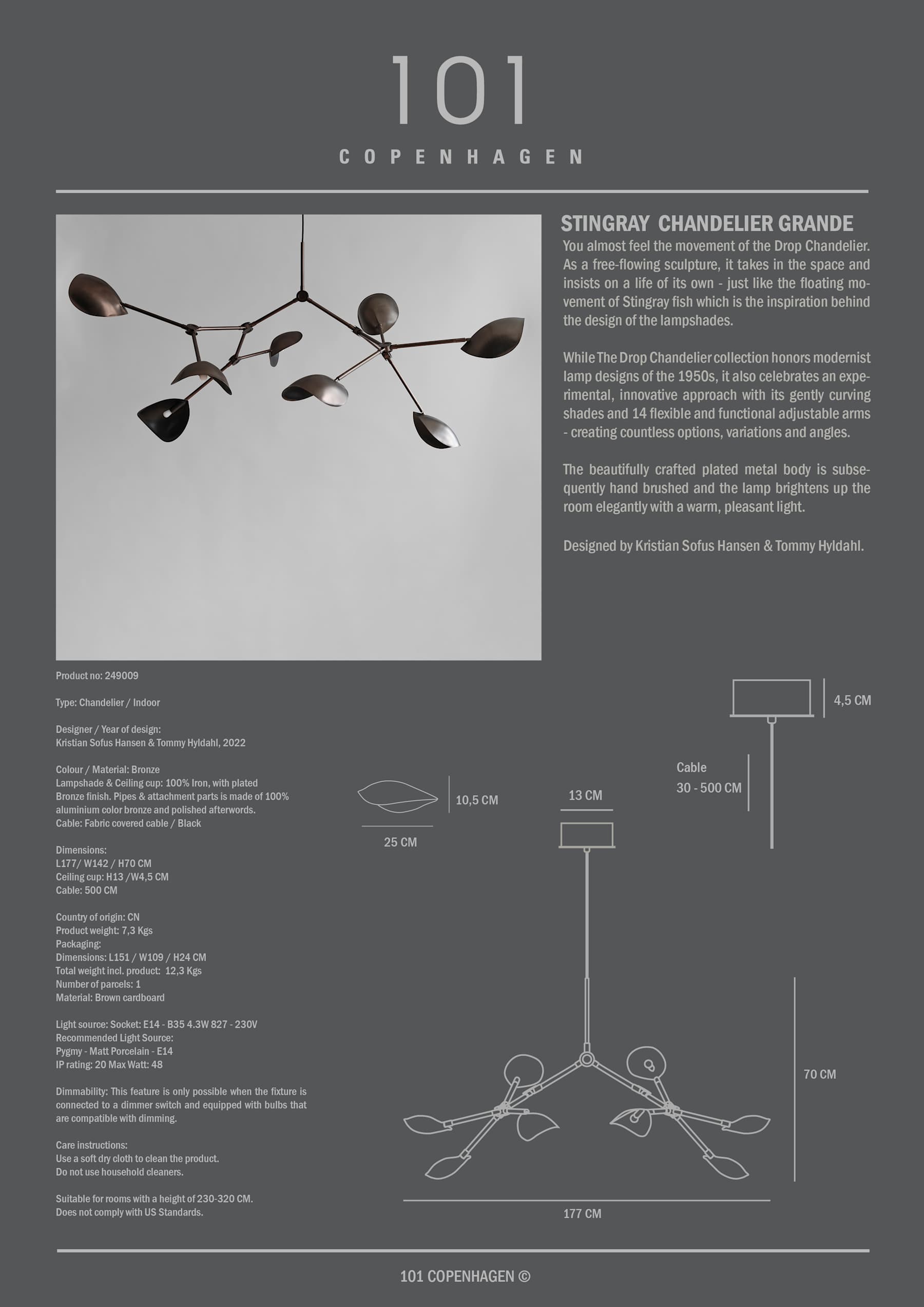 Drawing inspiration from the graceful Stingray fish, the Stingray lampshade masterfully balances soft, flowing curves with sharp, dynamic edges. Its floating silhouette becomes the captivating centerpiece of the Stingray collection, showcased in two elegant chandeliers, a refined table lamp, and a striking floor lamp. Ingeniously designed, the lampshade subtly conceals or reveals the light source depending on your perspective, creating a versatile and artistic interplay of light and shadow. The Stingray chandelier is available in three exquisite finishes: Radiant brass, timeless bronze, and bold burned black – each offering a unique character and ambiance. Designed by Kristian Sofus Hansen & Tommy Hyldahl.View assembly guide here.