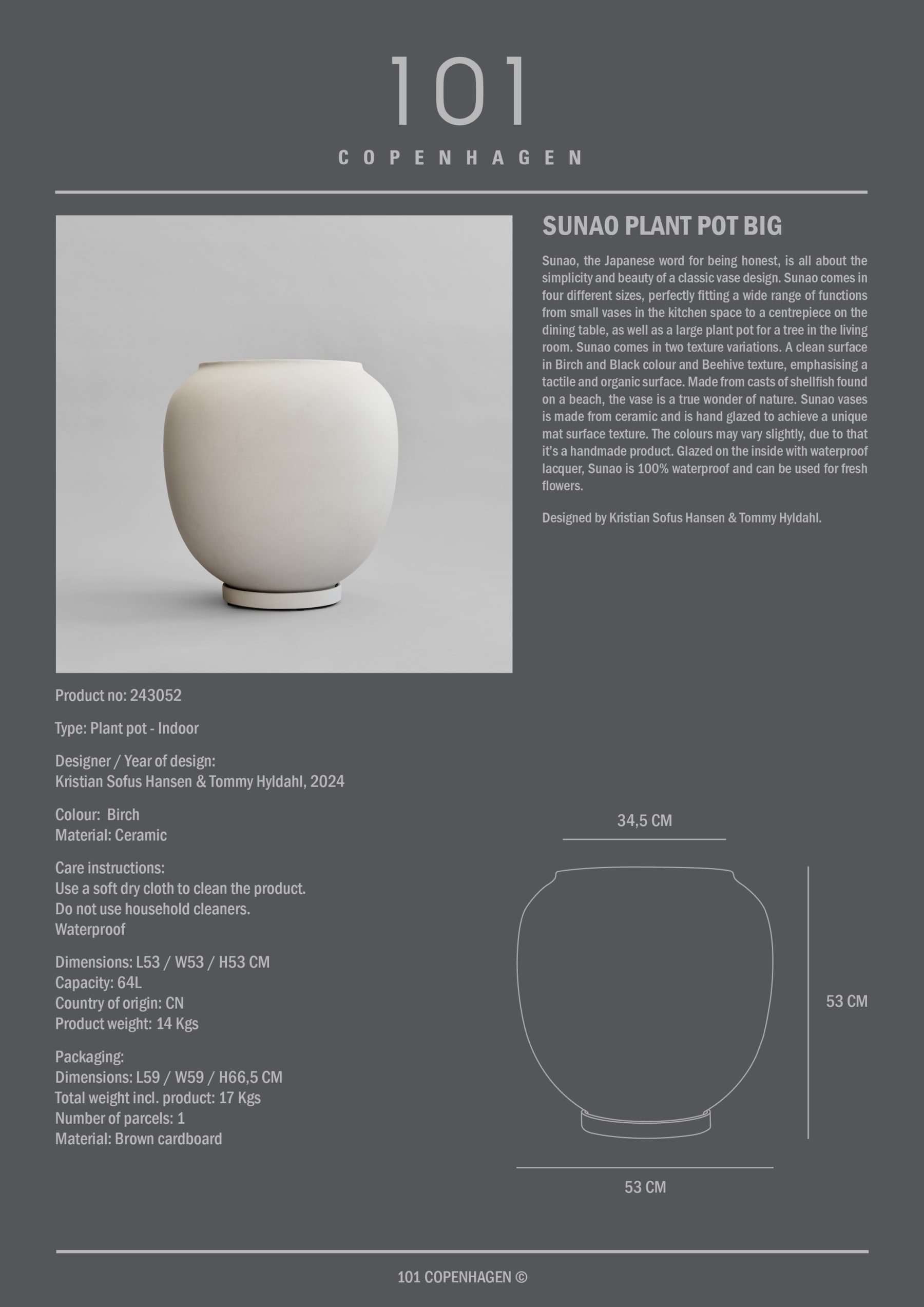 Sunao, the Japanese word for being honest, is all about the simplicity and beauty of a classic vase design. Sunao comes in four different sizes, perfectly fitting a wide range of functions from small vases in the kitchen space to a centrepiece on the dining table, as well as a large plant pot for a tree in the living room. Sunao comes in two texture variations. A clean surface in Birch and Black colour and Beehive texture, emphasising a tactile and organic surface. Made from casts of shellfish found on a beach, the vase is a true wonder of nature. Sunao vases is made from ceramic and is hand glazed to achieve a unique mat surface texture. The colours may vary slightly, due to that it’s a handmade product. Glazed on the inside with waterproof lacquer, Sunao is 100% waterproof and can be used for fresh flowers.Designed by Kristian Sofus Hansen & Tommy Hyldahl.