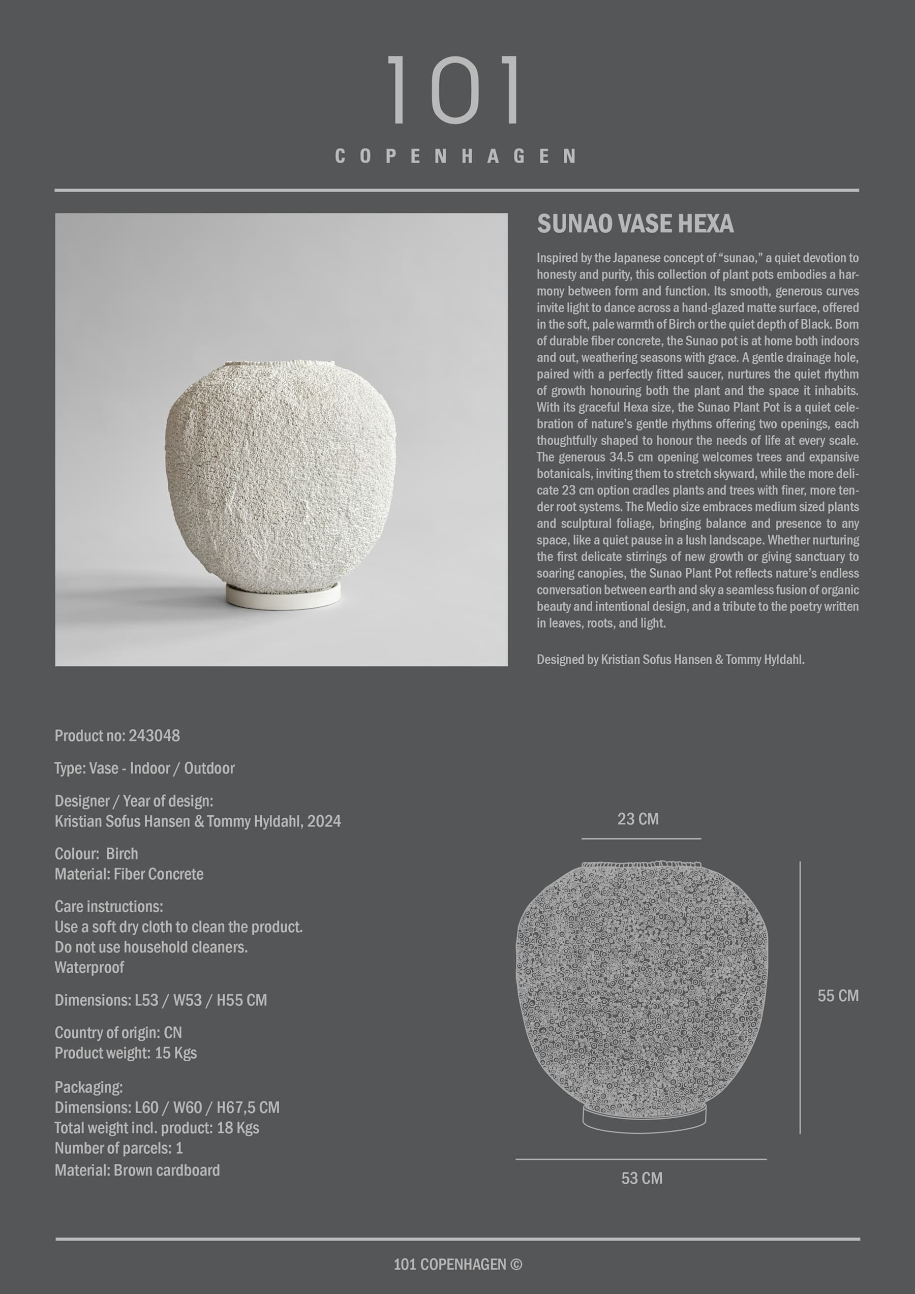 Sunao, the Japanese word for being honest, is all about the simplicity and beauty of a classic vase design. Sunao comes in four different sizes, perfectly fitting a wide range of functions from small vases in the kitchen space to a centrepiece on the dining table, as well as a large plant pot for a tree in the living room. Sunao comes in two texture variations. A clean surface in Birch and Black colour and Beehive texture, emphasising a tactile and organic surface. Made from casts of shellfish found on a beach, the vase is a true wonder of nature. Sunao vases is made from ceramic and is hand glazed to achieve a unique mat surface texture. The colours may vary slightly, due to that it’s a handmade product. Glazed on the inside with waterproof lacquer, Sunao is 100% waterproof and can be used for fresh flowers.Designed by Kristian Sofus Hansen & Tommy Hyldahl.