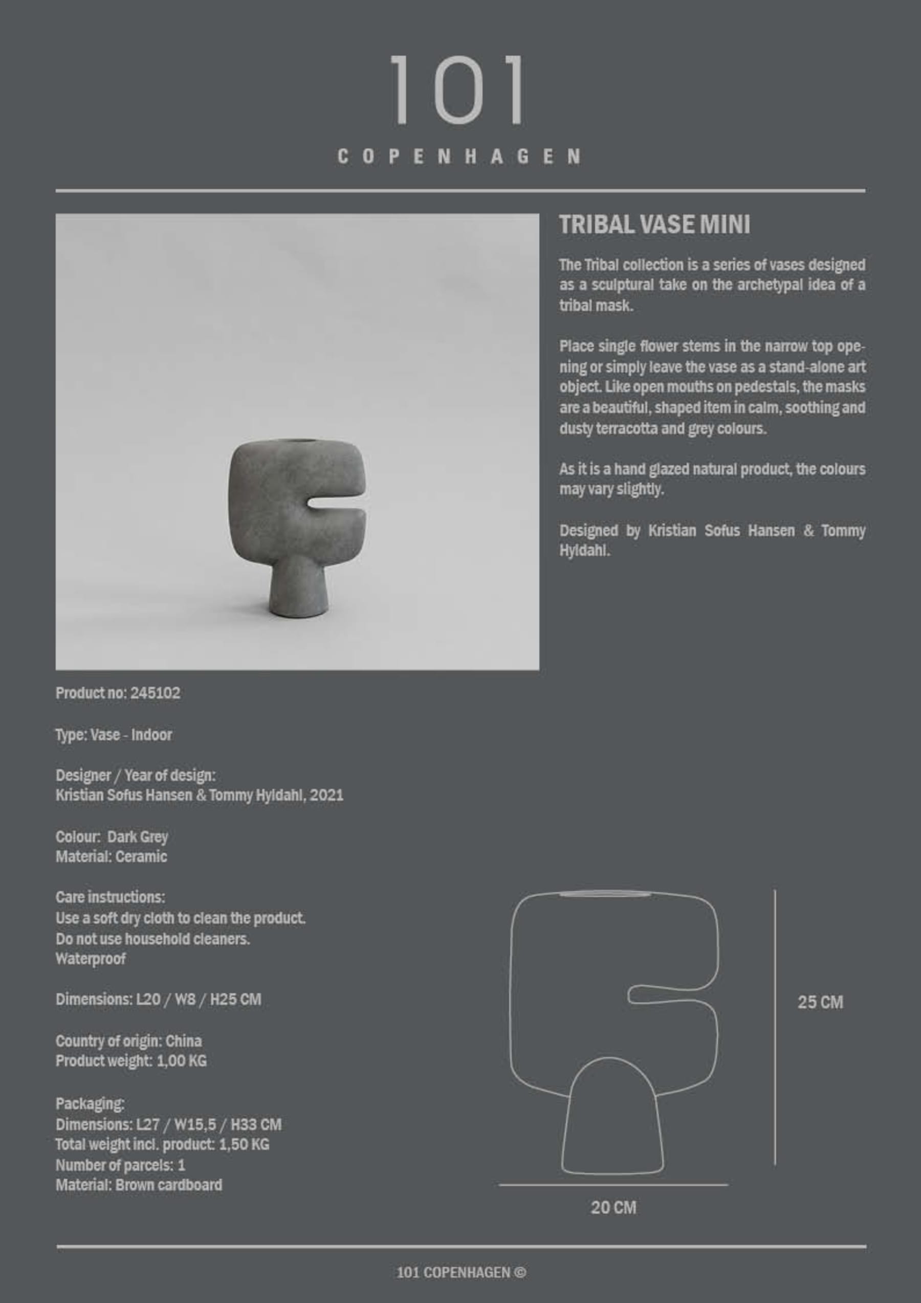 The Tribal collection is a series of vases designed as a sculptural take on the archetypal idea of a tribal mask. Place single flower stems in the narrow top opening or simply leave the vase as a standalone art object. Like open mouths on pedestals, the masks are a beautiful shaped item in calm, soothing and dusty terracotta and grey colours. As it is a hand glazed natural product, the colours may vary slightly and while it is not 100% waterproof, a bag for fresh flowers is included. Designed by Kristian Sofus Hansen & Tommy Hyldahl.Made of ceramic.