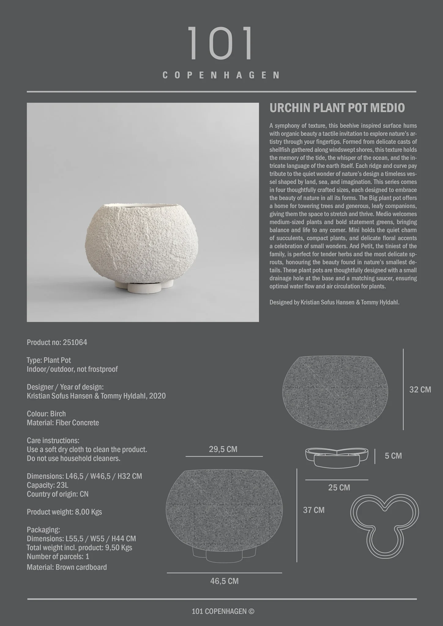 Inspired by the unique shape of a sea urchin, the Urchin collection features a large oval pot elegantly positioned on three characteristic legs. This innovative design reimagines the traditional plant pot saucer, incorporating a waterproof base that captures excess water while allowing your plants to breathe. Each plant pot showcases our distinctive Beehive texture, highlighting a tactile and organic surface. Crafted from casts of shellfish found along the shore, the Urchin vases are a celebration of nature and the beauty of time standing still. The Urchin collection is available in four sizes, with each piece consisting of a plant pot and a matching saucer. Both components are waterproof, and a small drainage hole in the bottom of the pot ensures optimal water and air flow for your plants. Designed by Kristian Sofus Hansen & Tommy Hyldahl.