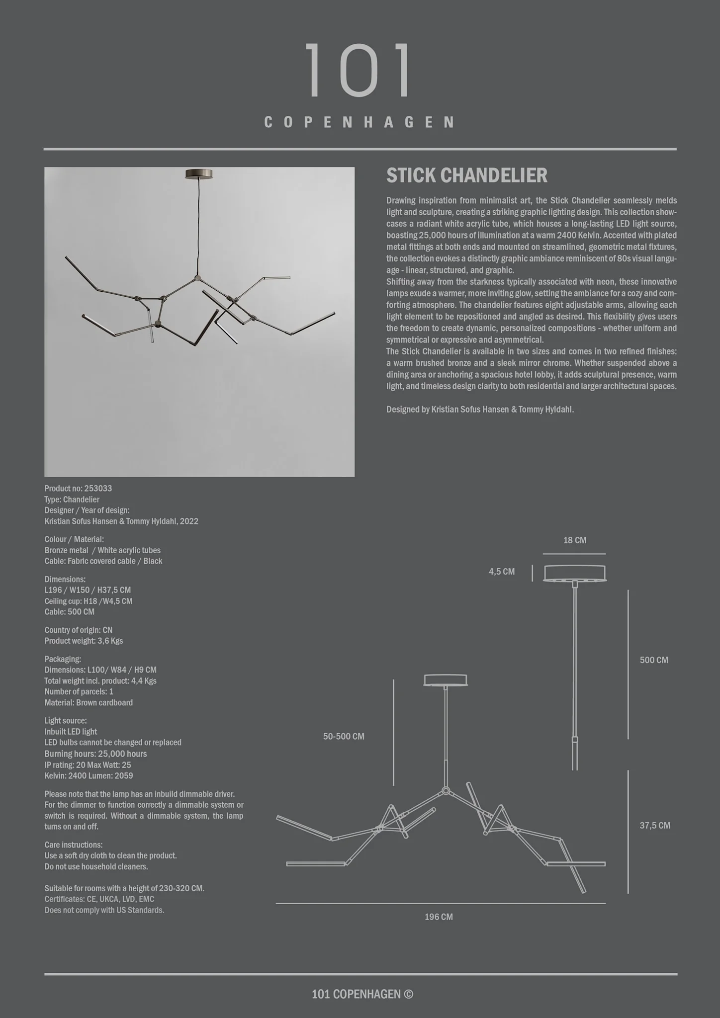 Drawing inspiration from minimalist art, the Stick Chandelier seamlessly melds light and sculpture, creating a striking graphic lighting design. This collection showcases a radiant white acrylic tube, which houses a long-lasting LED light source, boasting 25,000 hours of illumination at a warm 2400 Kelvin. Accented with plated metal fittings at both ends and mounted on streamlined, geometric metal fixtures, the collection evokes a distinctly graphic ambiance reminiscent of 80s visual language – linear, structured, and graphic.