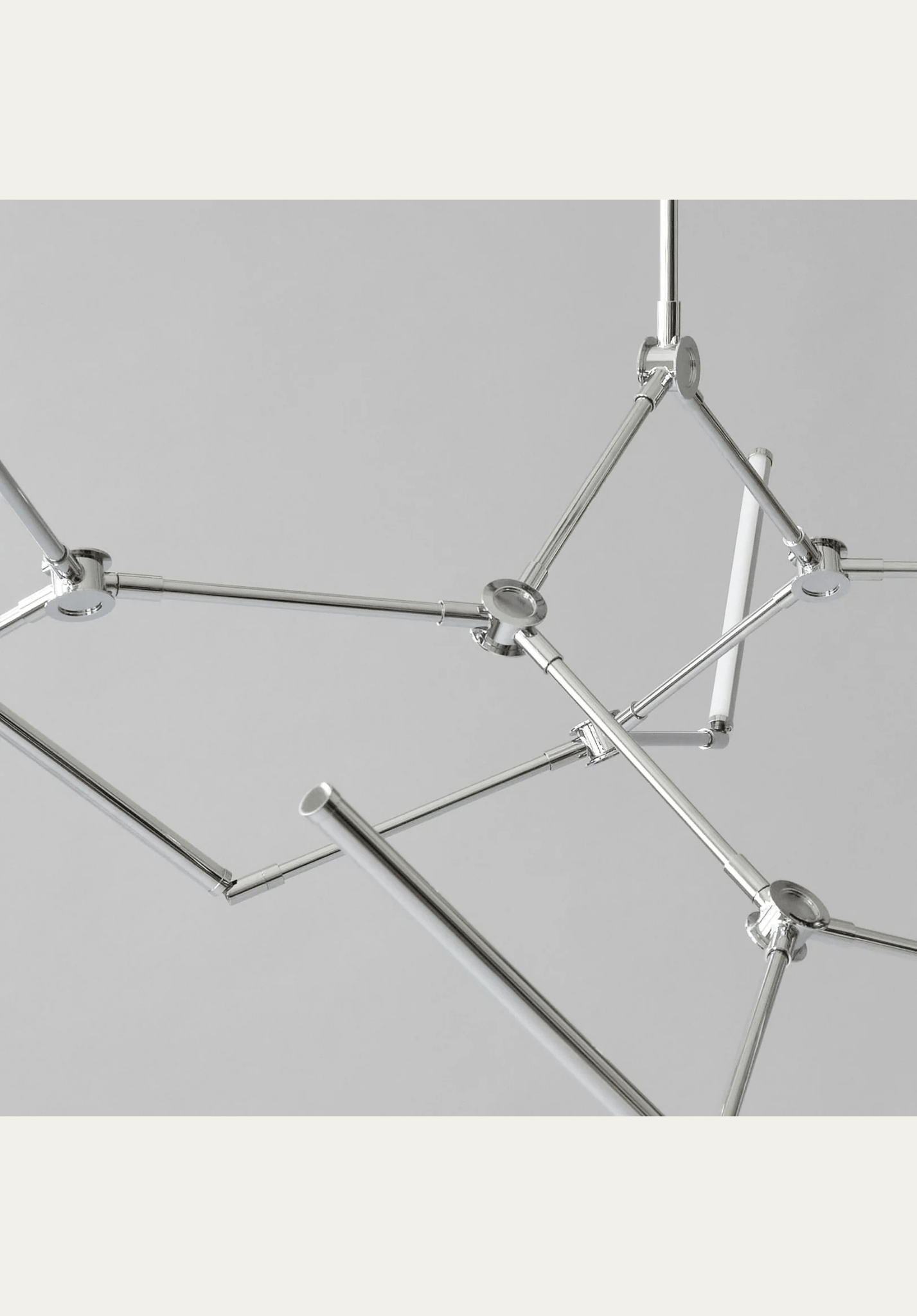 The Stick Chandelier is available in two sizes and comes in two refined finishes: a warm brushed bronze and a sleek mirror chrome. Whether suspended above a dining area or anchoring a spacious hotel lobby, it adds sculptural presence, warm light, and timeless design clarity to both residential and larger architectural spaces.