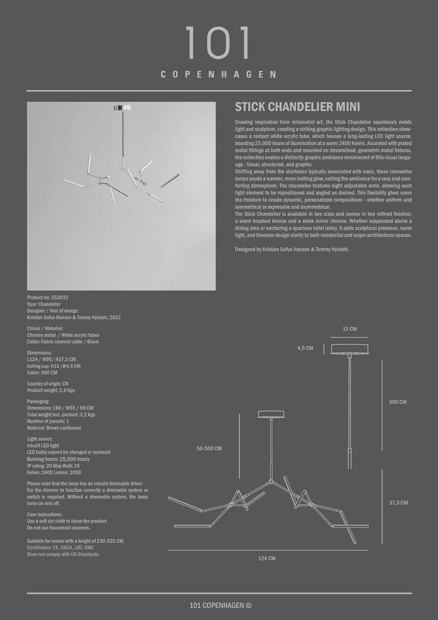 Drawing inspiration from minimalist art, the Stick Chandelier seamlessly melds light and sculpture, creating a striking graphic lighting design. This collection showcases a radiant white acrylic tube, which houses a long-lasting LED light source, boasting 25,000 hours of illumination at a warm 2400 Kelvin. Accented with plated metal fittings at both ends and mounted on streamlined, geometric metal fixtures, the collection evokes a distinctly graphic ambiance reminiscent of 80s visual language – linear, structured, and graphic.