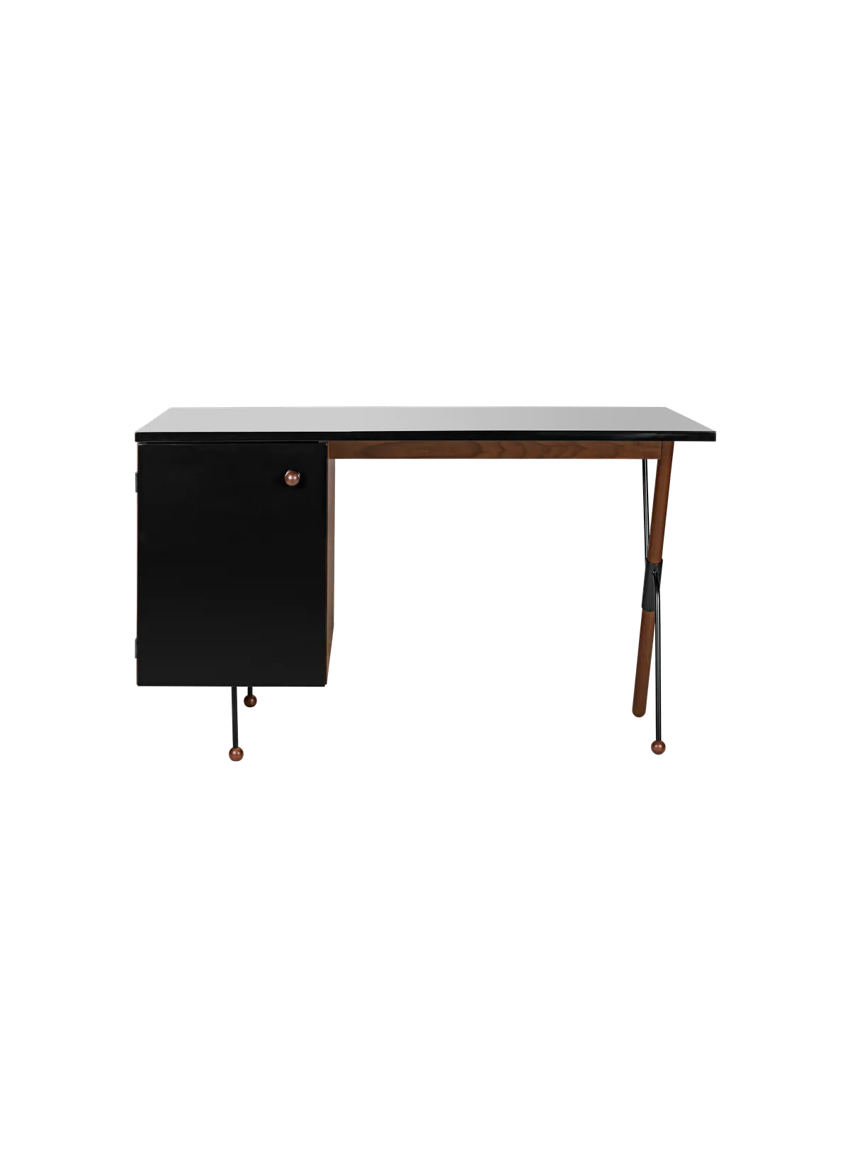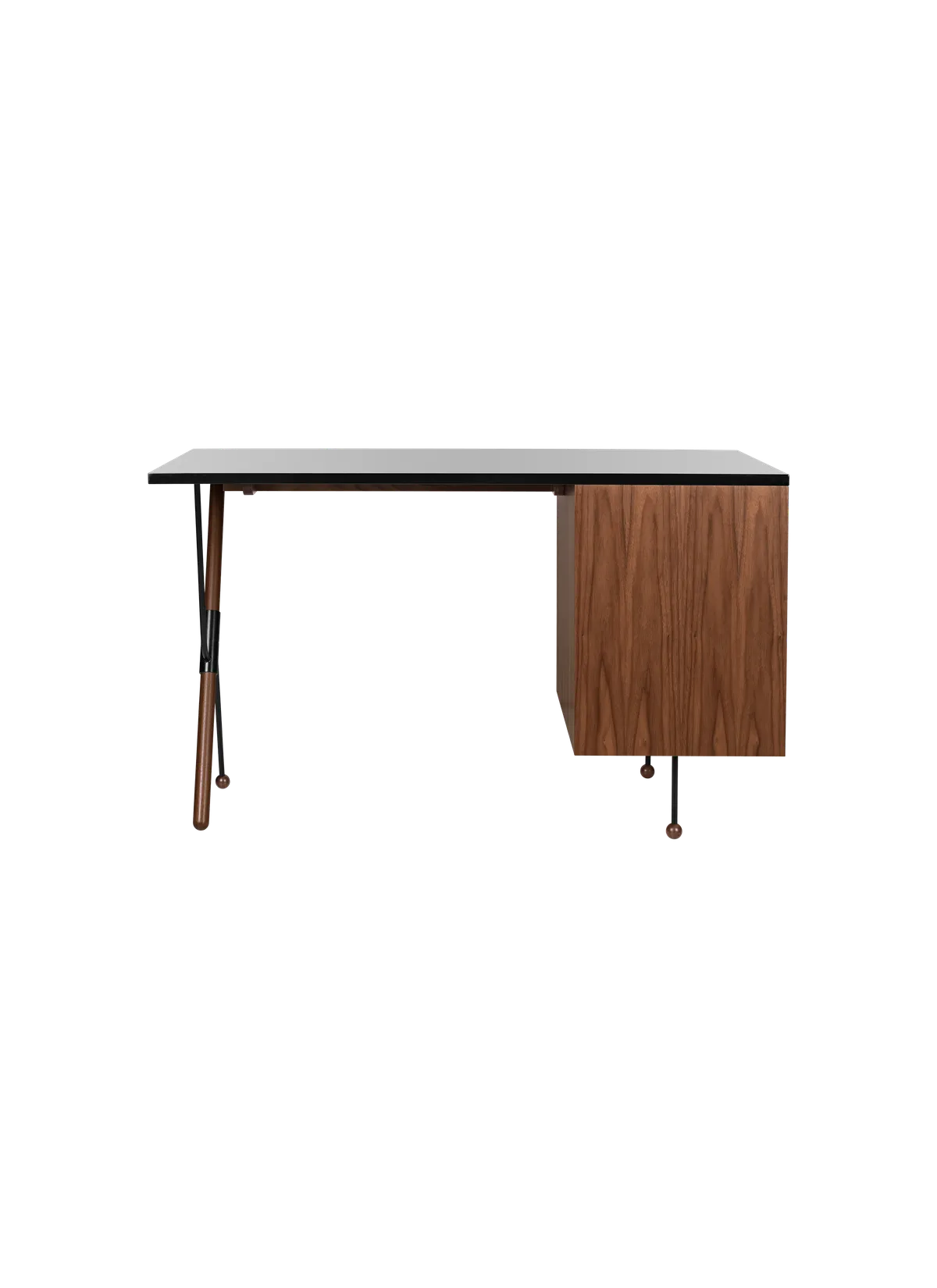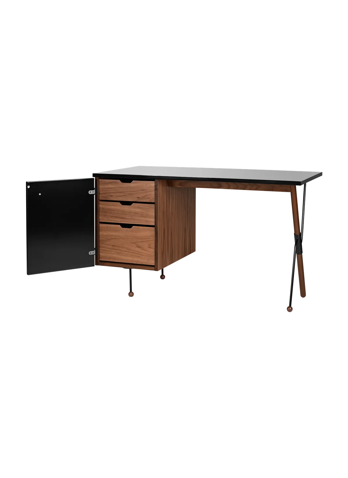Designed in 1952 by Greta M. Grossman, but named the 62 Desk as it was deemed to be ten years ahead of its time. The 62 Desk appears characteristically light in weight and appears to defy gravity with its quirky asymmetric line and slender metal legs balancing on small wooden feet, a characteristic trait of its designer. Its exceptional shape is emphasized with the elegant pairing of materials. The desk is made in American walnut and provided with a deep, black full gloss finish on tabletop and cabinet door. The desk features one left cabinet comprising of two low drawers and one high drawer.