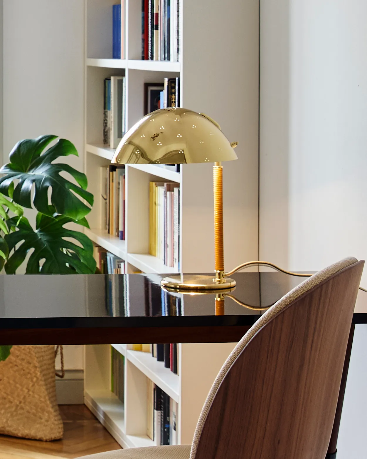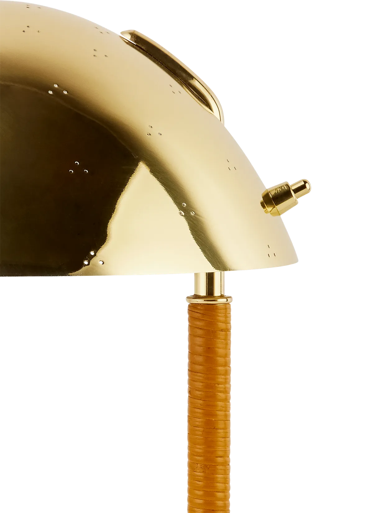 One of the iconic pieces launched during Tynell’s tenure at Taito, the 9209 was first produced in 1940.Held in place by a curved brass arm, the individually molded shade is decorated with triangular patterns of perforation – a Tynell decorative signature – which requires a specialist punch tool and the utmost precision to achieve by hand.