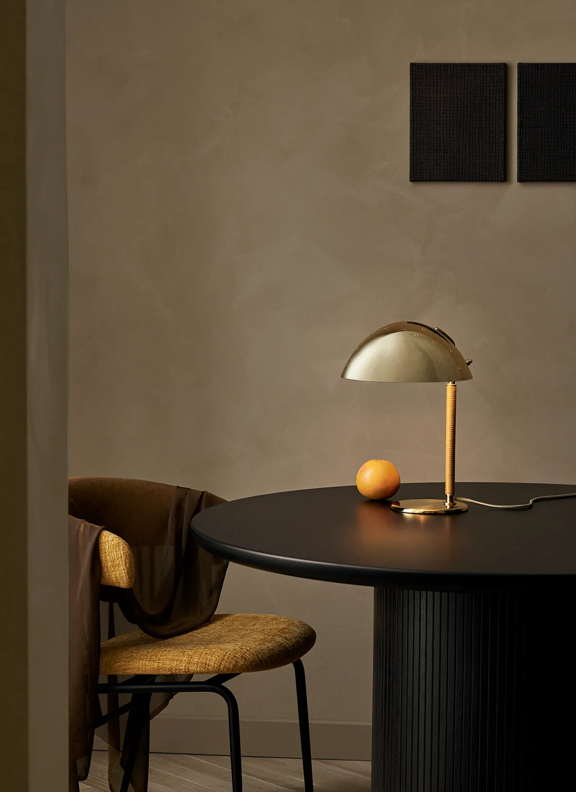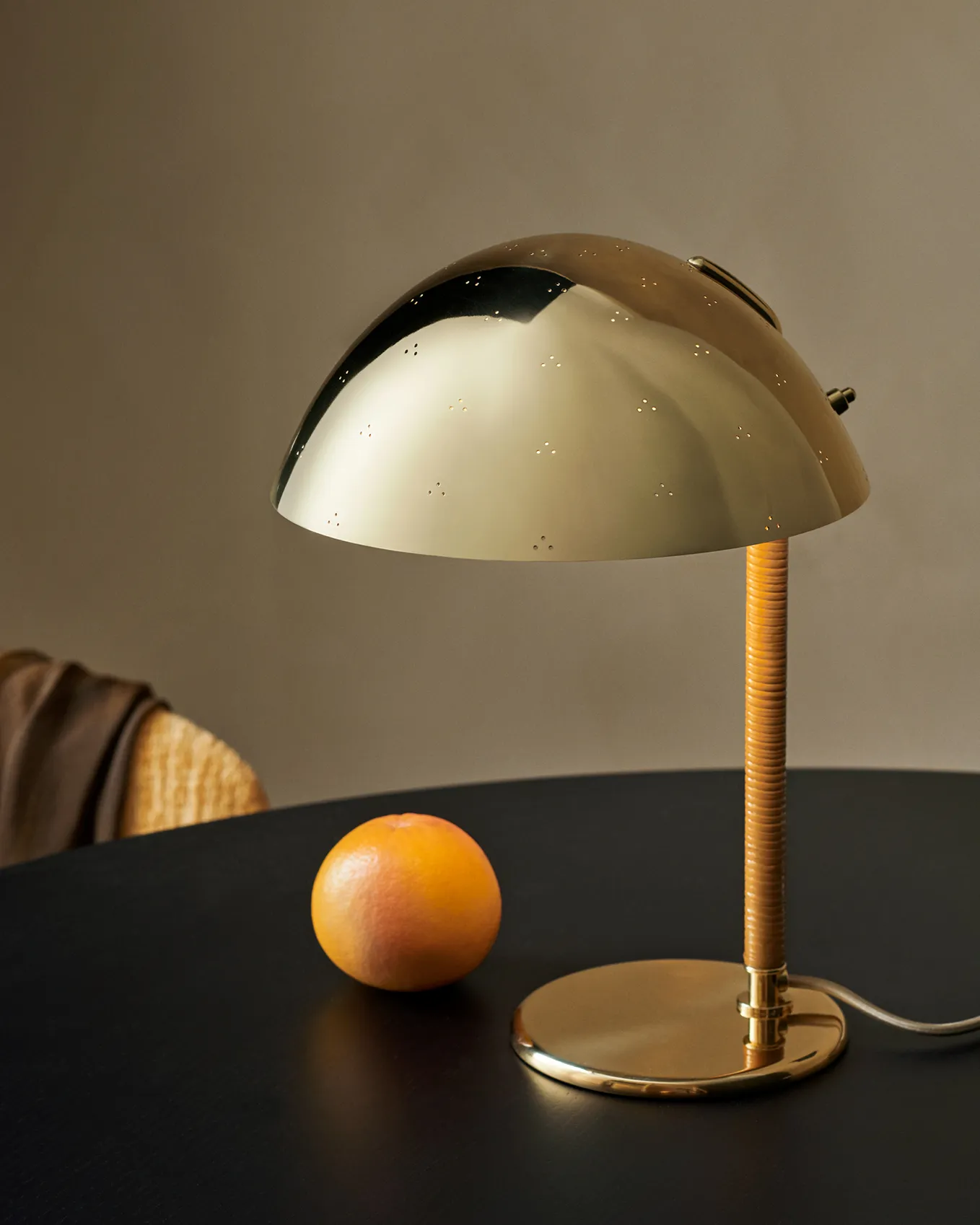 One of the great industrial designers and metal craftsmen of the 20th century, Tynell came into the world at precisely the right time to become one of the pioneers of modern lighting; as the electric light spread across the world, so too did Tynell’s design visions. The 9209 has a distinctively shaped shade in spun brass that has led to it being referred to as the ‘Kypärä’ – the Finnish word for ‘helmet’. Held in place by a curved brass arm, the individually molded shade is decorated with triangular patterns of perforation – a Tynell decorative signature – which requires a specialist punch tool and the utmost precision to achieve by hand. As well as guiding the light downward, thanks to the holes punched in the surface, the shade also allows pinpricks of light through, creating a soft, textured glow and a starlight-like sparkle.