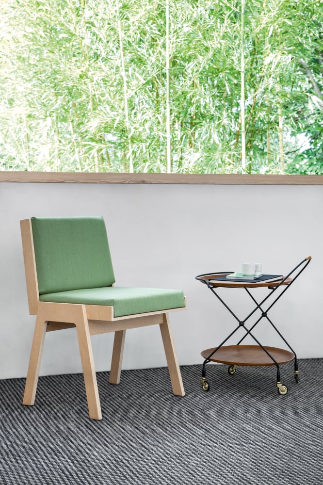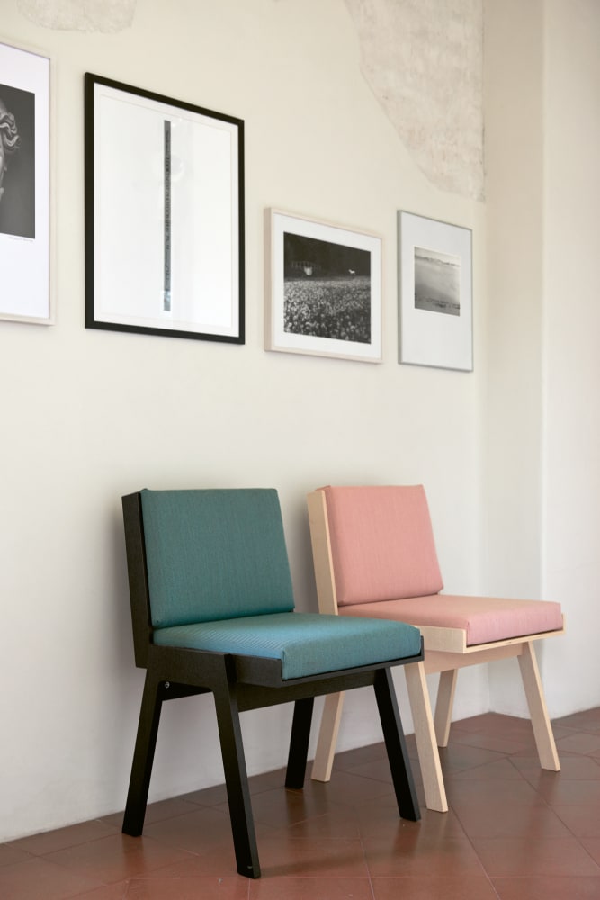 Chair without armrests, standard upholstery. Seat and backrest padded with cotton cushions, available in eight different colors. Frame realized in birch plywood with oak finish.