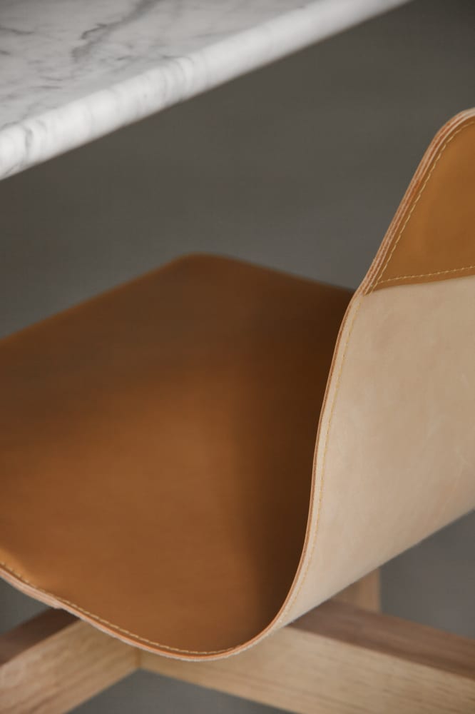 A comfortable chair made of traditional materials like wood and leather featuring simple but elegant construction details. A stool with three rectangular-sectioned legs, two front legs at the sides and a central leg at the rear, joined together by a solid T-shaped cross structure, which is as stable as a traditional chair with four legs.