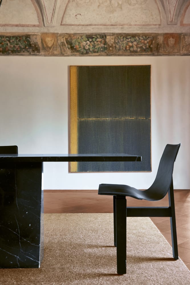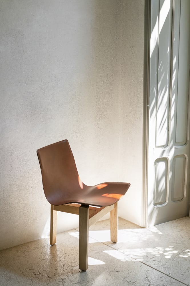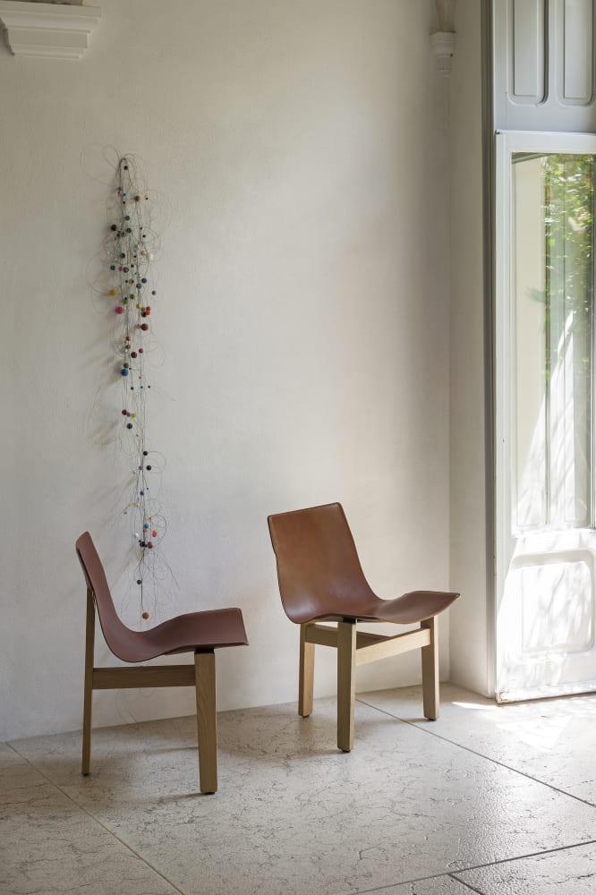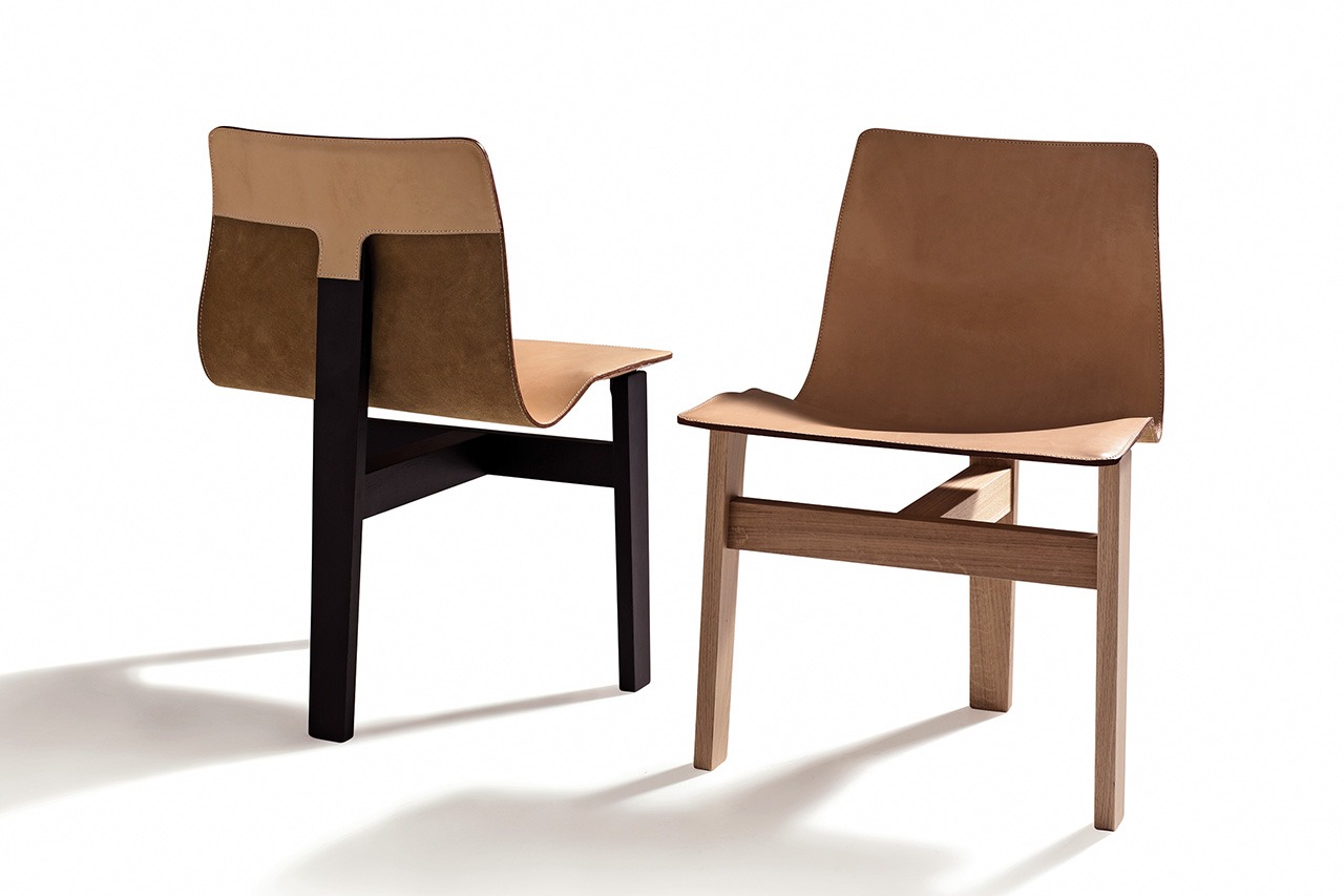 Tre 3, a piece of leather has been placed in the high rear leg which gently descends to smoothly and seamlessly give shape to the back and seat. This is a rereading of a kind of chair previously created by leading figures of Nordic design. The “3T” chair took Angelo Mangiarotti closer to the work of another great 20th-century maestro, Carlo Scarpa, who influenced all those designers who believed attention to detail was something to be explored and honoured.