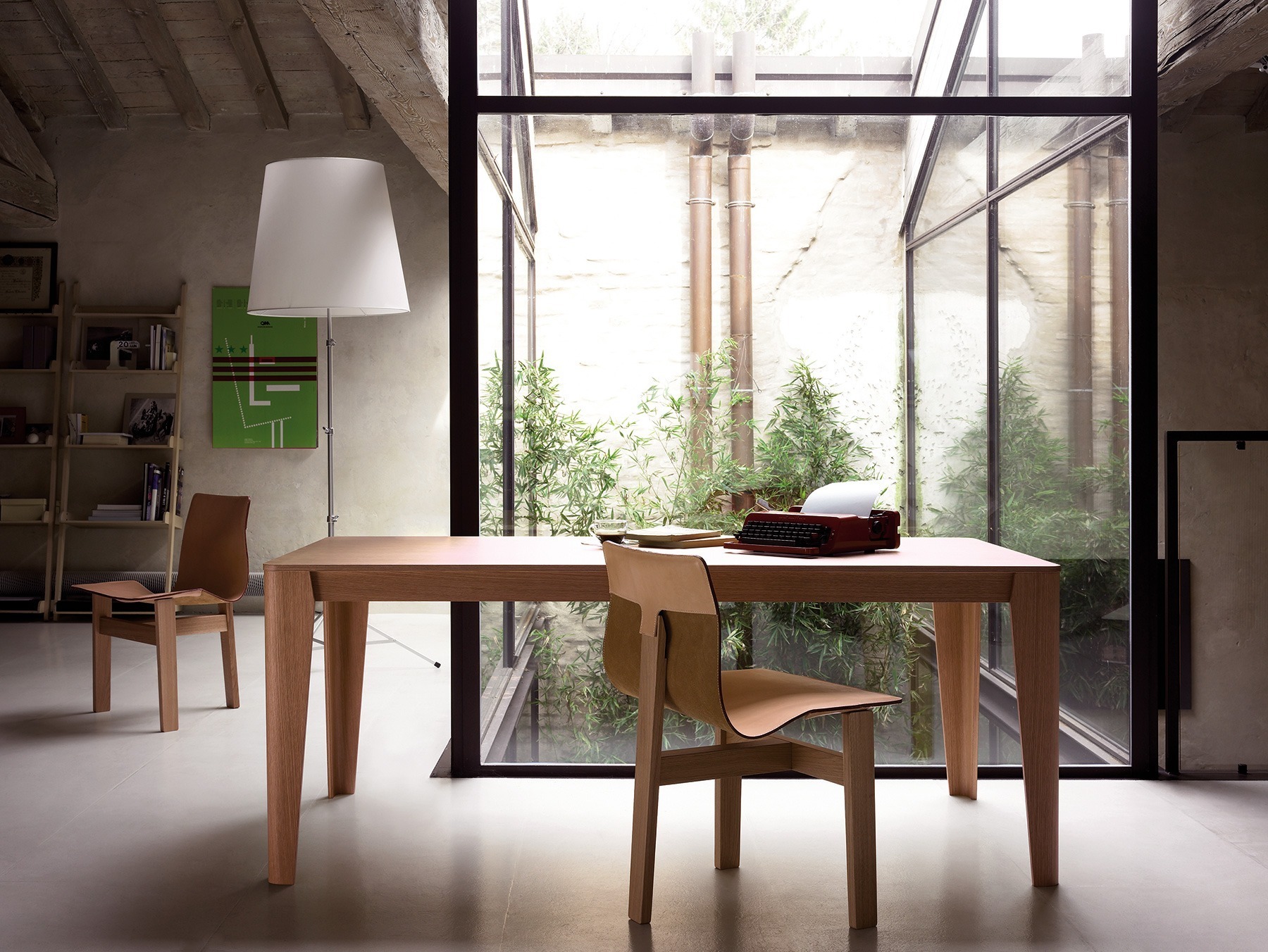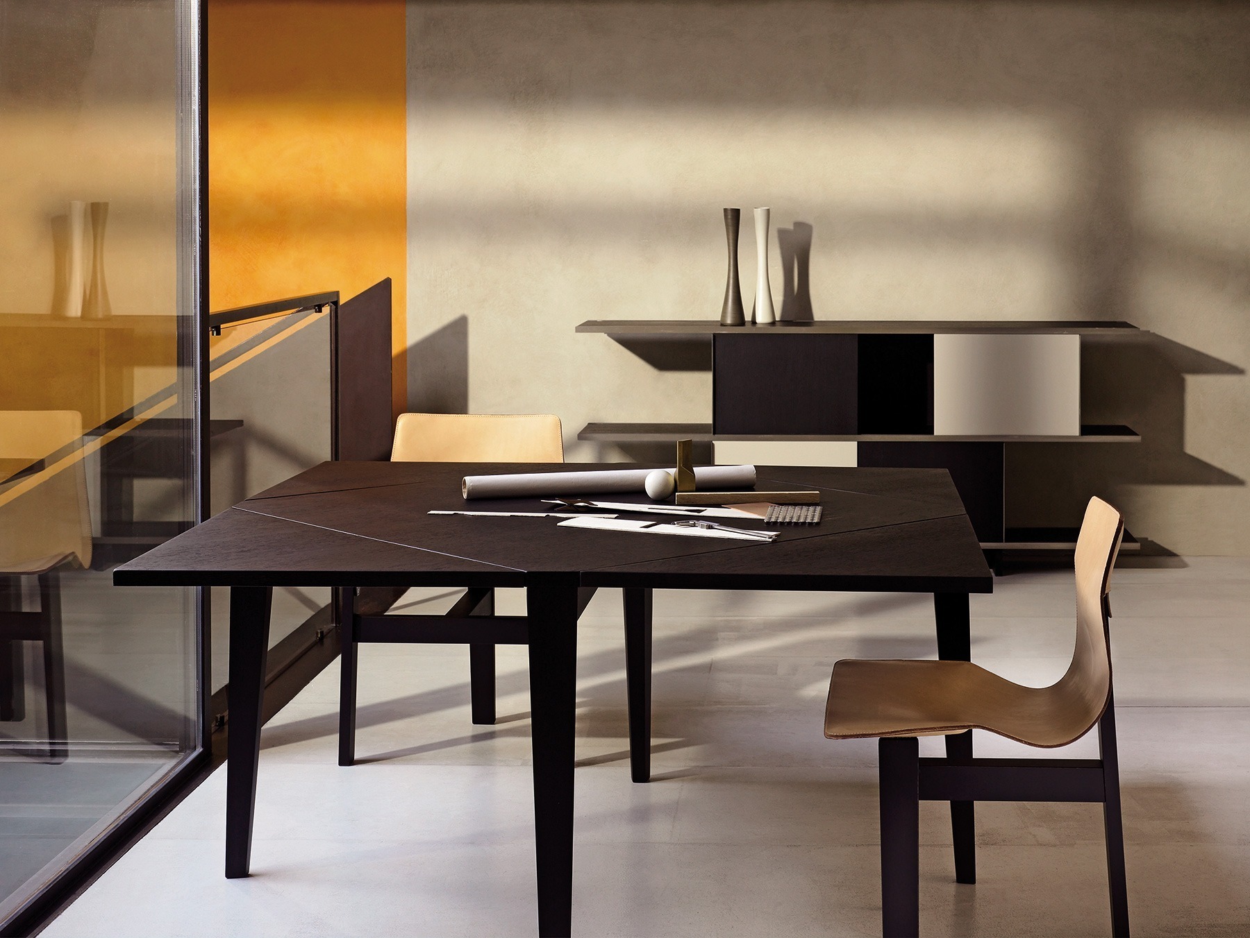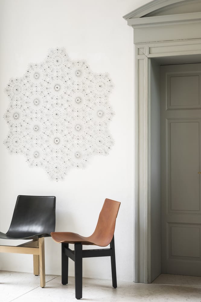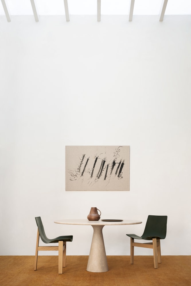 Tre 3, a piece of leather has been placed in the high rear leg which gently descends to smoothly and seamlessly give shape to the back and seat. This is a rereading of a kind of chair previously created by leading figures of Nordic design. The “3T” chair took Angelo Mangiarotti closer to the work of another great 20th-century maestro, Carlo Scarpa, who influenced all those designers who believed attention to detail was something to be explored and honoured.