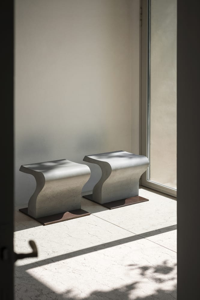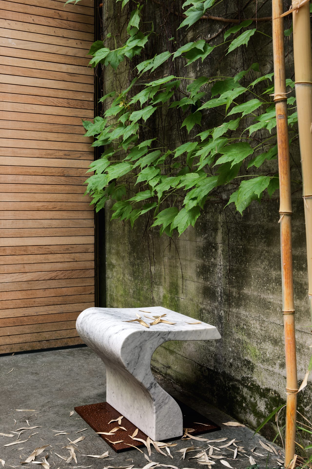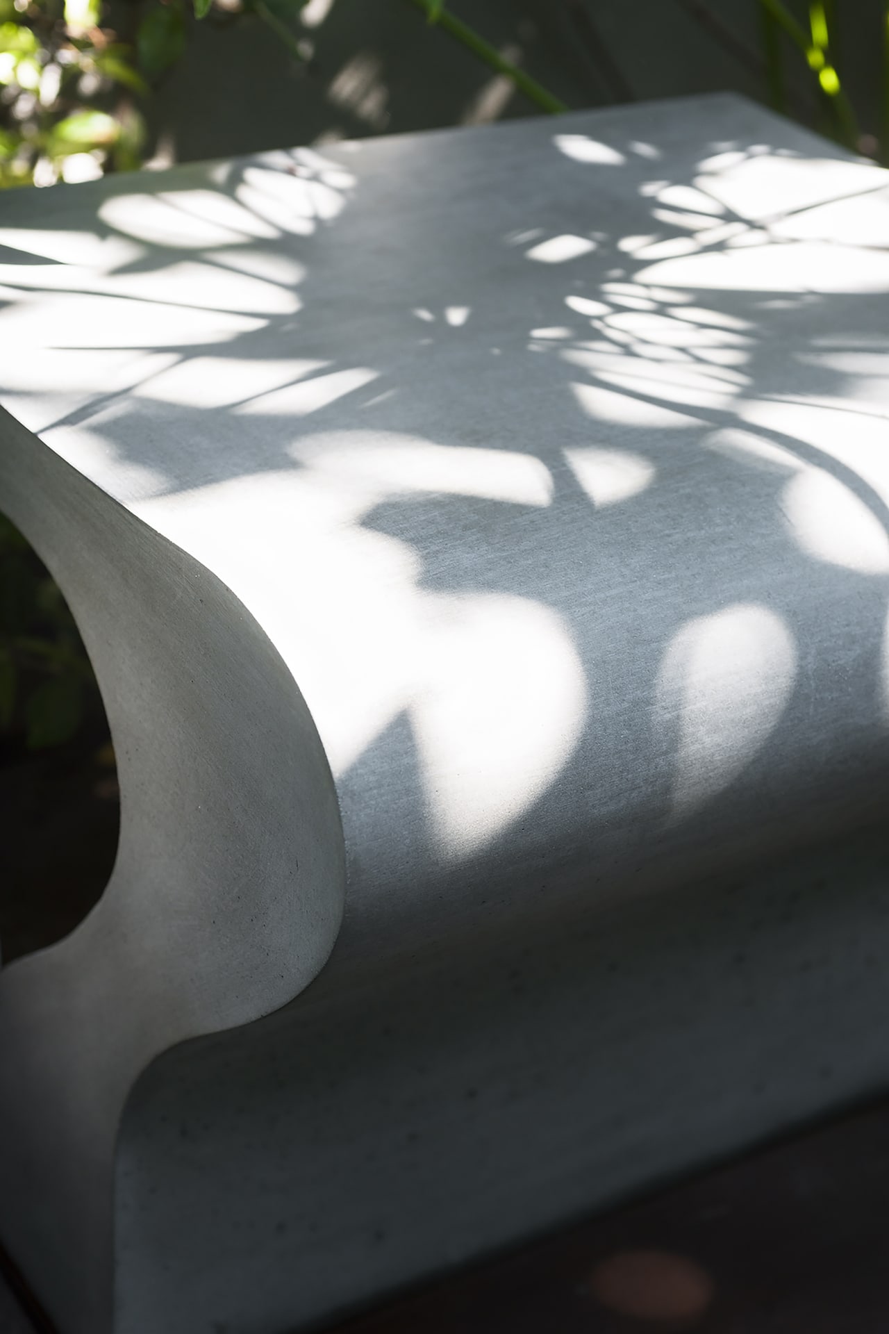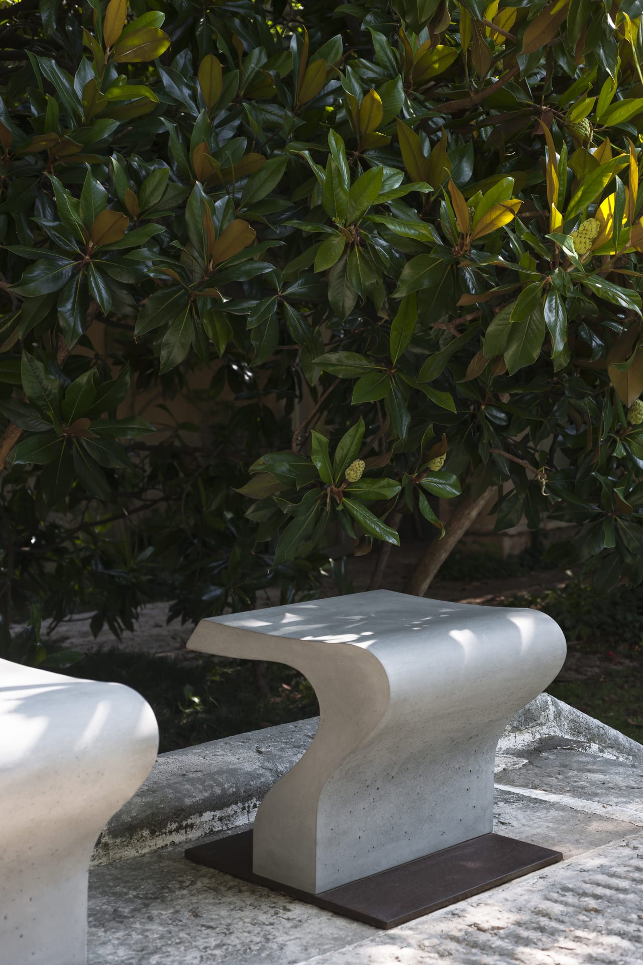 Marble seat suitable for indoor or outdoor use, made from white Carrara, black Marquina marble or in fiber reinforced concrete with oxidized steel support. A sculpture for sitting on with obvious sculptural, sinuous and flowing lines, seemingly in contrast with the hardness and staticity of the stone it is made of. A chair designed with a cantilever seat supported by a central stand with sinuous and flowing lines, seemingly in contrast with the hardness and staticness of the stone it is made of. A carefully gauged construction, whose complexity evokes certain studies by Escher. The upper edge of the seat coincides with the lower edge so that the monolithic sections of “Clizia” chairs are made out of the same block of marble in one single cut performed by numerically controlled machines, simultaneously creating two chairs, optimising the material by reducing waste to a minimum. Clizia is now available in concrete, in addition to the original, marble version.