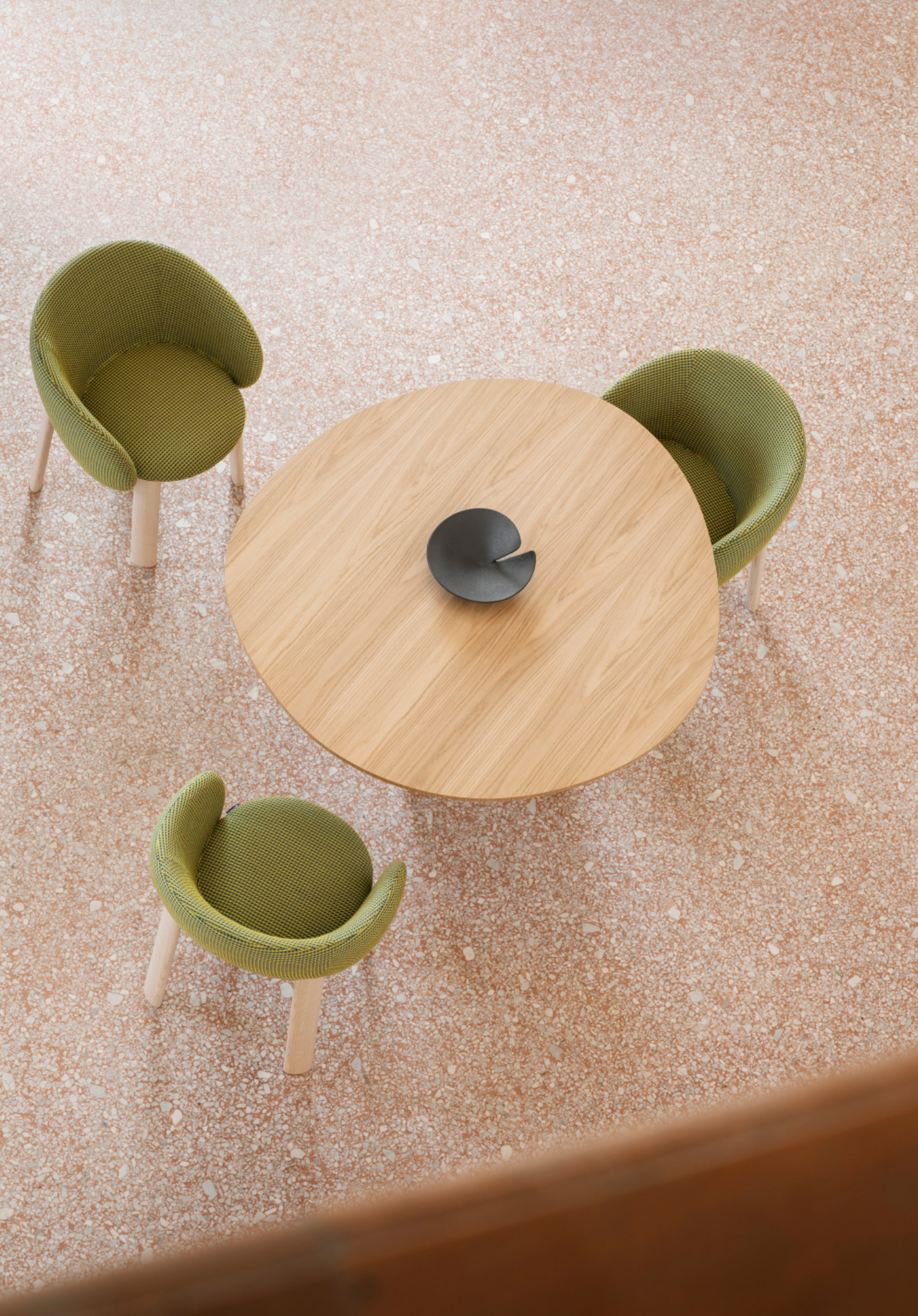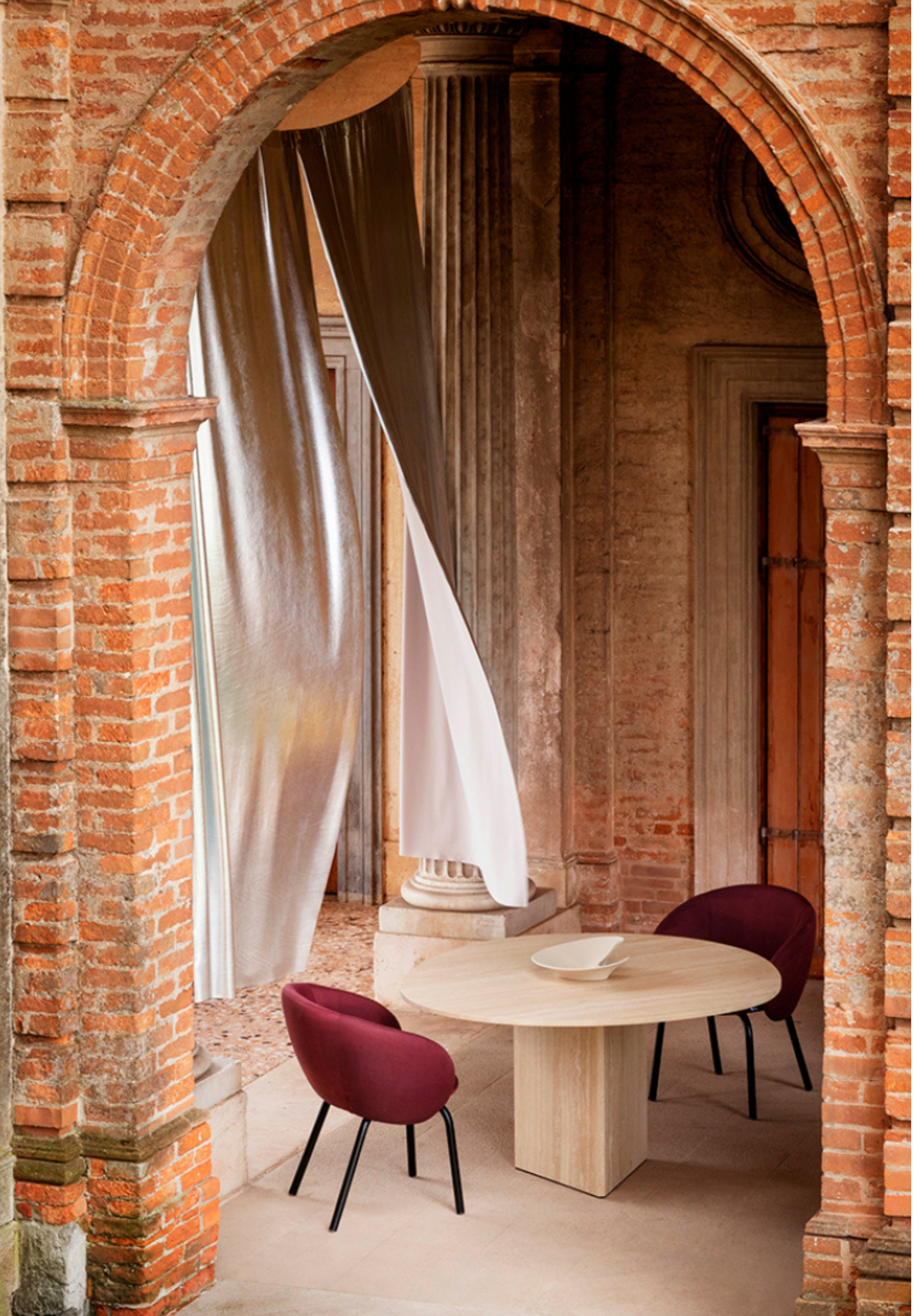Created as a tribute to Roman tradition, Albio bears the echo of the stones that shaped the Eternal City. The irregular outline of the top recalls the smooth erosions of time, while the base, a perfectly defined geometric slab, evokes the solidity of ancient temples and arches. Its statuesque composition retains a timeless character, enhanced by a palette of finishes that highlights each of its facets. Albio is a dining table available with a top in natural Travertine, wood — Flamed Oak, Canaletto Walnut, Black Ash — lacquered finishes or porcelain stoneware, always paired with a triangular base in the same range of materials.