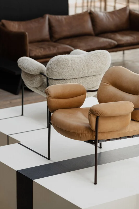Bollo is an armchair with a strong and welcoming character, designed by Andreas Engesvik for Fogia. In this version, it is offered with cognac-colored vintage leather upholstery and a black painted metal base(RAL 9005). The design draws inspiration from the tubular structures of lounge chairs from the 1950s and 1960s, reinterpreting them through a generous, contemporary form.