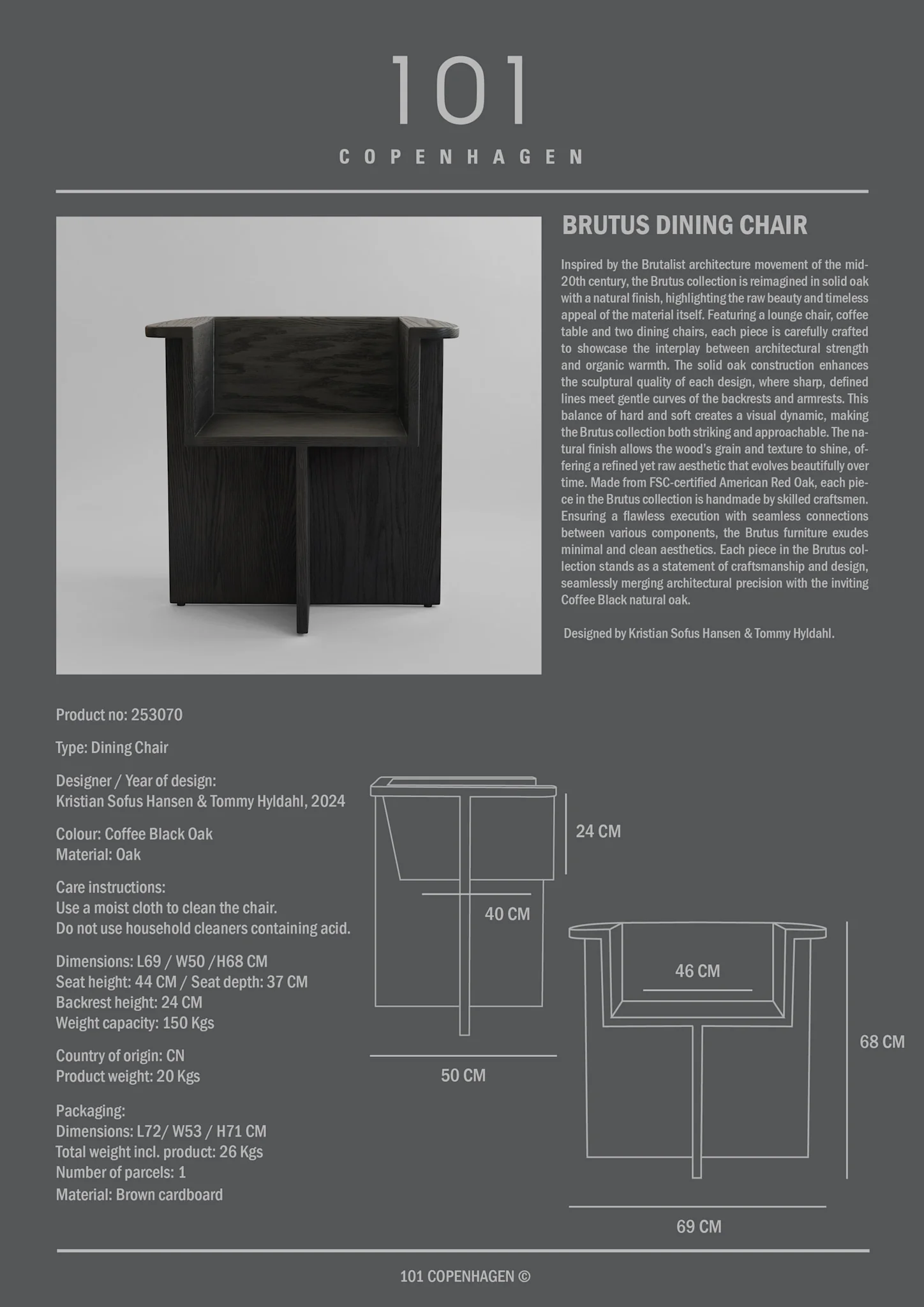 Inspired by the Brutalist architecture movement of the mid-20th century, the Brutus collection is reimagined in solid oak with a natural finish, highlighting the raw beauty and timeless appeal of the material itself. Featuring a lounge chair, coffee table and two dining chairs, each piece is carefully crafted to showcase the interplay between architectural strength and organic warmth. The solid oak construction enhances the sculptural quality of each design, where sharp, defined lines meet gentle curves of the backrests and armrests. This balance of hard and soft creates a visual dynamic, making the Brutus collection both striking and approachable. The natural finish allows the wood’s grain and texture to shine, offering a refined yet raw aesthetic that evolves beautifully over time. Made from FSC-certified American Red Oak, each piece in the Brutus collection is handmade by skilled craftsmen. Ensuring a flawless execution with seamless connections between various components, the Brutus furniture exudes minimal and clean aesthetics. Each piece in the Brutus collection stands as a statement of craftsmanship and design, seamlessly merging architectural precision with the inviting warmth of natural oak.Designed by Kristian Sofus Hansen & Tommy Hyldahl. Delivery in 5-15 days
