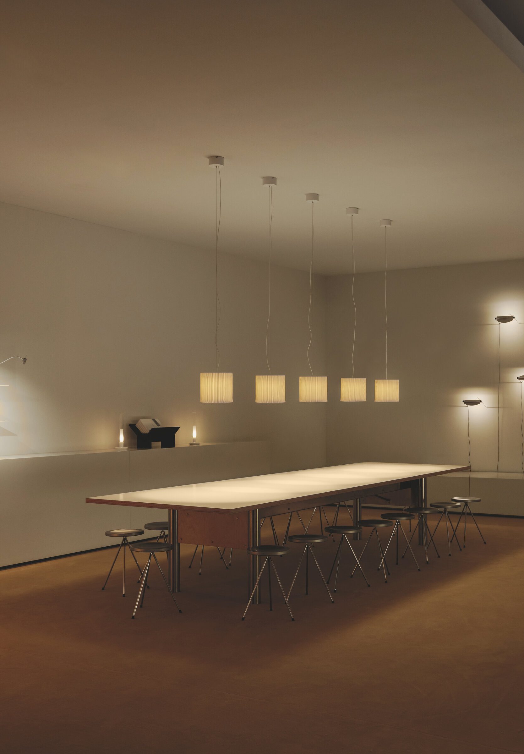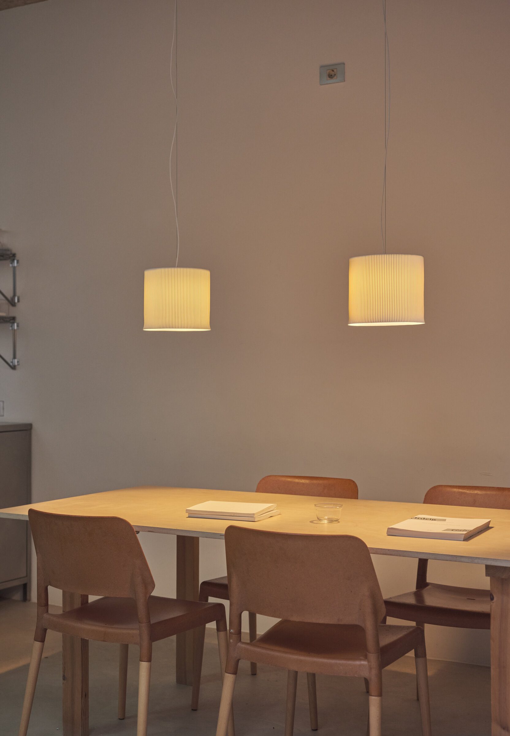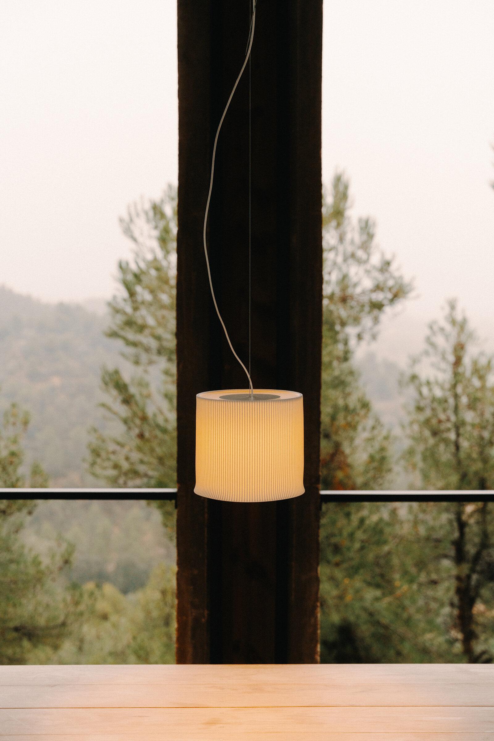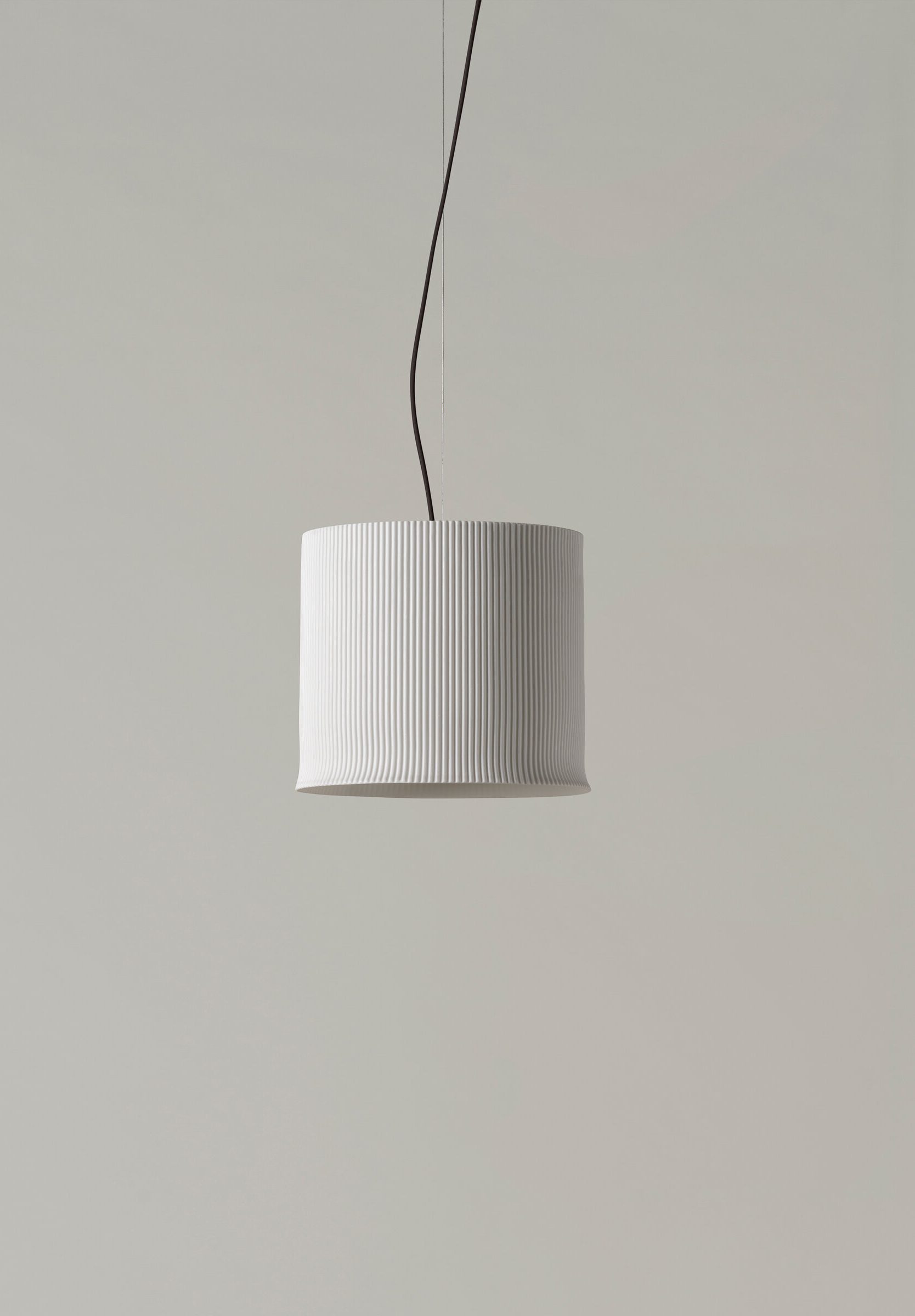 Cirio Pana reimagines the traditional long wax candle, a historic ritual object, through the delicate lens of porcelain. More powerful than that of its smaller counterpart, its luminous disc is encased in a shade as tall as it is wide, producing a light that is both focused and expansive. With unique nuances in every pieces, its grooved texture recalls the softness and depth of corduroy (pana in Spanish), traced by fine vertical ridges.